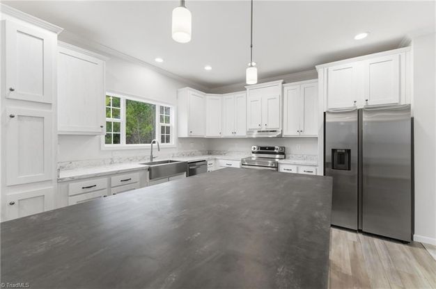 Charming Ranch located on .62-acre lot. This home offers 3 bedrooms, 2 baths, open floor plan with spacious living room, kitchen and dining areas. Kitchen features a large island, lots of cabinet storage, farmhouse sink, cabinet pantry storage and all SS appliances. Primary bedroom features walk-in closet with storage cabinet and primary bathroom with double vanities and large walk-in shower. Extra den is a great flex space for office, bonus or craft room to use as needed. Dedicated walk in laundry room. Crown molding, detail ceilings in living room and bonus den add extra charm and detail to this home. Private deck to enjoy level lot. No HOA. Country feel but minutes from shopping and restaurants in Kernersville. Schedule your showing today!