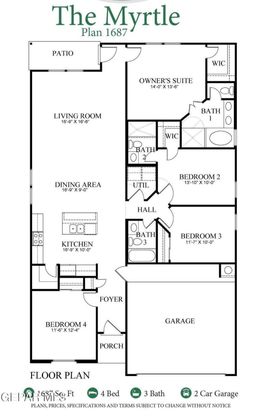 The Myrtle. A 1 Story, 4 Bedroom, 3 full bath home. Granite countertops in the kitchen. Appliance packages are available on select homes. Please contact for further information. 12' X 18' tile flooring, refrigerated air, double pane windows, front yard landscaping, insulated roll-up sectional garage door. This new home is energy efficient, pre wired for security system and includes a 10 year HOME of Texas warranty. All minor rooms are nicely sized and wired and blocked for ceiling fans. The master suite has a spacious walk-in closet and master bathroom with double sinks. The pictures are not of the actual home to be built, but will be the same floorplan and similar finishes.