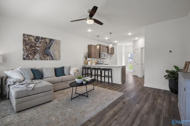 The Tyndall. THREE BEDROOMS and 3 FULL BATHS! One bedroom downstairs on the main w/full bath is perfect for guests or a home office. Upstairs you'll find a spacious, secluded primary suite w/walk-in closet & dual vanity. The 3rd bedroom is on the opposite side of the house & also has a walk-in closet & its own full bathroom! Includes quartz countertops, stainless steel appliances, & luxury plank flooring on the main level. Storage unit attached to back patio! Enjoy a low maintenance lifestyle as lawn care is a complimentary service. These introductory priced homes are the most affordable in HSV Metro. Photos/videos of a similar home, options may not be included in price.