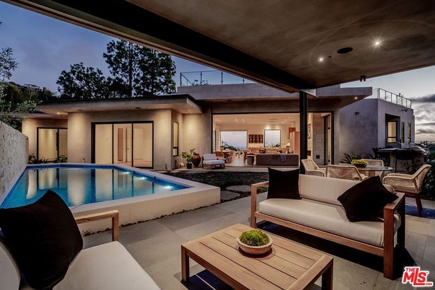 One of the first newly constructed homes available in Pacific Palisades, this brand-new organic-modern ocean-view pool home sits on a prominent 16,927 sq ft corner parcel, offering exceptional privacy and sweeping Pacific Ocean views. The residence features 4 bedrooms with en suite baths, plus an additional powder room, soaring 12-foot ceilings, and expansive walls of glass with pocketing aluminum sliding doors that create seamless indoor-outdoor living. Designed with an organic, modern coastal aesthetic, the home blends clean architectural lines with warm, natural materials, including wide-plank European oak floors, custom rift oak cabinetry, natural stone finishes, and Taj Mahal quartzite countertops. The chef's kitchen features Thermador appliances and a pass-through pocket window opening to an outdoor bar and BBQ area, ideal for entertaining. An expansive rooftop deck captures panoramic ocean and sunset views with garden areas, utilities, and preparation for speakers and a fire feature. The main living spaces open to multiple outdoor areas, including three front patios, a covered rear patio with a fire pit, integrated speakers and TV wiring, and a resort-style pool and spa with mosaic detailing, water features, and smart controls. A private patio off one of the bedrooms offers additional outdoor living space. Additional features include a two-car garage with an EV charger and epoxy flooring, a laundry room with a sink and storage, and a fully integrated smart home system with whole-home audio, surround sound, security cameras, an alarm system, WiFi boosters, and smart entry. The home is built with extensive fire-conscious design elements, including reinforced exterior construction, dual-glazed tempered windows, interior and exterior fire sprinklers, rooftop sprinklers supplied by a pool reservoir backup, non-combustible roof deck pavers, and low-fire-risk landscaping with more than 30 olive trees. Constructed and designed by Builder Direct Design Build, a respected Palisades family-owned firm known for exceptional craftsmanship.