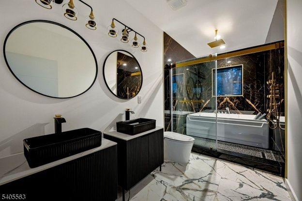 This one-of-a-kind, bold statement home is architecturally unique, blending modern design, craftsmanship & luxury. Set on an exceptionally large, flat lot in the prestigious Deerfield section, offering sweeping sunset views from most windows throughout the home. A custom Mahogany & White Oak entry door opens to a dramatic foyer with natural black stone tile, glass walls & designer lighting. The striking 18-foot great room features wide-plank 7 white oak floors, a floor-to-ceiling fireplace with gold accents, recessed lighting & custom black Andersen 400 windows. Expansive glass sliders lead to an oversized Trex deck with fiberglass waterproofing designed to support a hot tub, overlooking a pool-ready backyard. The chef's kitchen offers custom Woodmark cabinetry, a quartz center island with dual-sided seating, ZLINE black Autograph Edition SS appliances, gold hardware & metal backsplash. With 3 full levels of above-ground living, the home offers exceptional flexibility. 8 bedrooms include an upper-level primary suite with a spa-style wet room, two-person jacuzzi, body-spray shower & floating vanities. The bright walk-out lower level is ideal for work-from-home living, featuring luxury vinyl flooring, laundry, private bedrooms, two separate exterior entrances, and a covered patio below. Exterior highlights include a custom flat roof, professional landscaping with 80 Green Giant arborvitae, 2 new driveways, an oversized garage with polyaspartic flooring & smart-home features.