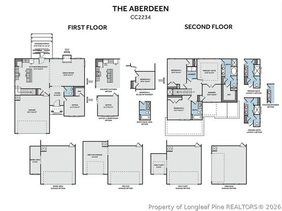 The Aberdeen home plan is a 2-story home that offers several options to fit the need of any family! This home features a spacious great room that flows seamlessly into the eat-in kitchen for a warm, open layout. Off the foyer, a flexible home office with a walk-in closet can serve as a bedroom, while a nearby half bath adds convenience. The kitchen includes an island, "Azul Platino" granite countertops, white shaker cabinets, horizontal picket ceramic tile backsplash, a corner pantry, a breakfast area with rear porch access, and stainless steel appliances including a microwave, dishwasher, and smooth top range. The private primary suite showcases French door access to an adjoining nursery, and an en-suite bath featuring a dual quartz sink vanity, walk-in shower, private water closet, linen closet, and walk-in closet. Upstairs, two additional bedrooms share hall access to a laundry room and a full bathroom with a vanity and tub/shower combo. LVP flooring runs throughout the first-floor main living areas. Exterior highlights include low-maintenance vinyl siding with board and batten accents, dimensional roof shingles, and a front door painted in SW "Cyberspace" with smart keypad entry. This Energy Plus certified home includes a two-car garage, fiber optic internet availability, and is backed by a 1-2-10-year builder in-house warranty.