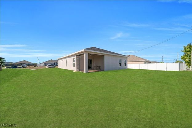 Beautiful brand-new construction home offering 4 bedrooms, 2 bathrooms, and a spacious 3-car garage, competitively priced as one of the best values in Cape Coral. This property features an open and functional layout with abundant natural light, spacious walk-in closets, and a dedicated laundry room with washer and dryer included. The modern kitchen is designed for both style and functionality, showcasing granite countertops, stainless steel appliances, 42-inch cabinets, and a large center island-perfect for entertaining and everyday living. Both bathrooms include granite countertops, dual vanities, and tiled walk-in showers. Additional highlights include impact-resistant windows and doors, reverse osmosis water system throughout the entire home, and a 2-10 builder warranty for added peace of mind. Situated in a quiet and growing area, this home offers convenient access to schools, shopping, dining, and major roads. Not located in a flood zone and no HOA fees.
