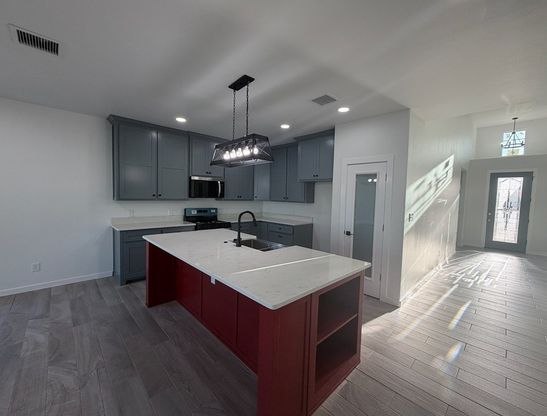 New construction home featuring 4 bedrooms and 2 bathrooms with an open-concept living, dining, and kitchen layout. The kitchen offers modern finishes and ample cabinet space. The primary suite includes a double-sink vanity and private bath. Additional highlights include a tankless water heater, contemporary fixtures, and a covered patio.