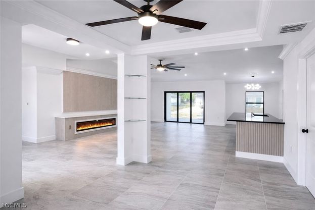STUNNING NEW CONSTRUCTION HOME on a quiet dead-end street. Featuring 4 bedrooms + den, this home offers space for living, working, and hosting. Porcelain floors throughout, modern fans, and stylish lighting. Cozy living room with fireplace. The kitchen is a chef's dream with a large island, stainless steel appliances, pot filler, and a touchless motion-sensor range hood-activate it with a simple hand wave. Smart lighting system allows you to change from cool white to warm light with a double tap on the wall switch, giving you the perfect ambiance anytime. Impact doors and windows for safety and efficiency. The primary suite features a spa-style bath with soaking tub, separate shower, hydromassage, and European wall-mounted toilet. 2-car garage, sprinkler system, NO HOA, and a private low-traffic location. Located in Lehigh Acres, minutes from Lee Blvd and Sunshine Blvd, with easy access to Fort Myers and Interstate 75. Just a few blocks from Key Food, Aldi and Walmart Supermarkets. **Some photos are virtually staged; finishes may vary**