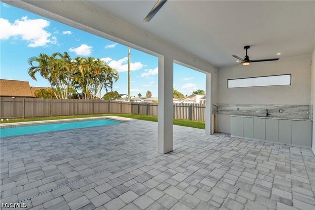 Welcome to this stunning newly built home in the heart of Cape Coral, designed with a perfect blend of modern elegance and everyday functionality. From the moment you arrive, you'll be impressed by the clean architectural lines, oversized driveway, and grand entryway with soaring ceilings. Step inside to discover a bright, open-concept layout featuring high-end porcelain tile flooring throughout, tray ceilings, and an abundance of natural light. The spacious living area flows seamlessly into a designer kitchen equipped with: Sleek white cabinetry Quartz countertops Stainless steel appliances Custom backsplash Large center island perfect for entertaining The home offers a split-bedroom floor plan for maximum privacy, with generously sized bedrooms and a luxurious primary suite designed for comfort and relaxation. Enjoy Florida living at its finest with large sliding glass doors leading to your backyard Pool Oasis.City Water and Sewer Assessments Paid
