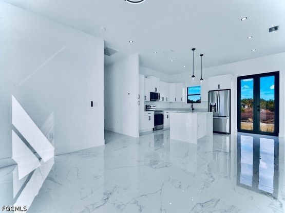 Welcome to this MAGNIFICENT MODERN 3/3 Nestled away on a quiet DEAD END cul-de-sac just minutes to all major amenities & a quick commute to Fort Myers. These GRAND elevations with high Volume ceilings & 8FT IMPACT windows & doors spotlights attractive OVERSIZED porcelain tile throughout, a welcoming breakfast bar with rainfall QUARTZ countertops, soft-close shaker cabinets, high end LG STAINLESS STEEL appliances, and IMPRESSIVE frame-less glass TILED showers. This open floor plan with GREAT room highlights Premium fixtures with remotes, Pendant & recessed lighting, walk-in closet & Desirable closet organizers, enticing QUARTZ countertops in baths, and an open back patio with Potential Pool bath or efficiency access. It also features a HIGH EFFICIENCY washer & dryer under air, epoxy flooring in garage, custom mirrors, entertainment pre-wired, nicely tiled front entrance and a walkway around to garage. Schedule your private showing today!