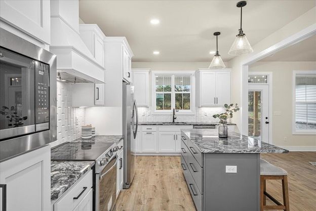The Oakmont is a beautifully designed single-story home that blends comfort, functionality, and modern living. Thoughtfully laid out with a desirable split-bedroom design, this home offers privacy for the primary suite while easily accommodating family and guests. At the heart of the home, the open-concept kitchen, great room, and dining area create an inviting space ideal for both everyday living and entertaining. The kitchen features a central island, ample counter space, and a walk-in pantry, flowing seamlessly into the spacious great room and out to the covered concrete patio that is perfect for effortless indoor-outdoor living. The private primary suite is tucked away and includes a generous walk-in closet and a well-appointed bath with dual vanities, a soaking tub, and a separate walk-in shower. Three additional bedrooms are located on the opposite wing of the home and share a full bath with double sinks, making this layout ideal for families, guests, or flexible living needs. Practical touches enhance everyday convenience, including a dedicated laundry room, drop zone/mud area, extra storage, and direct access from the oversized garage. A welcoming covered front porch adds to the home's charming curb appeal. Designed for comfort and livability, the Oakmont offers flexible spaces, smart separation of living areas, and timeless appeal and all situated on a spacious one-acre lot, providing room to relax, entertain, and enjoy the outdoors.