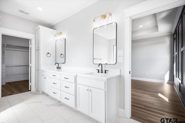 This beautiful brand new 2025 home is now available; located in a newer community off CR 1100 outside city limits in Southwest Tyler. With easy access to Hwy 155; this property is situated in a great area to make your morning commute easy! Enjoy the refreshing neutral brick and hardie-board exterior that this corner lot home has to offer. Once inside, notice the warm luxury vinyl plank flooring and beautiful fixtures that create a clean and fresh atmosphere. The open concept design which combines the kitchen, living and dining area is highly functional and offers convenient ease of use. Features include prestigious tall ceilings, wainscotting, a brick fireplace, white built in cabinetry and sturdy wood shelving for all your trinkets and pictures. The primary bedroom is wonderful and has plenty of room for a sitting area and convenient access to its en-suite bath equipped with a soaking tub, glass walk in shower with rainfall shower head, dual sinks and a large walk in closet with shelving, rods and drawers already installed! The other two bedrooms are spacious and feature ceiling fans and closets; everything needed for privacy. Modern flooring is laid in the laundry room adding character to this home, the built in cabinetry, and hutch-mud area is sure to be well used. The home is located on a 1/2 acre corner lot which offers easy backyard access and the neighborhood is peaceful. This is a wonderful spot with plenty of room to spread out but also still enjoy the conveniences Tyler offers. This home is move in ready; all it needs is you!
