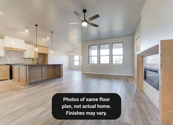 ASK US ABOUT OUR INCENTIVES! This home blends effortless elegance with practical comfort from the moment you step onto the covered front porch. Inside, the open concept living area centers around a designer fireplace and flows into a gourmet kitchen with a large island, custom cabinetry, high-end finishes, and a spacious walk-in pantry. The private primary suite features soft natural light, a ceiling fan, dual vanities, a soaking tub, a walk-in shower, ample linen storage, and a generous closet. Secondary bedrooms are well-appointed, and the guest bath includes a tiled tub-and-shower combo with elevated finishes. The large covered patio sets the stage for quiet mornings or evening gatherings. Backed by a 10-year structural warranty and additional manufacturer warranties, this home offers both style and peace of mind. Mustang Park adds a pool, workout center, greenbelts, and walkability to school, creating a lifestyle that's as convenient as it is inviting.