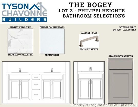 The Bogey floor plan by Tyson Chavonne Builders offers the perfect balance of thoughtful design and everyday livability, set on a homesite with a preserved tree line along the back for a more natural, private backdrop. Inside, 9' ceilings and an open-concept layout create a bright, connected living space where the kitchen, casual dining area, and family room all flow together seamlessly. Whether you're hosting or just enjoying a quiet night in, the layout keeps everyone within sight and part of the moment. The kitchen stands out as a true focal point, featuring crisp white cabinetry, a Teramoda Sky subway tile backsplash, and an abundance of counter space and storage. Soft-closing cabinets and drawers add a refined touch, while the overall design balances style and function in a way that feels both elevated and practical. With 3 bedrooms and 2 full bathrooms across 1,643 square feet, the layout is efficient without feeling tight. The owner's suite is positioned for privacy, while the secondary bedrooms offer flexibility for guests, a home office, or additional living needs. This home also features a shared driveway with Lot 2, creating an extended approach that adds depth to the homesite while maintaining a clean, streamlined look. If you're looking for new construction that blends modern finishes, functional design, and a setting that still feels connected to nature, the Bogey delivers a refreshing alternative to the typical build.