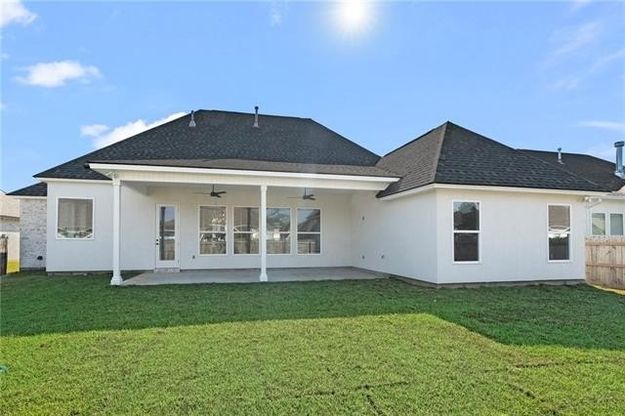 Another fabulous new BMI Construction home in The Oaks of Guste Island! This home offers an impressive experience from the moment you enter, with wood floors and a custom tile inlay design in the foyer. It features 4 bdrms/2 full baths, with no carpet throughout. The open floor plan includes a spectacular kitchen with a large island, vertical subway tile backsplash, stainless steel appliances, and a farm sink perfectly positioned in the corner, offering views of the rear yard through two plate glass windows. A convenient walk-in pantry completes the kitchen. The den boasts a tiled fireplace with a beam mantel, creating a cozy focal point. The gorgeous primary suite features a tray ceiling in the bedroom and a spa-like bath with a zero-entry shower and a stand-alone tub, dual vanities, and a spacious walk-in closet. The second bath also includes dual vanities. Additional features include a mudroom area off the garage entrance and a large covered patio with two ceiling fans, overlooking a fenced backyard. The home is located in Flood Zone "C" and is located in an excellent school district. Subdivision amenities offer a junior Olympic-sized pool, a clubhouse, a soccer/baseball field, and walking paths. This home truly shows exceptionally well and is ready to impress!