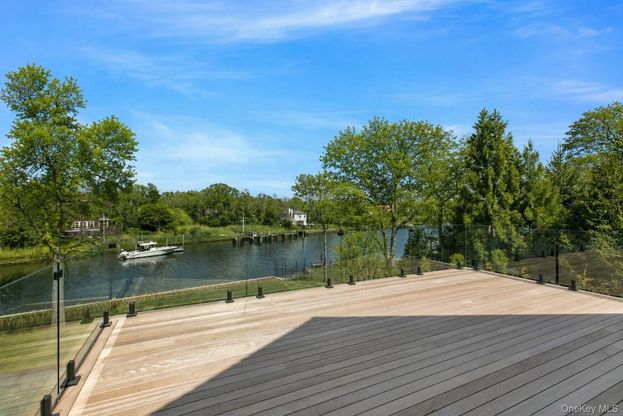 Positioned on a prime stretch of waterfront in Quogue, this newly constructed residence was expertly built by Summerhouse Builders, a Hamptons based luxury design build firm. Offering a seamless blend of modern coastal design, superior craftsmanship, and resort style living across three impeccably finished levels. A welcoming first floor foyer introduces herringbone flooring and oversized shiplap detailing, setting a refined tone that continues throughout. Ten inch engineered white oak floors lead to a formal dining room with coffered ceilings and into a sun filled great room that captures stunning water views while opening to the rear patio and pool. A sophisticated den features a dramatic double sided marble fireplace, while a junior primary suite with a marble en suite bath provides ideal guest accommodations. The chef's kitchen is a showpiece, appointed with quartzite countertops, a statement hood, Wolf double oven and range, pot filler, Sub Zero refrigerator, built in Wolf coffee system, Sharp microwave, butler's pantry, floating white oak shelving, and a generous center island. A mudroom, powder room, and epoxy finished two car garage complete the main level. Upstairs, the primary suite is a private retreat with a gas fireplace, dual walk in closets with custom built ins, and a spa quality bath featuring heated marble floors, soaking tub, and steam shower. A mahogany decked balcony overlooks the water, while additional guest suites offer en-suite baths and refined finishes. A floating glass staircase and elevator connect all levels. The finished lower level, which is rarely achieved on waterfront properties, is designed for ultimate lifestyle and entertaining, featuring 10 foot ceilings with a theater, gym, sauna, wine room, wet bar, office, and guest accommodations. Outdoors, a gunite infinity edge pool with spa, screened porch, outdoor kitchen, and deep water dock complete this exceptional setting. Smart home systems, full security, and five zone climate control enhance the offering. Images may be digital renderings or virtually staged.