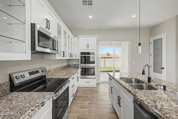 NEWLY BUILT home in Arizona City, ready to move in! Providing 4 beds, 2 baths, low-care landscape, and a 3-car garage w/extended driveway. The inviting interior features tons of natural light, a neutral palette, baseboards, and wood-look tile flooring t/out. Designed for everyday living & entertaining, the seamlessly flowing open layout is sure to impress! The gourmet kitchen boasts granite counters, white shaker cabinets, see-through cupboards, recessed & pendant lights, a pantry, an island w/breakfast bar, and SS appliances w/double wall ovens. Enter the main bedroom to find sliding doors to the back, a walk-in closet, & an ensuite w/dual granite vanity. You'll love the spacious backyard with artificial turf and a covered patio to relax! Near Arizona City Elementary School. Welcome home!