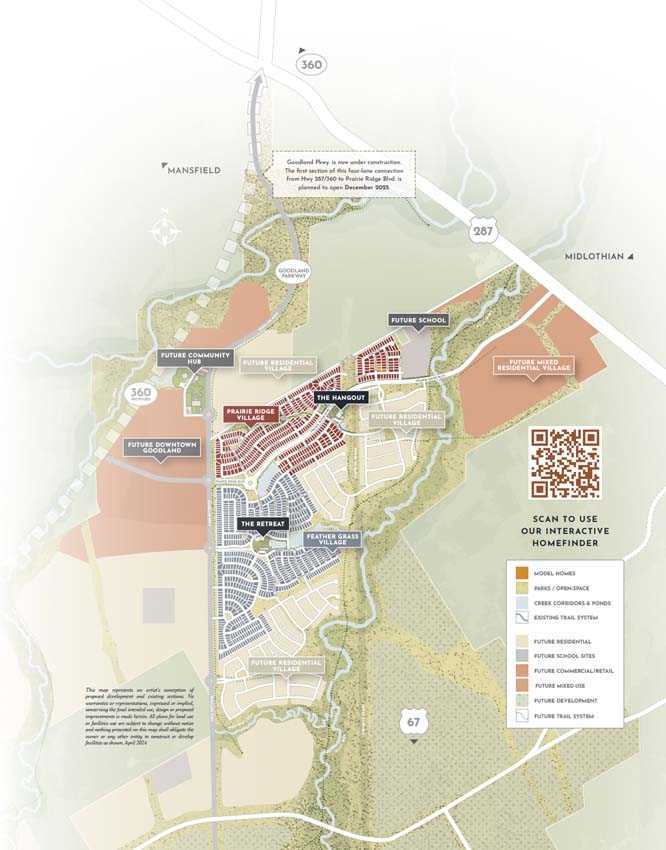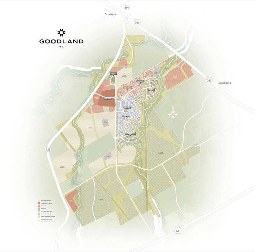 Welcome to Goodland, the new southern gateway of DFW! Nestled minutes from Mansfield, TX, this 5,000-acre master-planned community is where small-town spirit meets big fun and big nature. Soon, you can explore Downtown Goodland, where residents can grab a coffee and run errands just steps from their home. Dive into a rich array of amenities, including multiple centers with pools, 15mi of hike & bike trails, playgrounds, a stocked pond, and a dog park. At Goodland, nature and convenience are always close by!