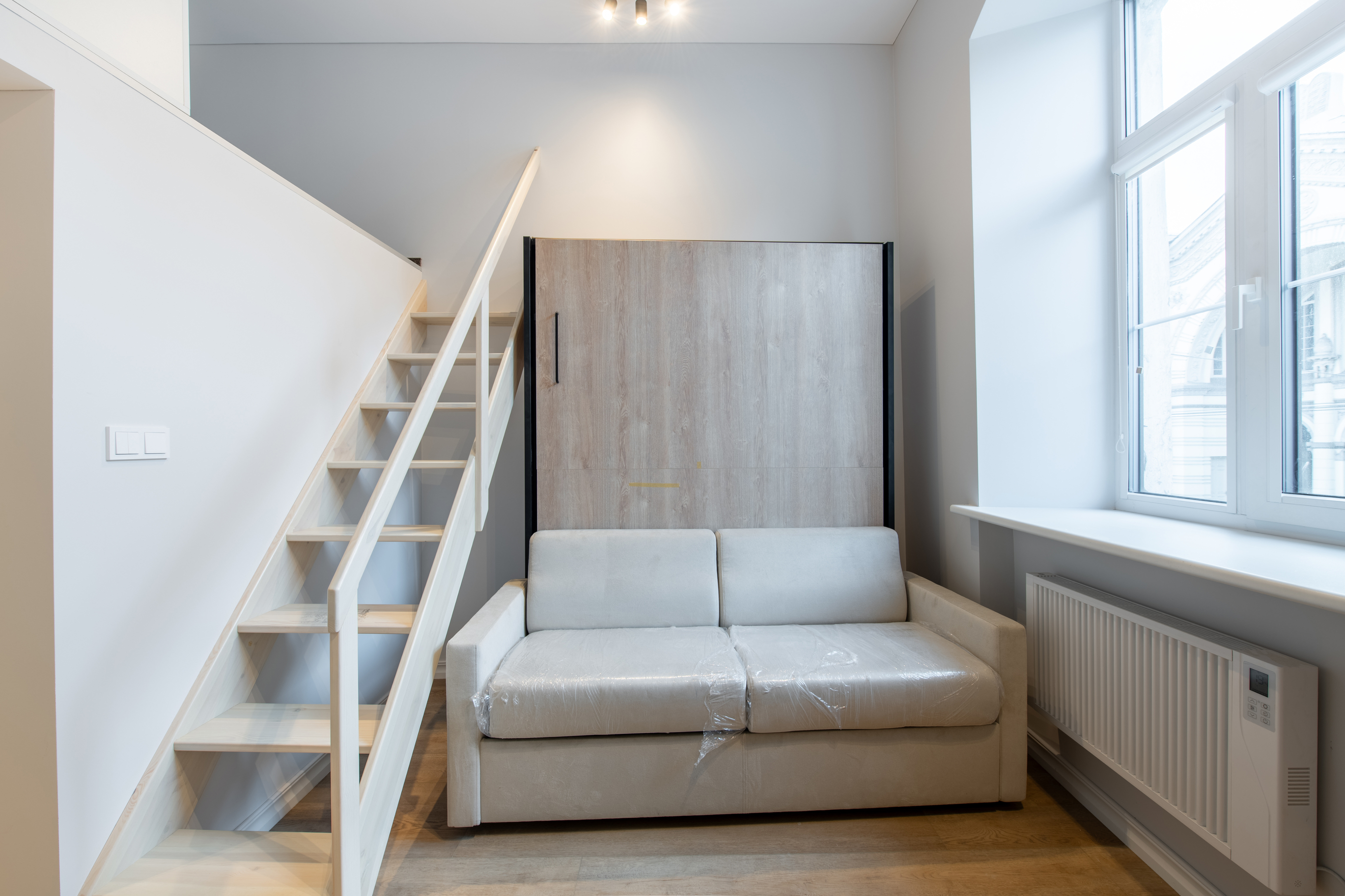“Space-efficient furniture like couches and beds with narrow frames and a smaller dining table and chairs make a room more comfortable,” says Conrad, “but you can add a mirror with a big frame or some big artwork. Minimalist furniture with a big painting looks great.”