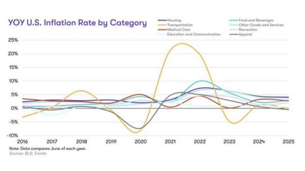 Leading in both YOY and cumulative growth since 2019, housing has continued to be a major driver of overall inflation. The graph illustrates that housing plays a disproportionately large role in the national inflation narrative, standing out as one of its most visible and persistent contributors.