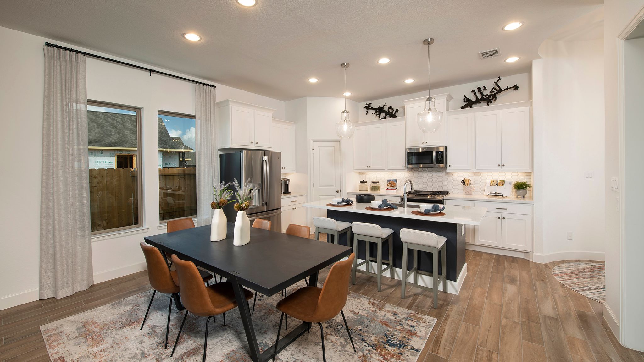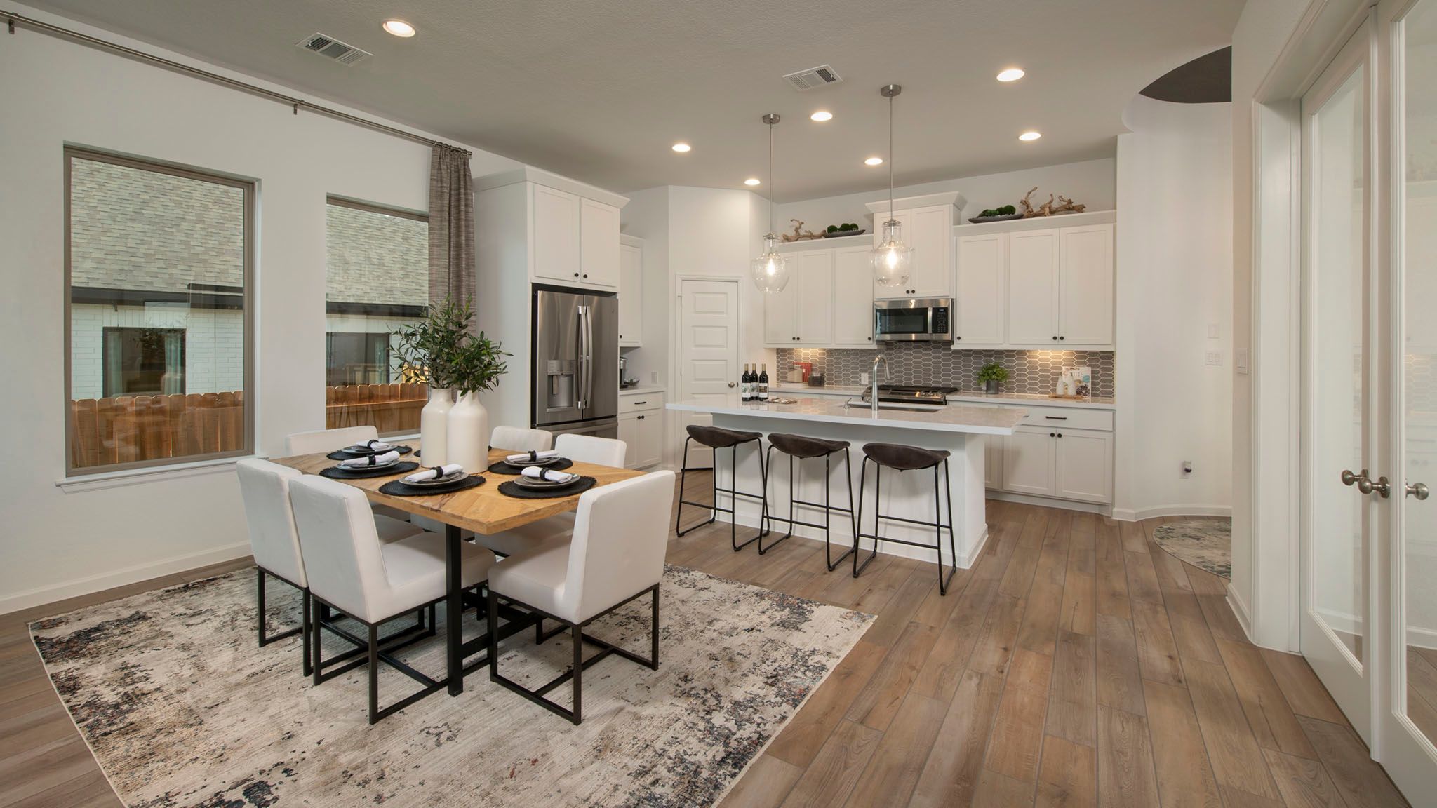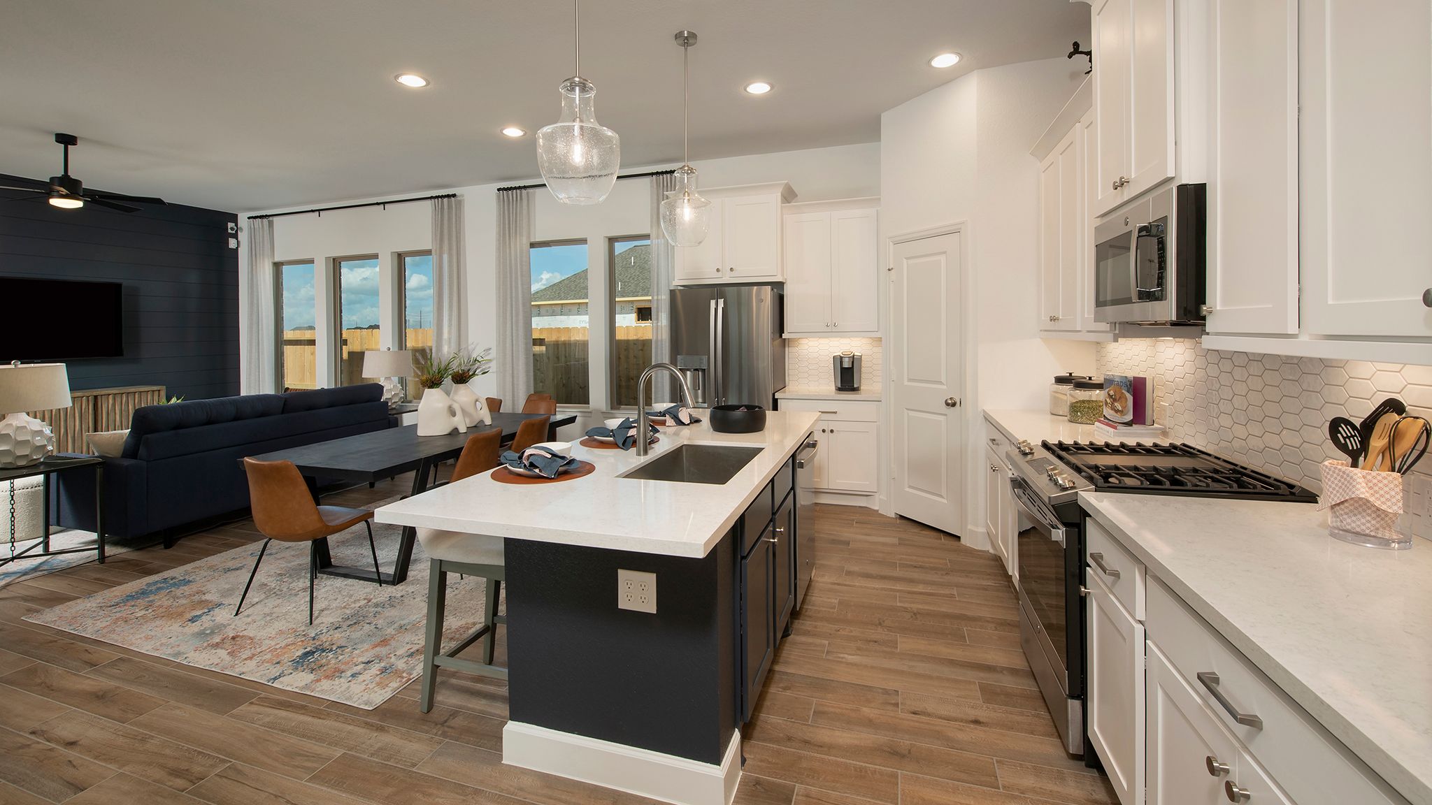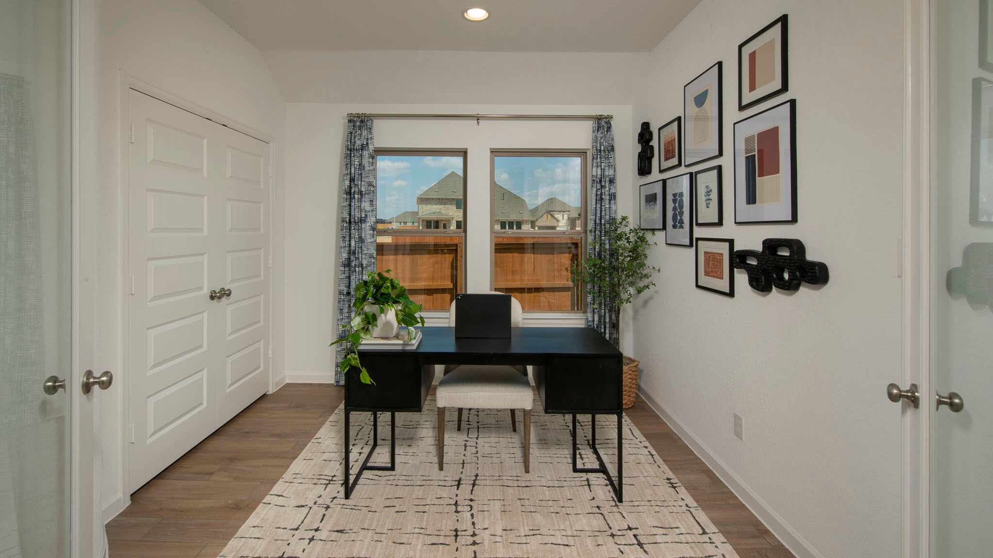 Entry leads past utility room and mud room. Home office with French door entry. Large family room opens to dining area. Kitchen hosts a corner walk-in pantry. Secluded primary suite. Primary bath features dual vanities, a walk-in closet, linen closet, and a large glass enclosed shower. Secondary bedrooms with walk-in closets. Covered backyard patio. Two-car garage. Representative Images. Features and specifications may vary by community.