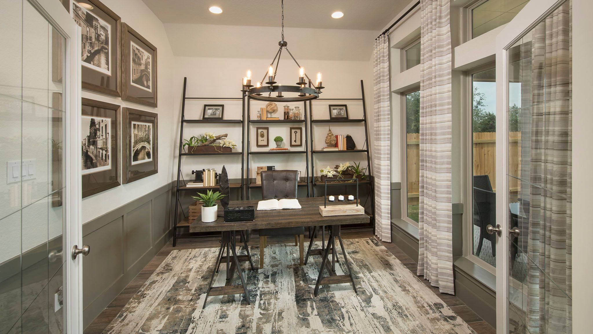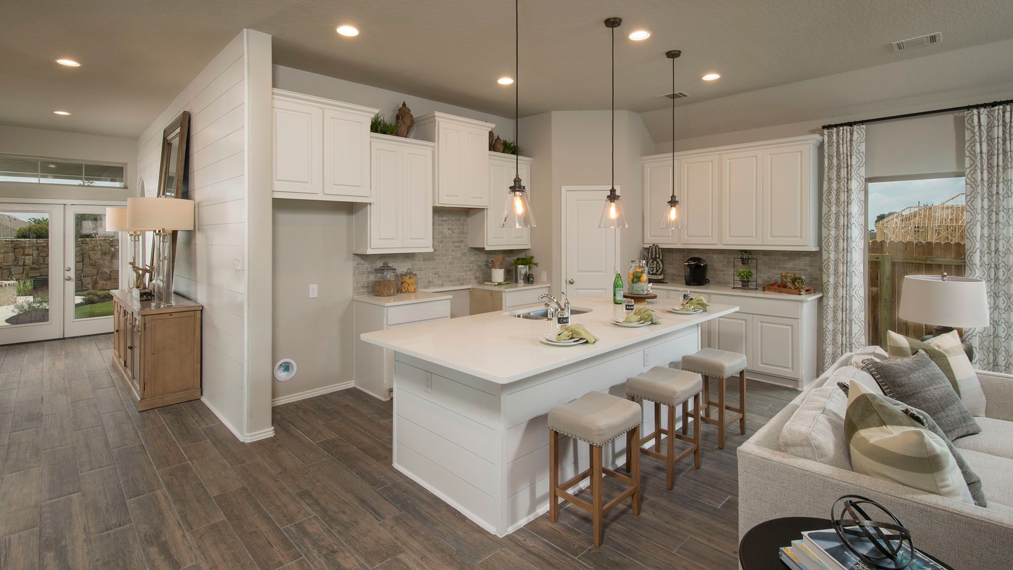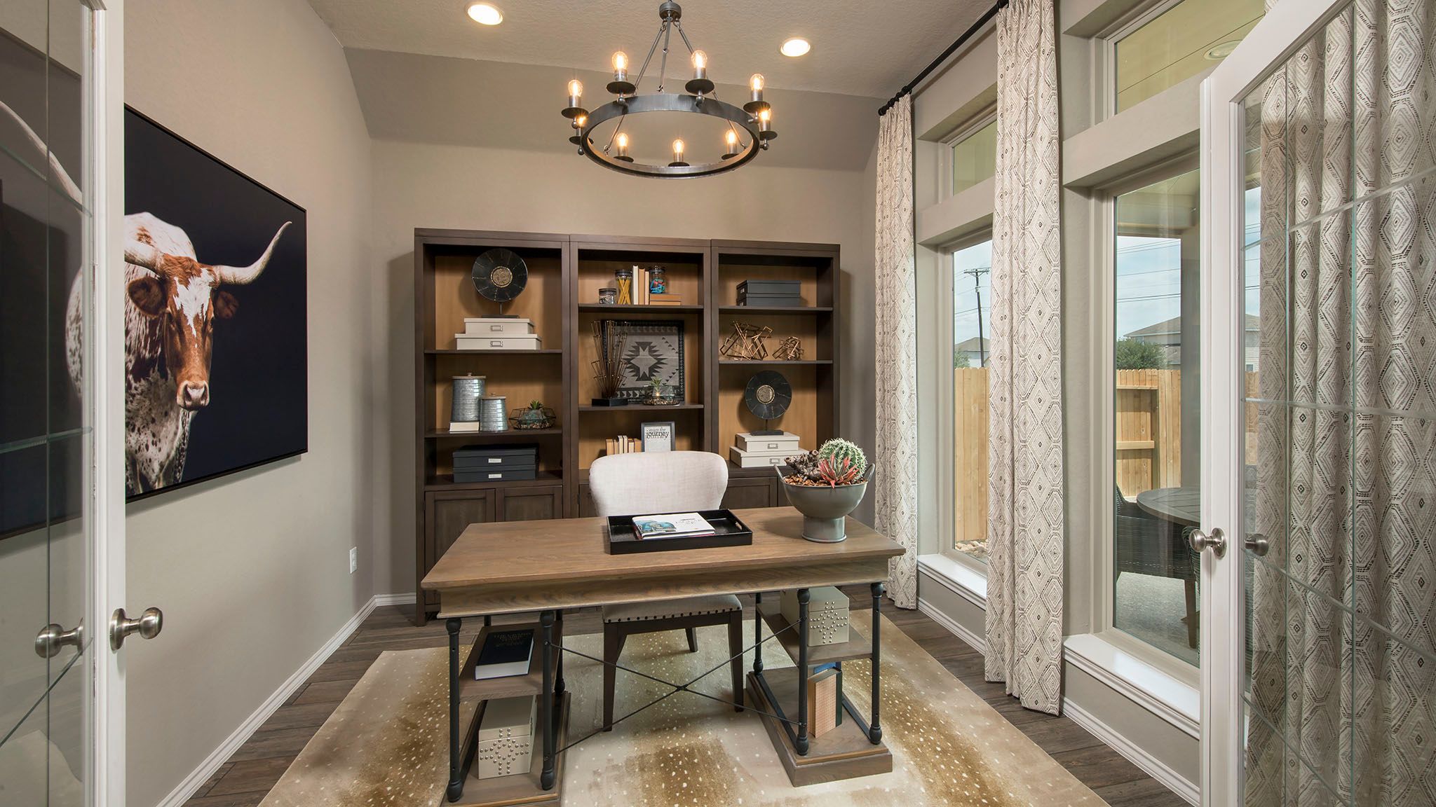 Entry leads to open family room with wall of windows. Kitchen features corner walk-in pantry and generous island with built-in seating space. Dining area set just across from kitchen. Primary suite includes bedroom with wall of windows. Double doors lead to primary bath with dual vanities, corner garden tub, separate glass-enclosed shower and walk-in closet. Home office with French doors set at back entrance. Secondary bedrooms feature walk-in closets. Covered backyard patio. Two-car garage. Representative Images. Features and specifications may vary by community.
