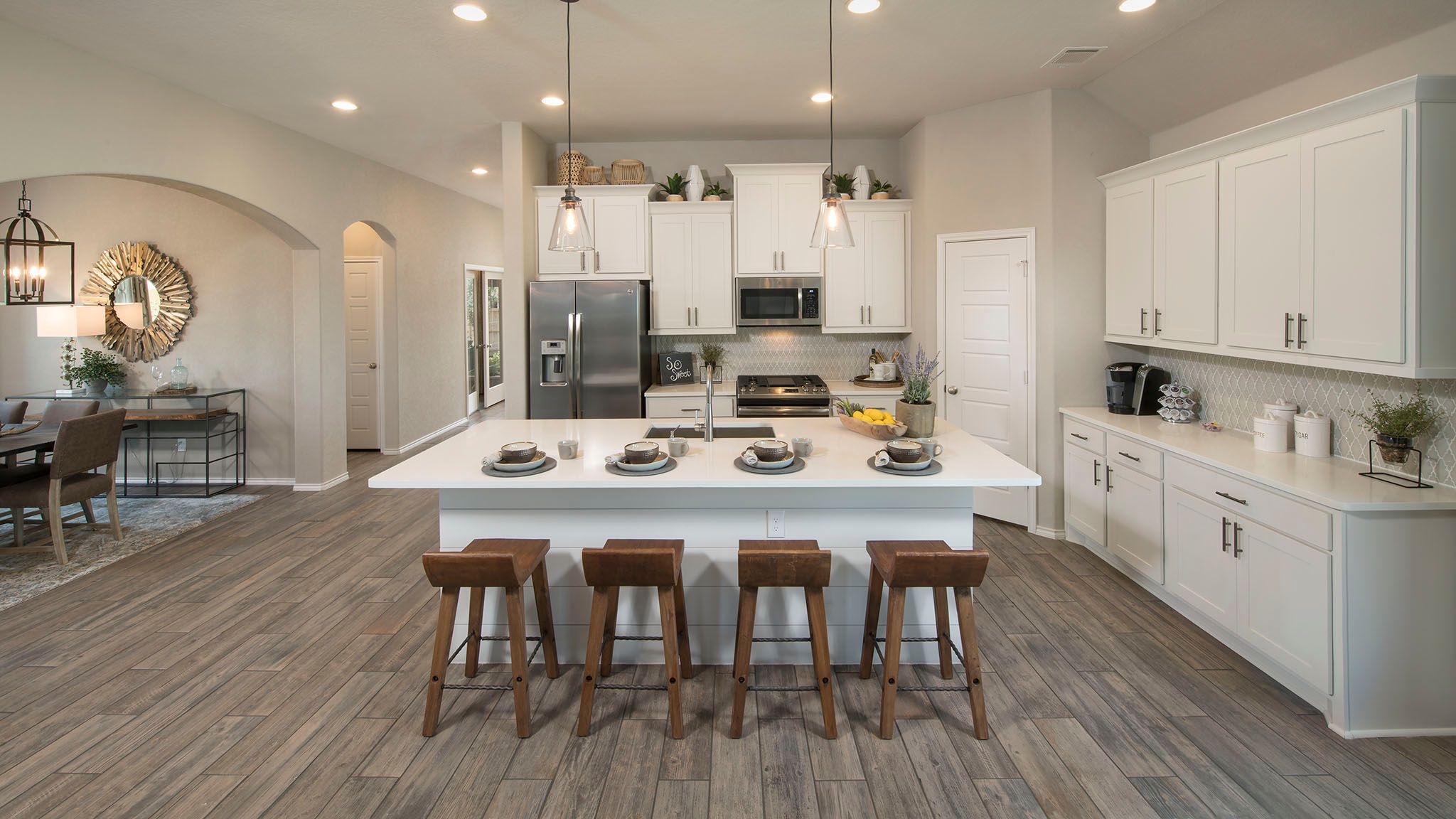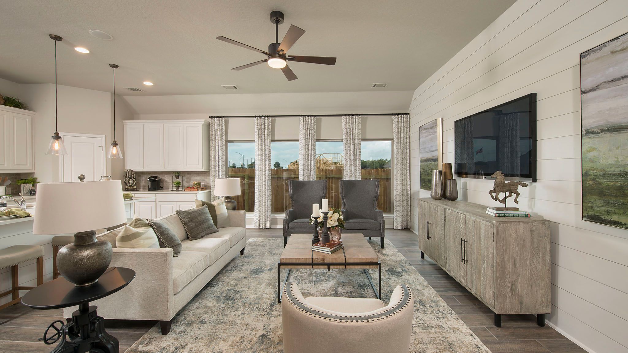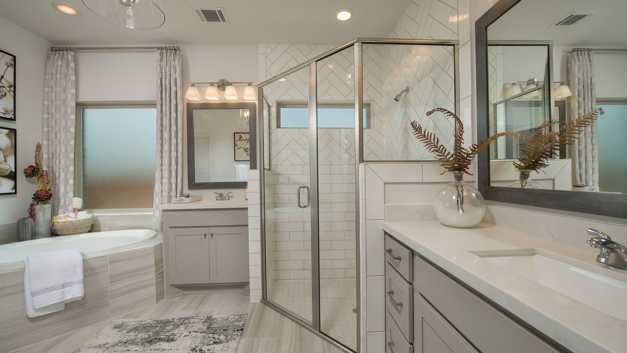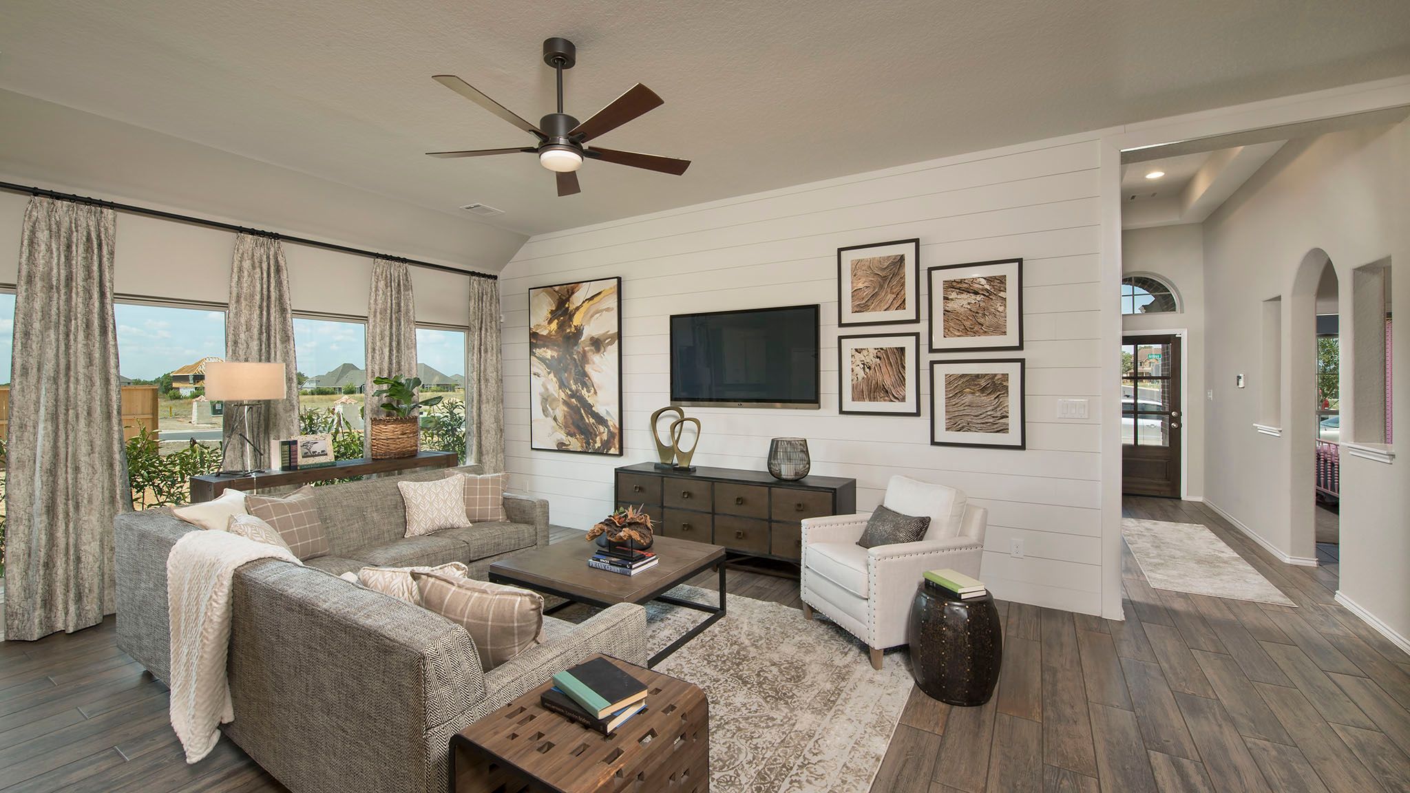 Entry leads to open family room with wall of windows. Kitchen features corner walk-in pantry and generous island with built-in seating space. Dining area set just across from kitchen. Primary suite includes bedroom with wall of windows. Double doors lead to primary bath with dual vanities, corner garden tub, separate glass-enclosed shower and walk-in closet. Home office with French doors set at back entrance. Secondary bedrooms feature walk-in closets. Covered backyard patio. Two-car garage. Representative Images. Features and specifications may vary by community.