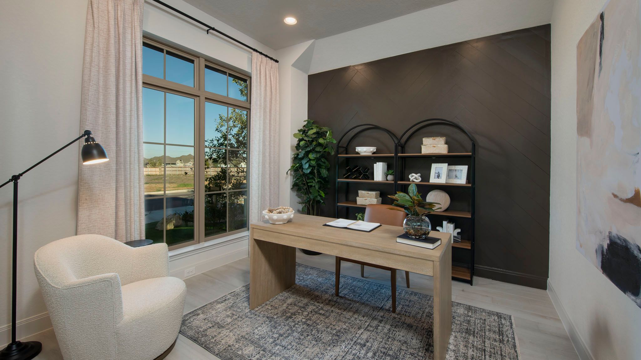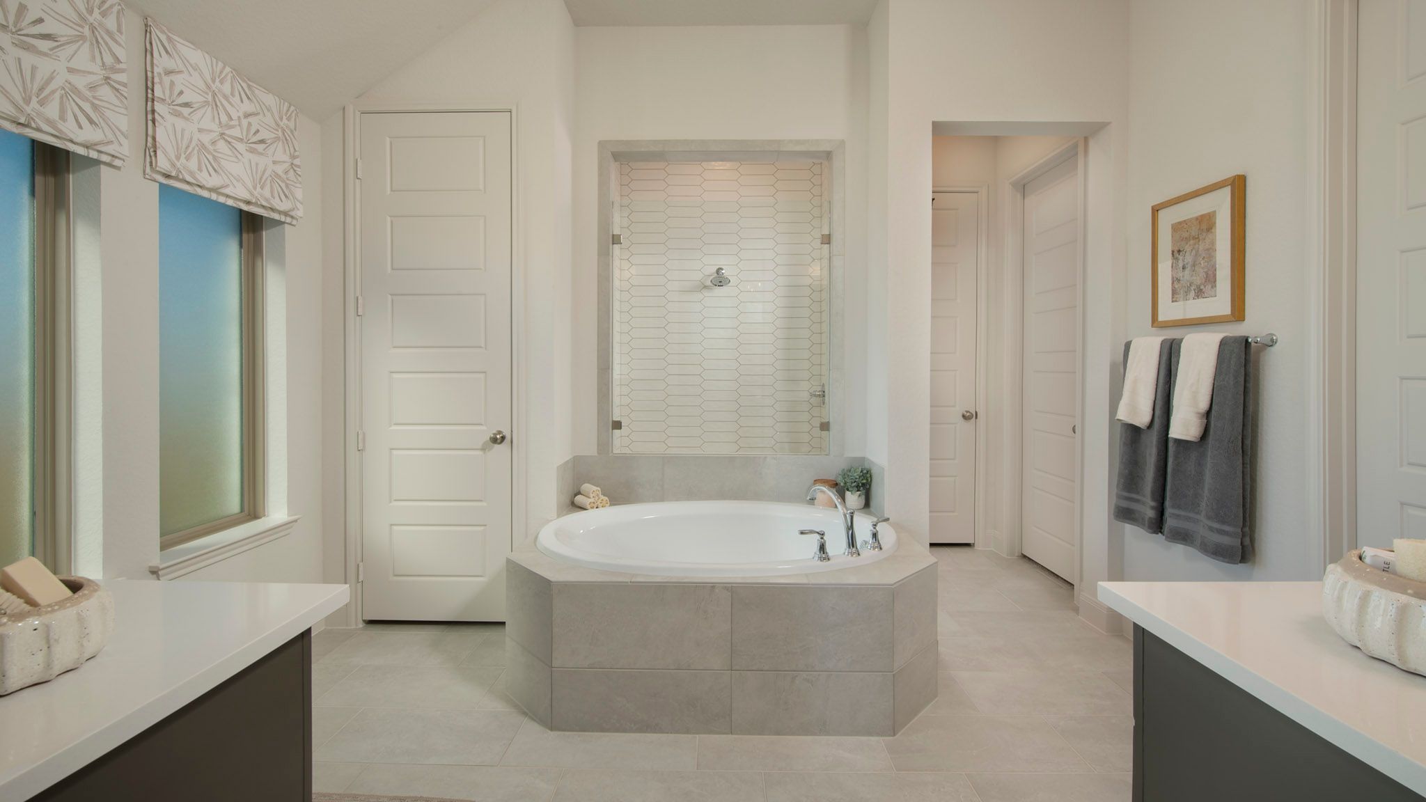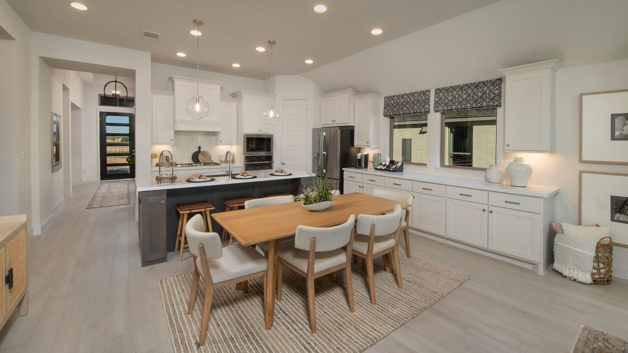 Welcoming entry framed by home office and game room. Family room with a wall of windows opens to kitchen and dining area. Island kitchen with built-in seating space, and a corner walk-in pantry. Secluded primary suite features three large windows. Primary bathroom offers a double door entry, dual vanities, two walk-in closets, garden tub and a separate glass enclosed shower. Secondary bedrooms offer walk-in closets. A Hollywood bathroom and a utility room completes this design. Covered backyard patio. Mud room just off the two-car garage. Representative Images. Features and specifications may vary by community.