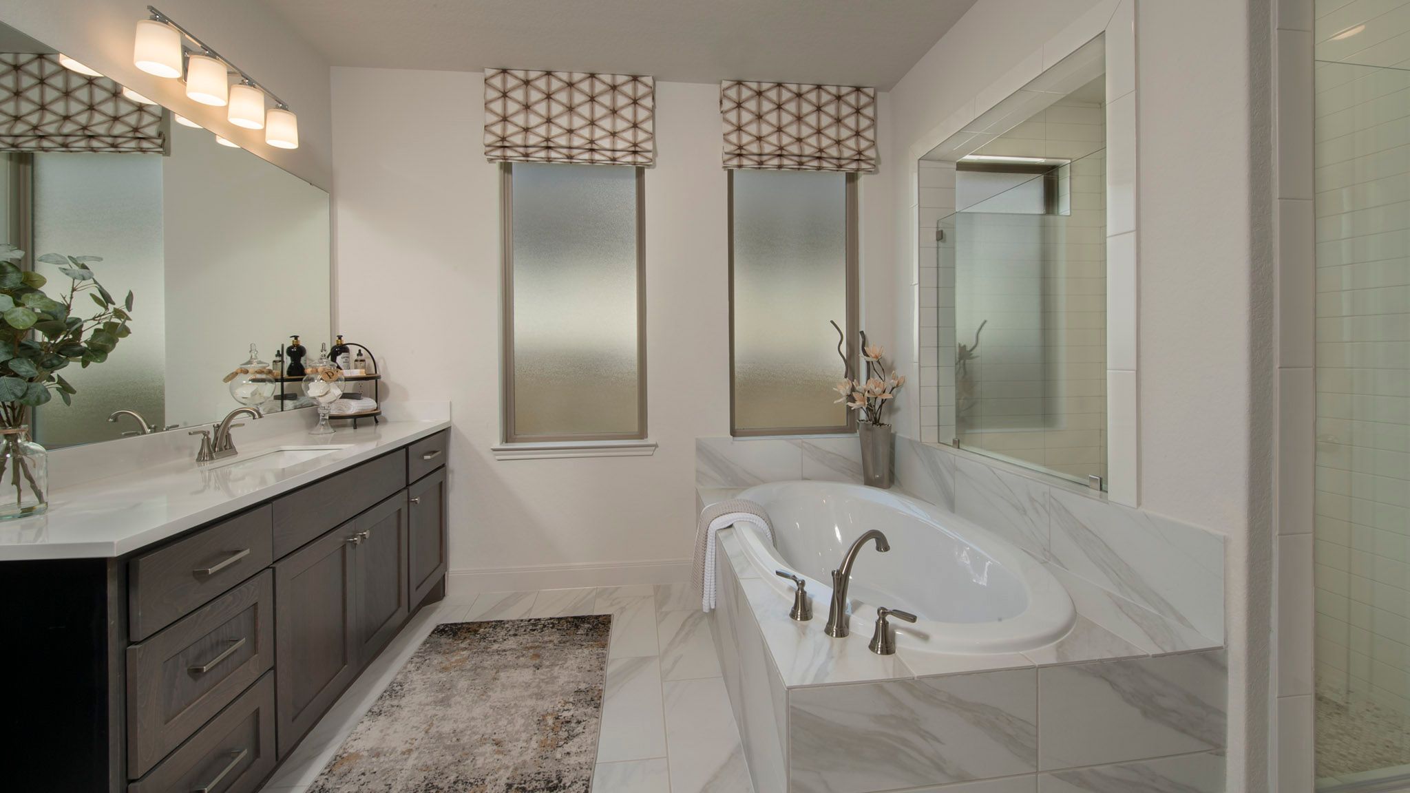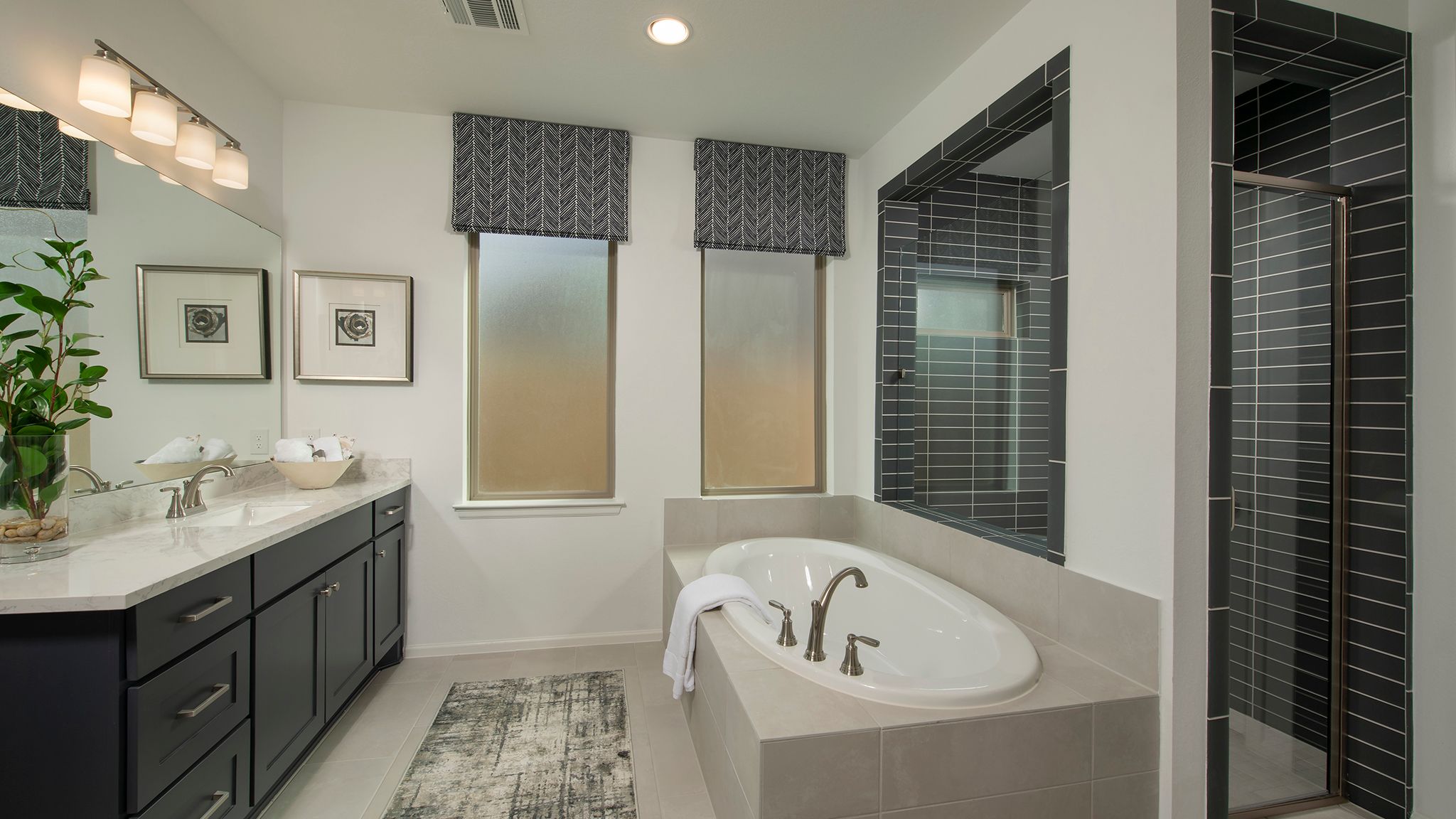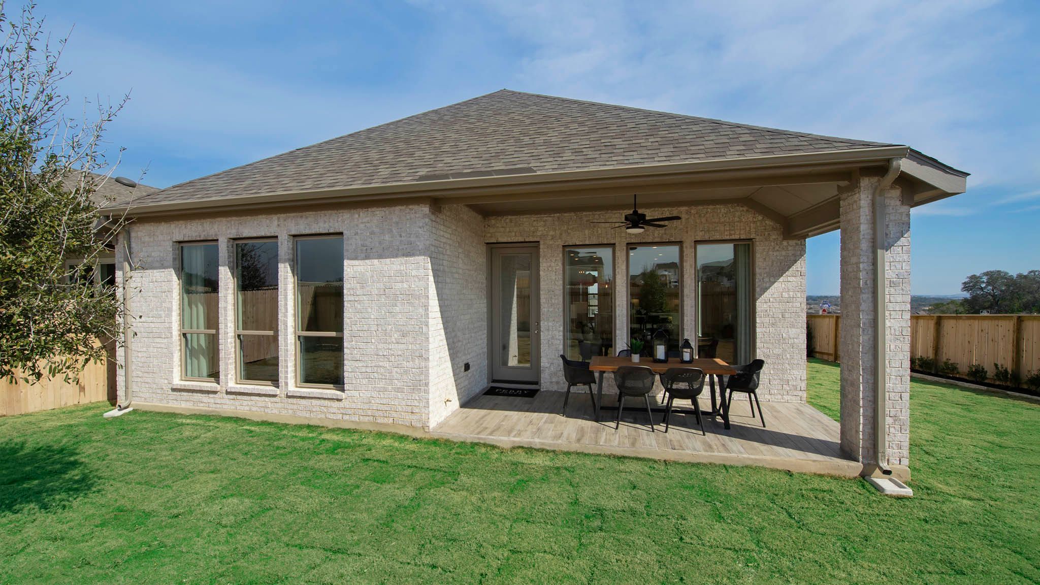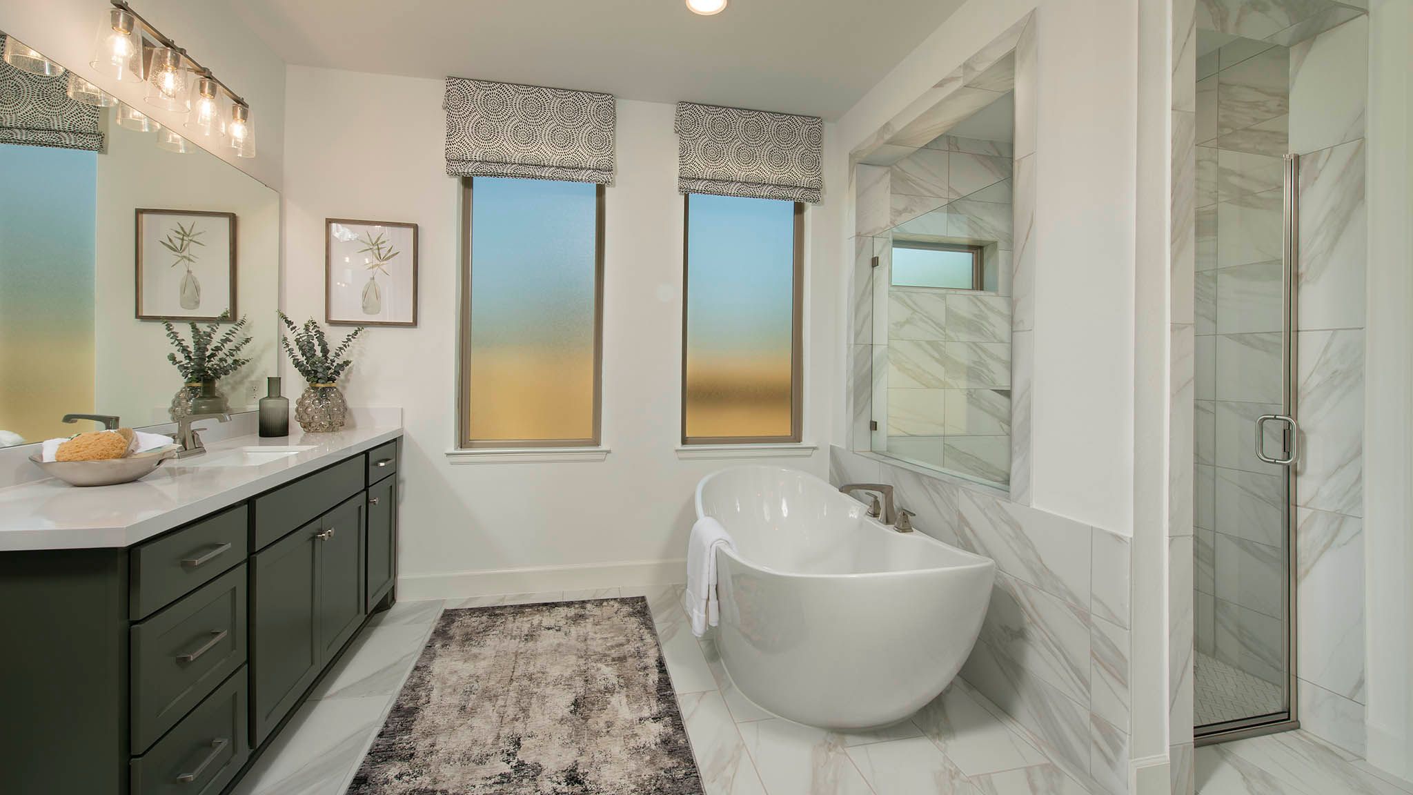 Extended entry with 12-foot ceiling leads to open kitchen, dining area and family room with 10-foot ceilings throughout. Kitchen features center island with built-in seating. Family room features wall of windows. Primary suite with 10-foot ceiling and wall of windows. Dual vanities, garden tub, separate glass-enclosed shower and large walk-in closet in primary bath. A guest suite with private bath adds to this four-bedroom home. Covered backyard patio. Mud room off two-car garage. Representative Images. Features and specifications may vary by community.