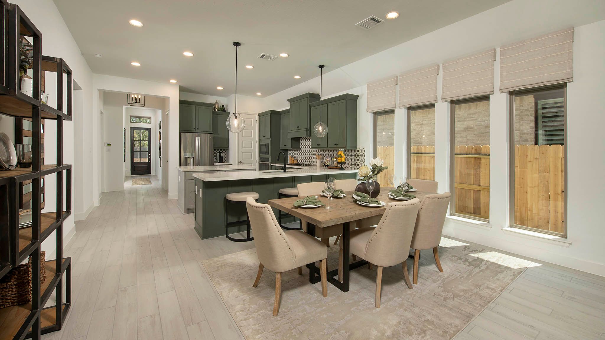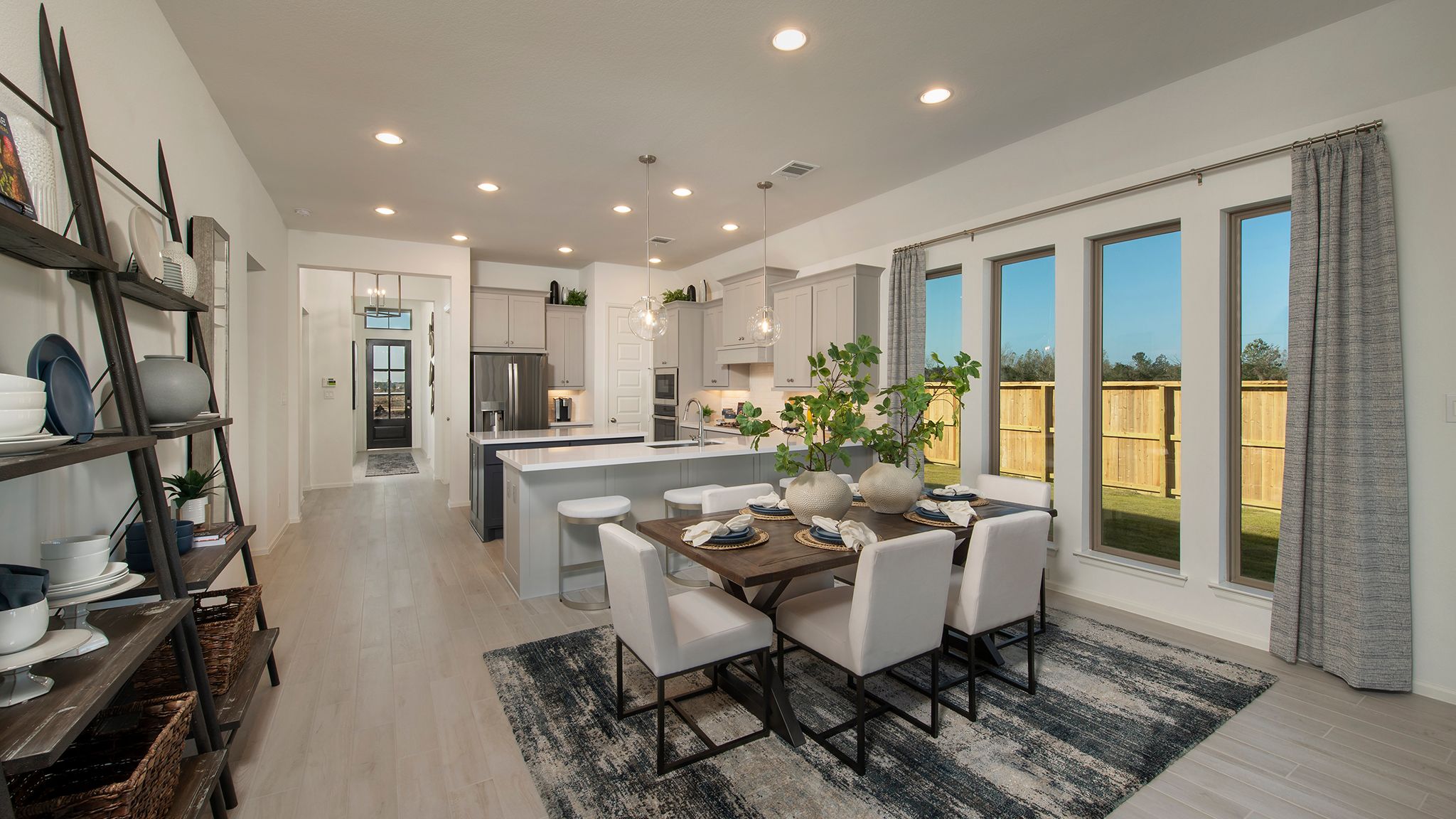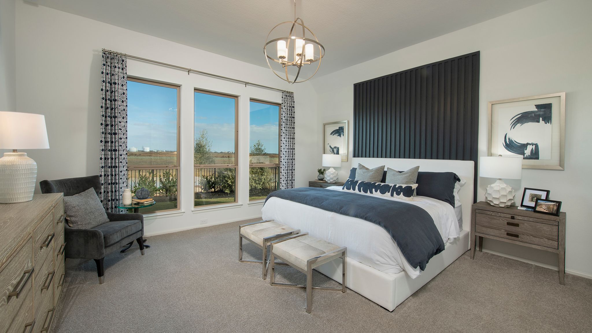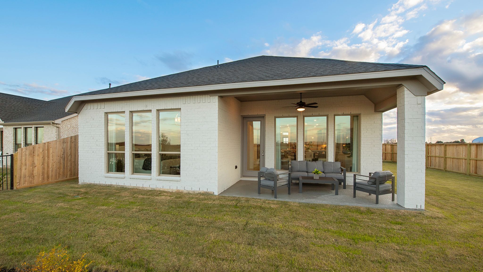 Extended entry with 12-foot ceiling leads to open kitchen, dining area and family room with 10-foot ceilings throughout. Kitchen features center island with built-in seating. Family room features wall of windows. Primary suite with 10-foot ceiling and wall of windows. Dual vanities, garden tub, separate glass-enclosed shower and large walk-in closet in primary bath. A guest suite with private bath adds to this four-bedroom home. Covered backyard patio. Mud room off two-car garage. Representative Images. Features and specifications may vary by community.