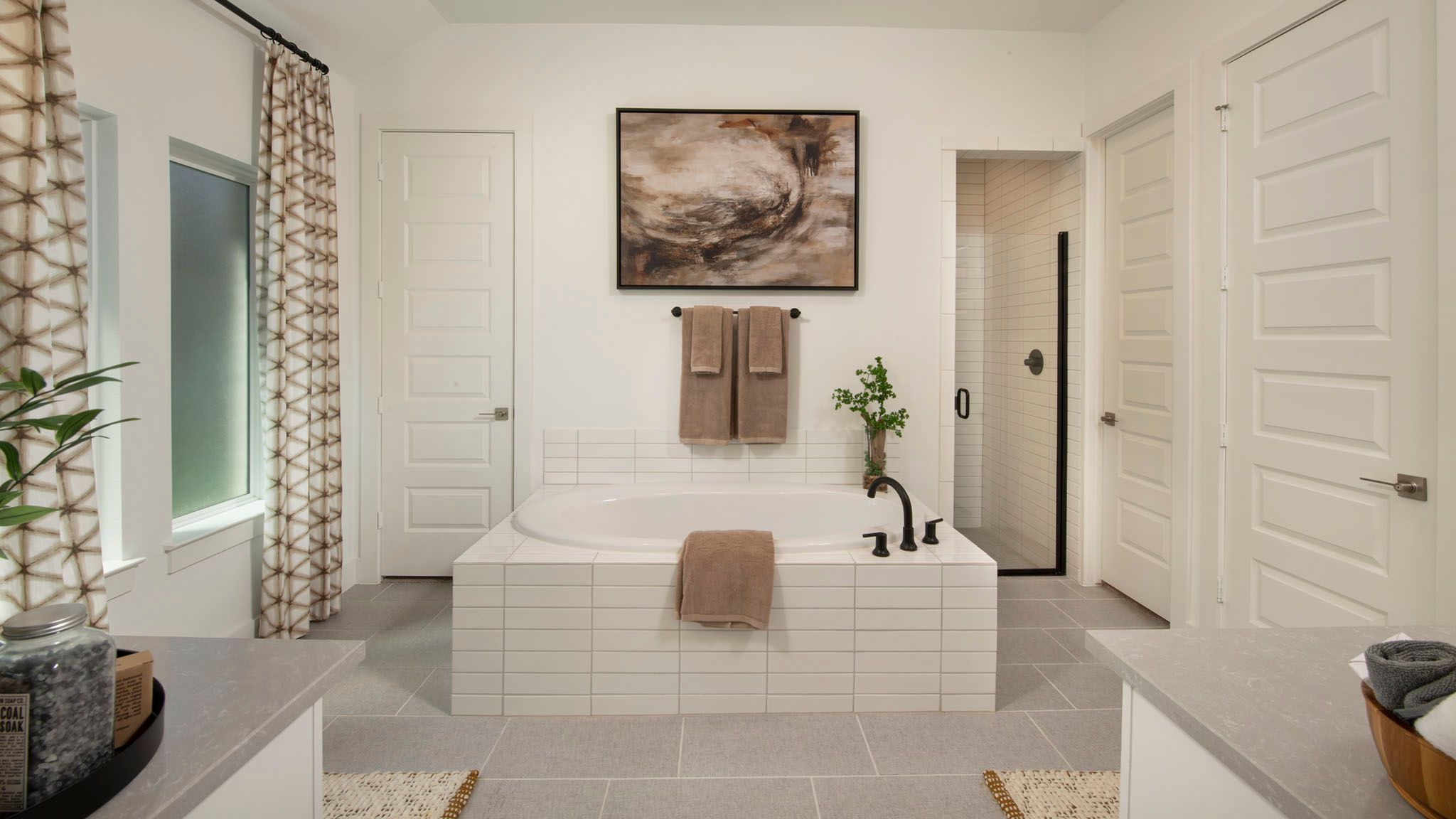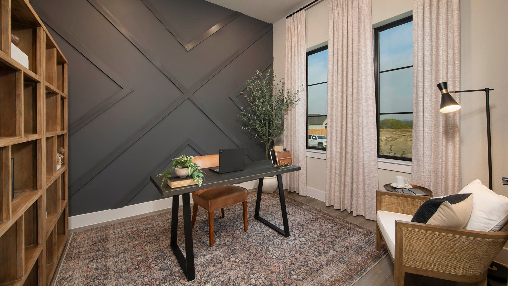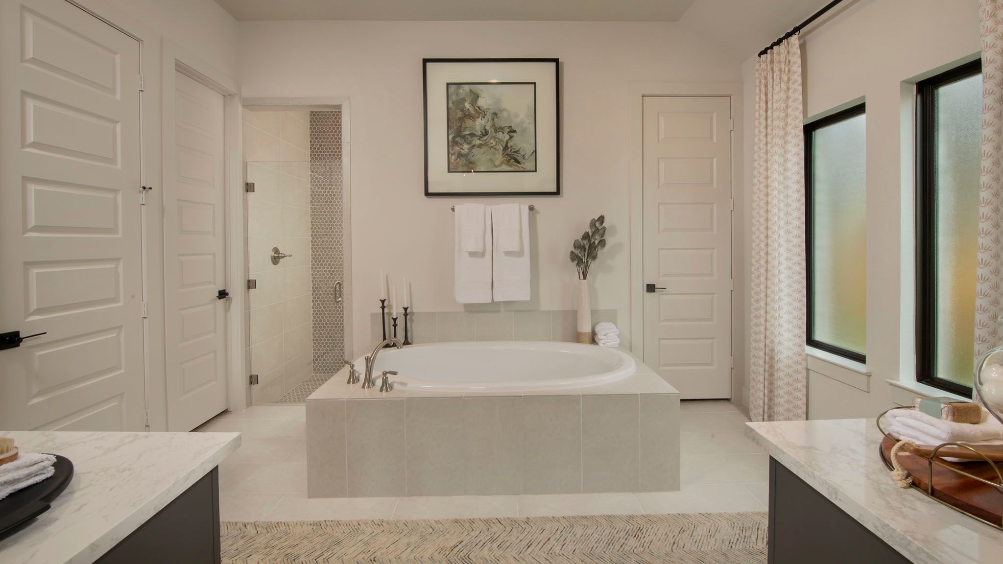 Home office with French doors set at entry with 12-foot ceiling. Open kitchen offers generous counter space, corner walk-in pantry and island with built-in seating space. Dining area flows into open family room with wall of windows. Primary suite includes dual vanities, garden tub, separate glass-enclosed shower and two large walk-in closets in primary bath. A guest suite with private bath adds to this four-bedroom home. Covered backyard patio. Mud room with bonus closet off two-car garage. Representative Images. Features and specifications may vary by community.