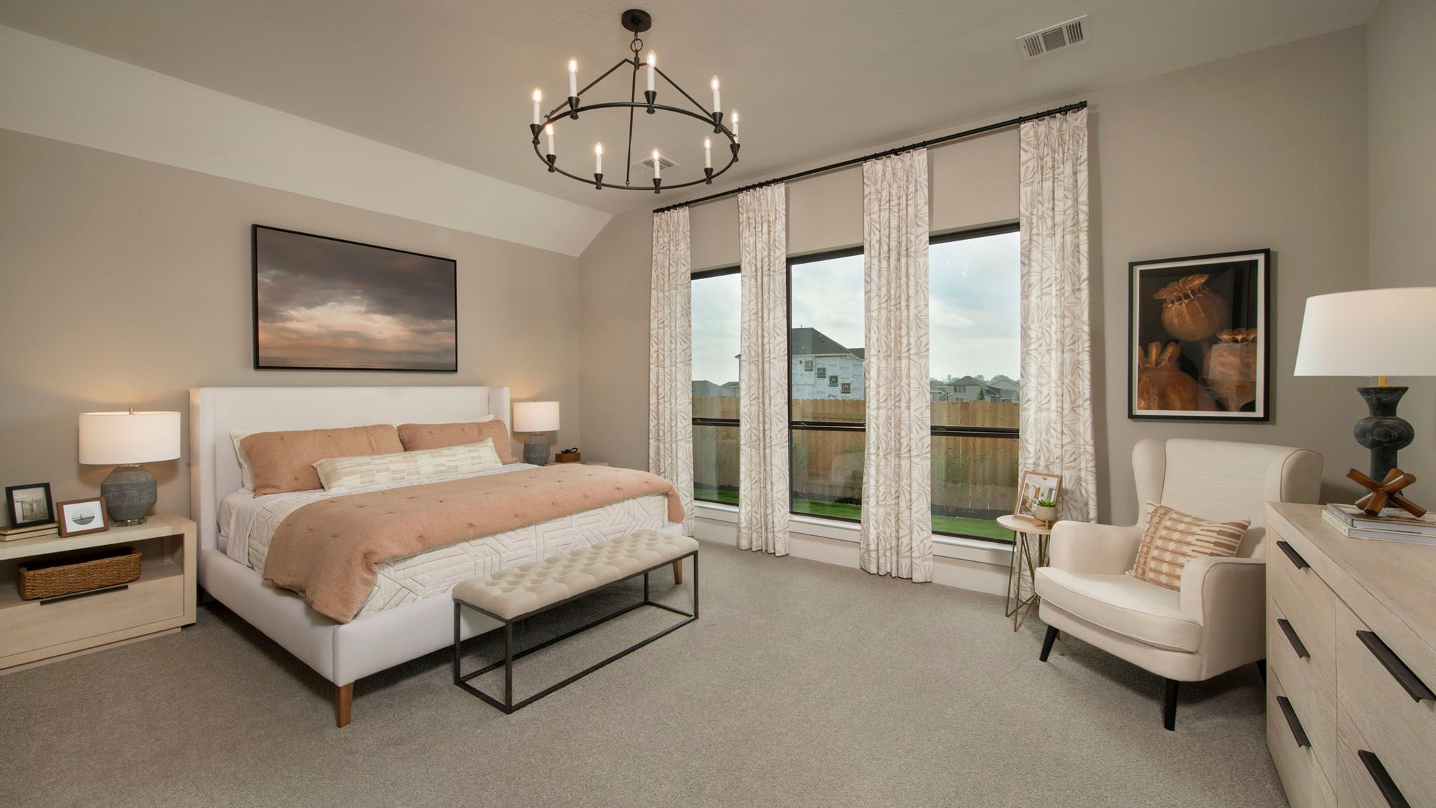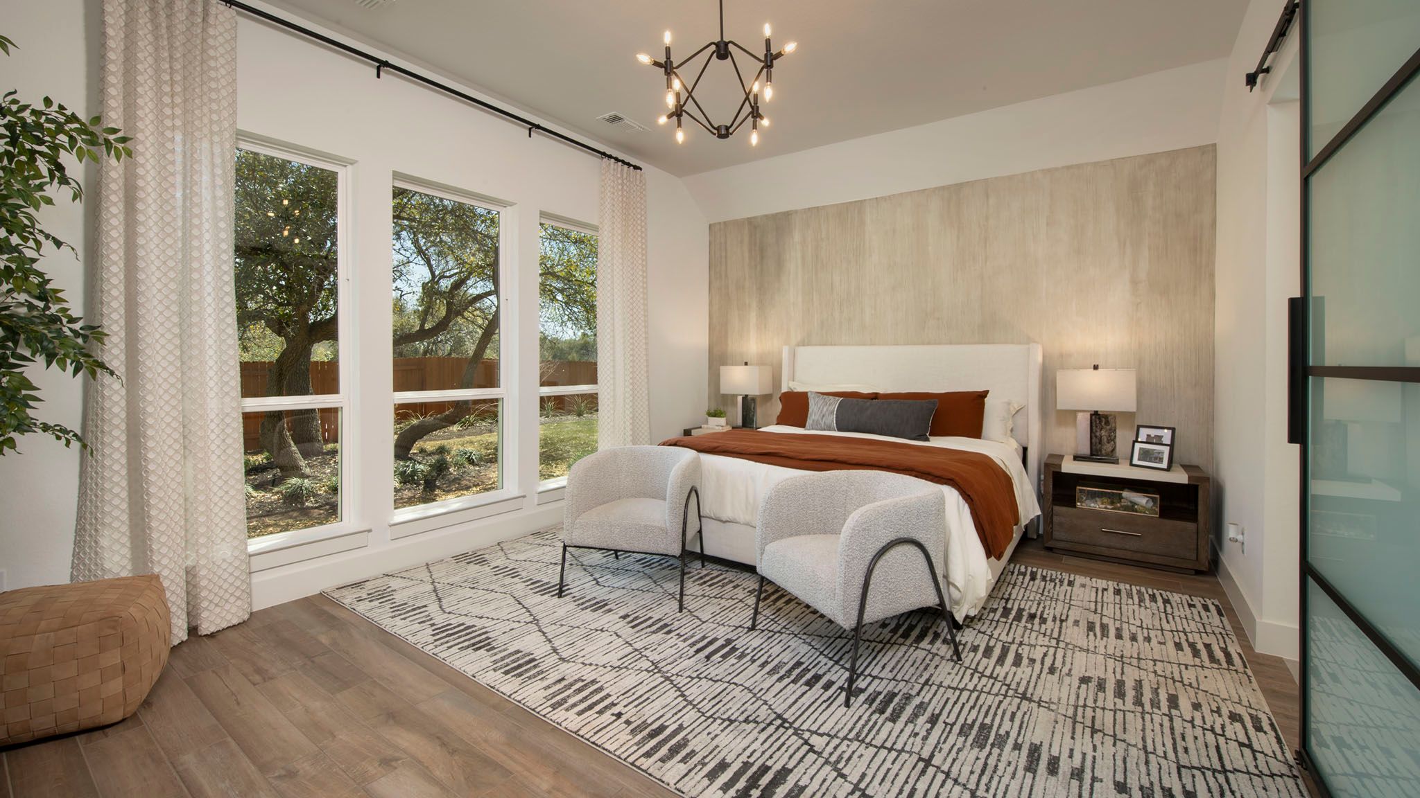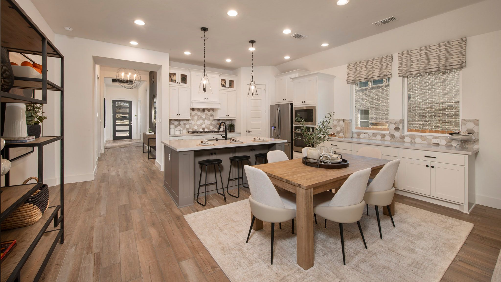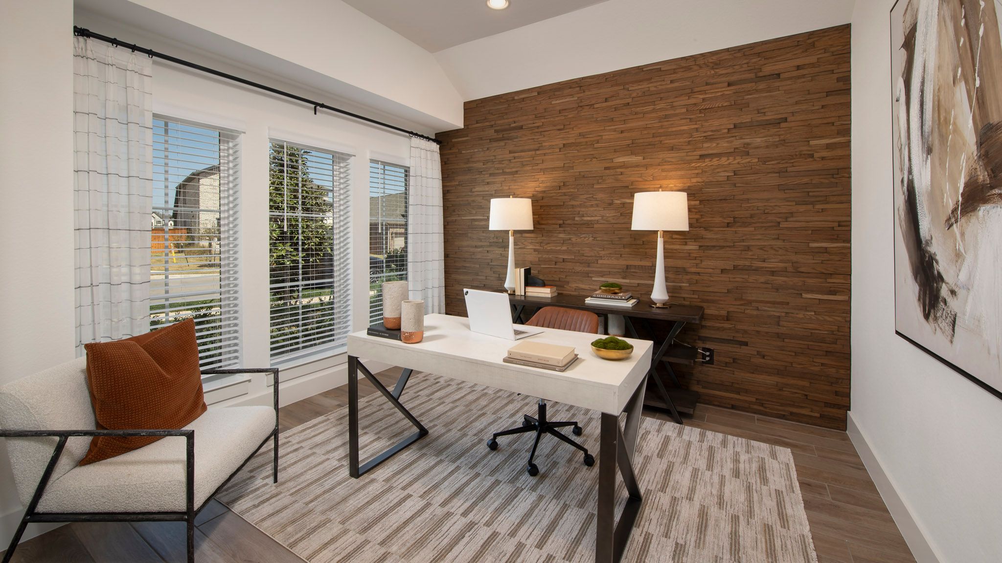 Home office with French doors set at entry with 12-foot ceiling. Open kitchen offers generous counter space, corner walk-in pantry and island with built-in seating space. Dining area flows into open family room with wall of windows. Primary suite includes dual vanities, garden tub, separate glass-enclosed shower and two large walk-in closets in primary bath. A guest suite with private bath adds to this four-bedroom home. Covered backyard patio. Mud room with bonus closet off two-car garage. Representative Images. Features and specifications may vary by community.