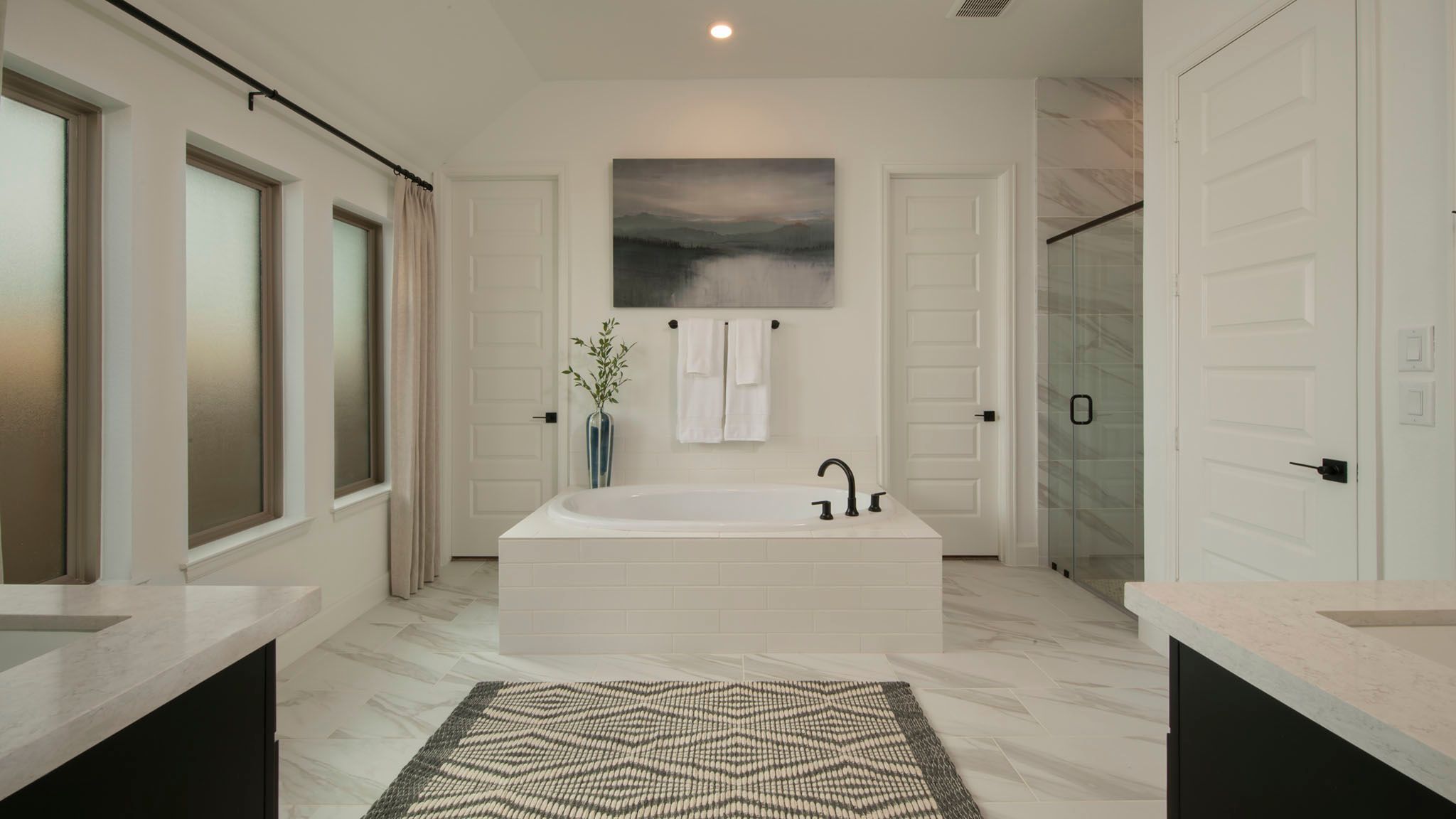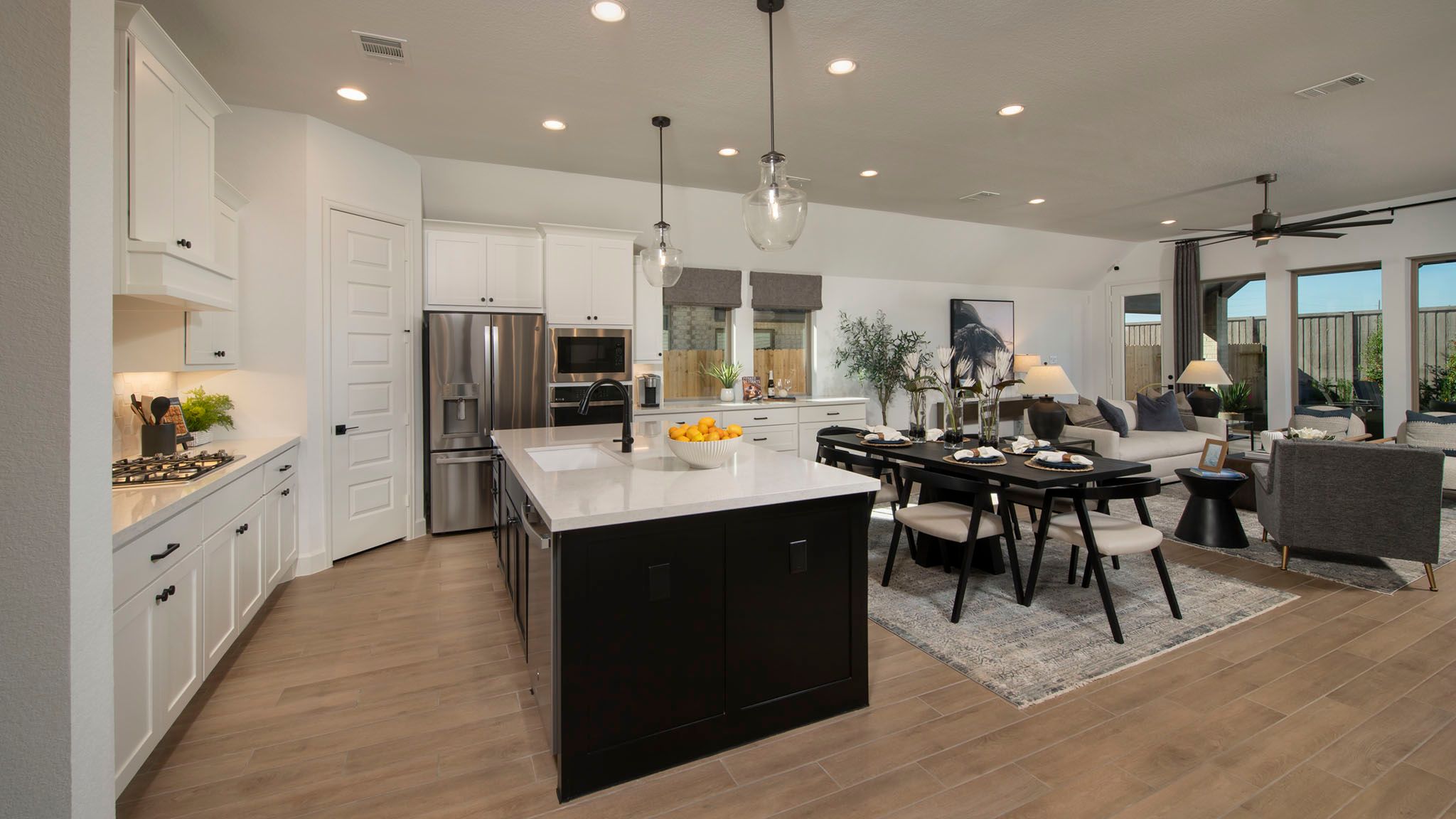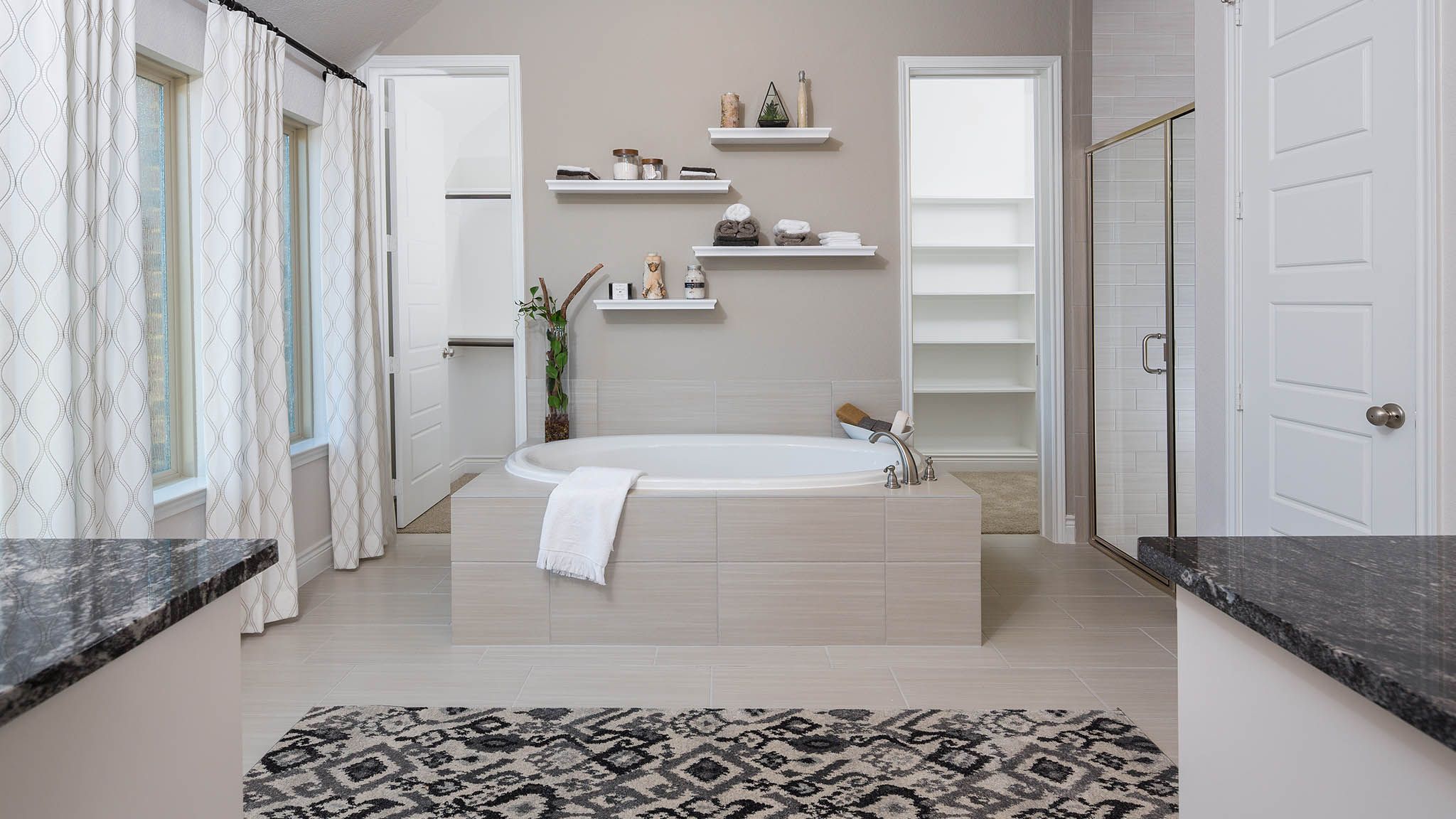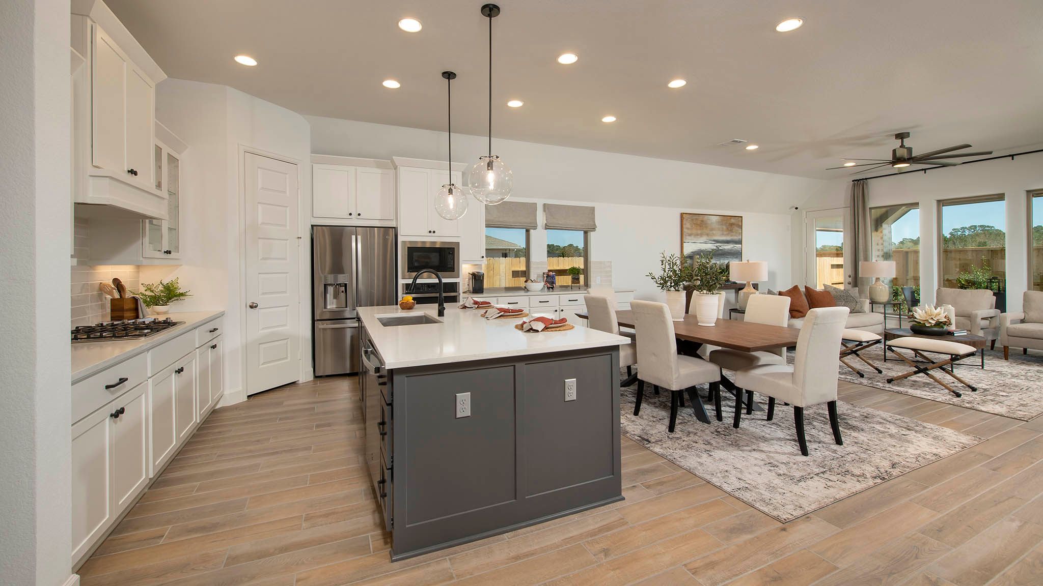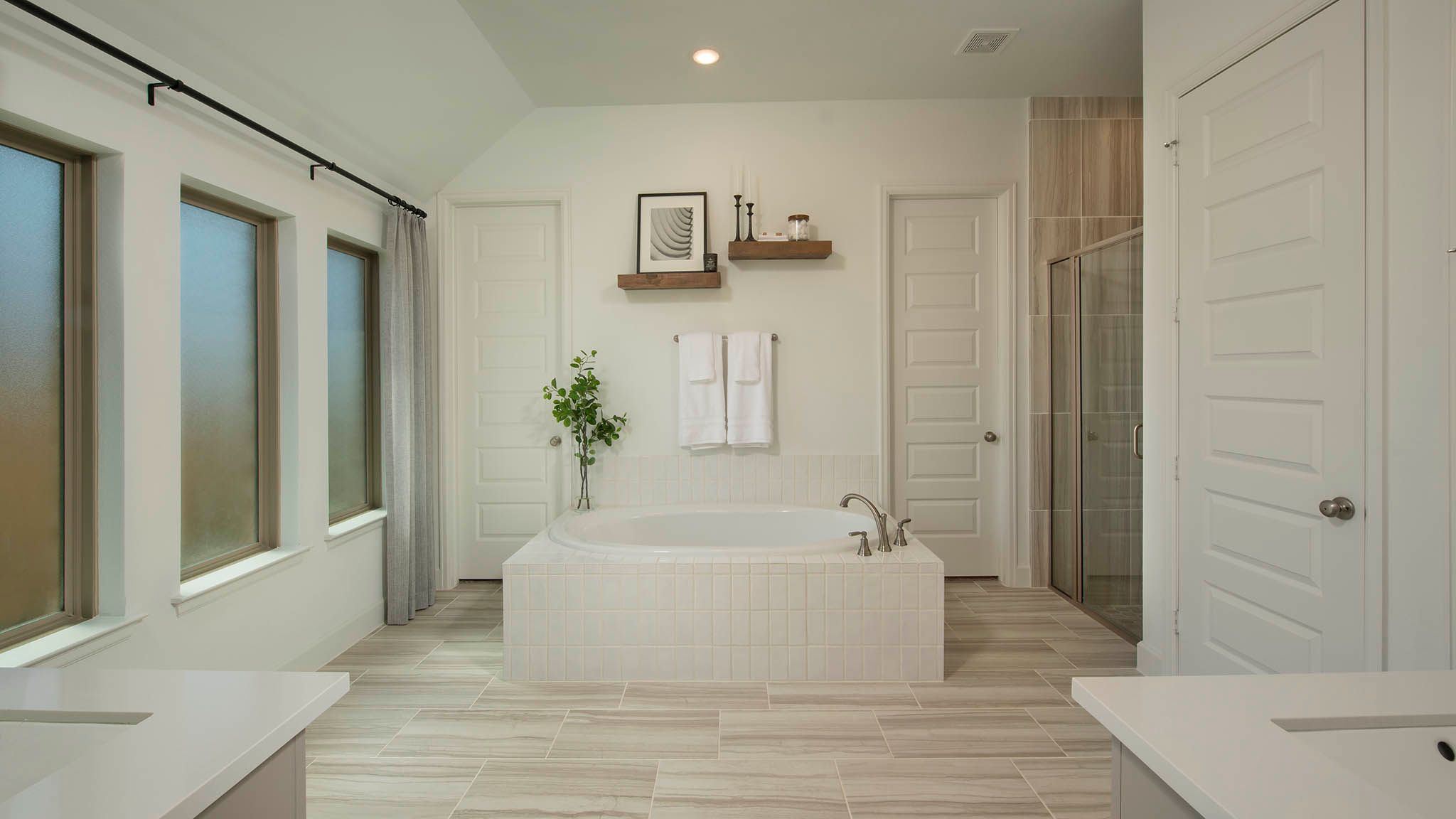Home office with French doors set at entry with 12-foot ceiling. Extended entry leads to open kitchen, dining area and family room. Kitchen features corner walk-in pantry, generous counter space and island with built-in seating space. Dining area flows into family room with wall of windows. Primary suite includes double-door entry to primary bath with dual vanities, garden tub, separate glass-enclosed shower and two large walk-in closets. A guest suite with private bath adds to this spacious one-story home. Covered backyard patio. Mud room off two-car garage. Representative Images. Features and specifications may vary by community.