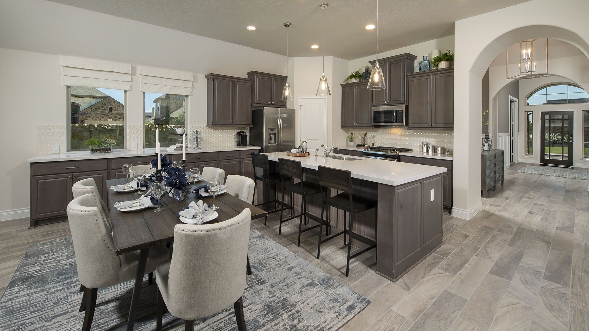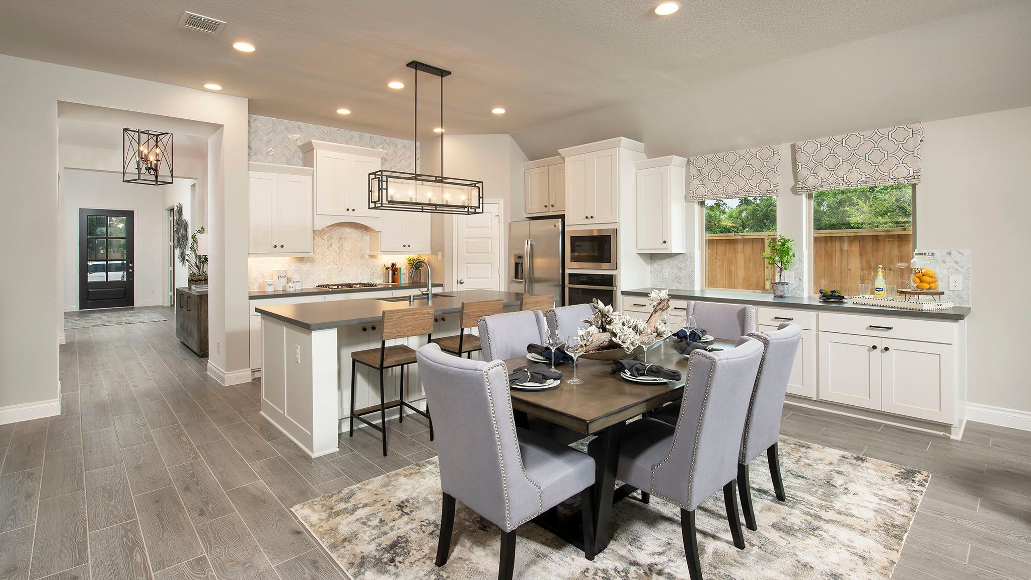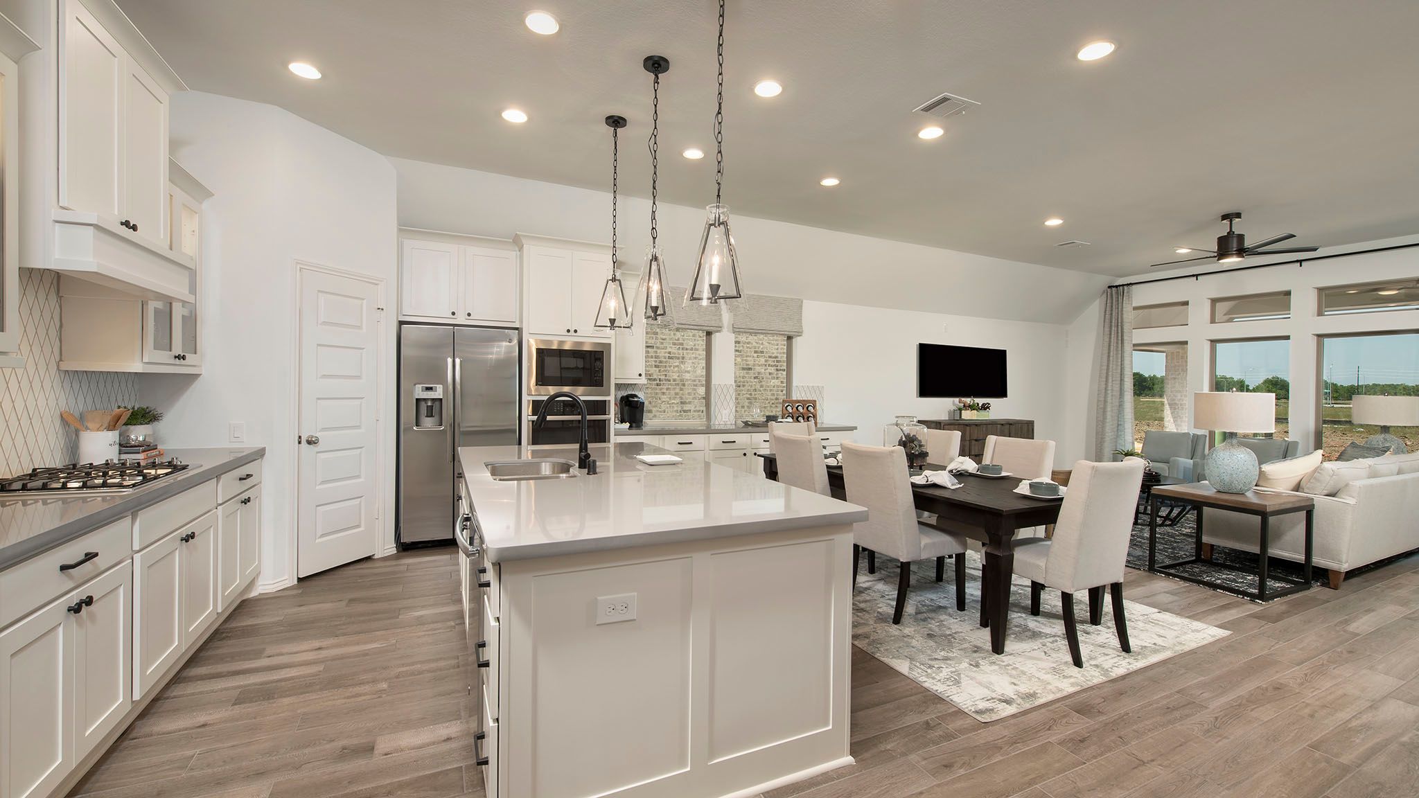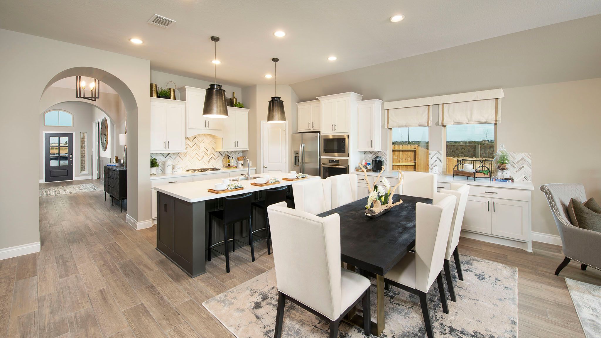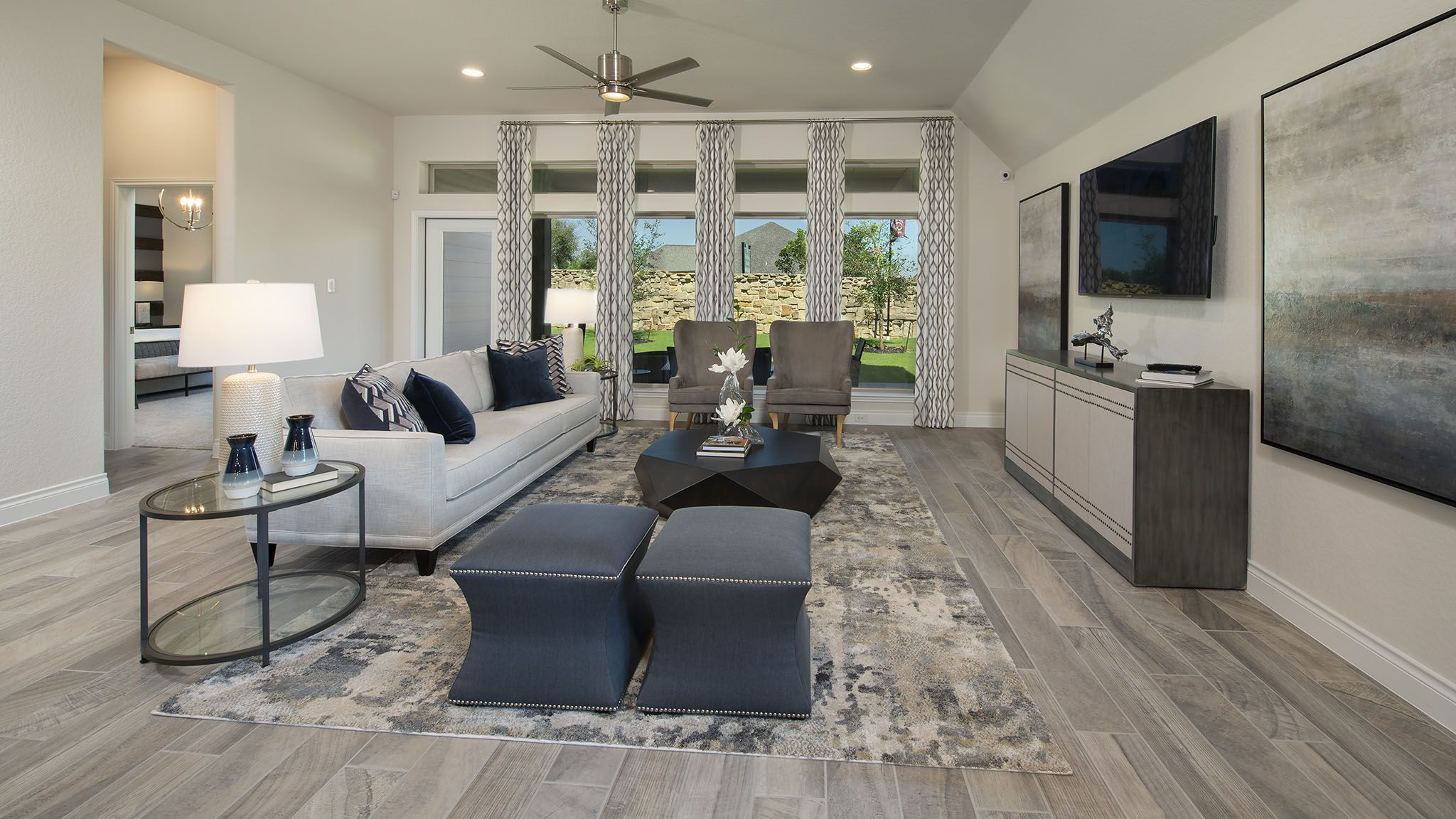 Home office with French doors set at entry with 12-foot ceiling. Extended entry leads to open kitchen, dining area and family room. Kitchen features corner walk-in pantry, generous counter space and island with built-in seating space. Dining area flows into family room with wall of windows. Primary suite includes double-door entry to primary bath with dual vanities, garden tub, separate glass-enclosed shower and two large walk-in closets. A guest suite with private bath adds to this spacious one-story home. Covered backyard patio. Mud room off two-car garage. Representative Images. Features and specifications may vary by community.