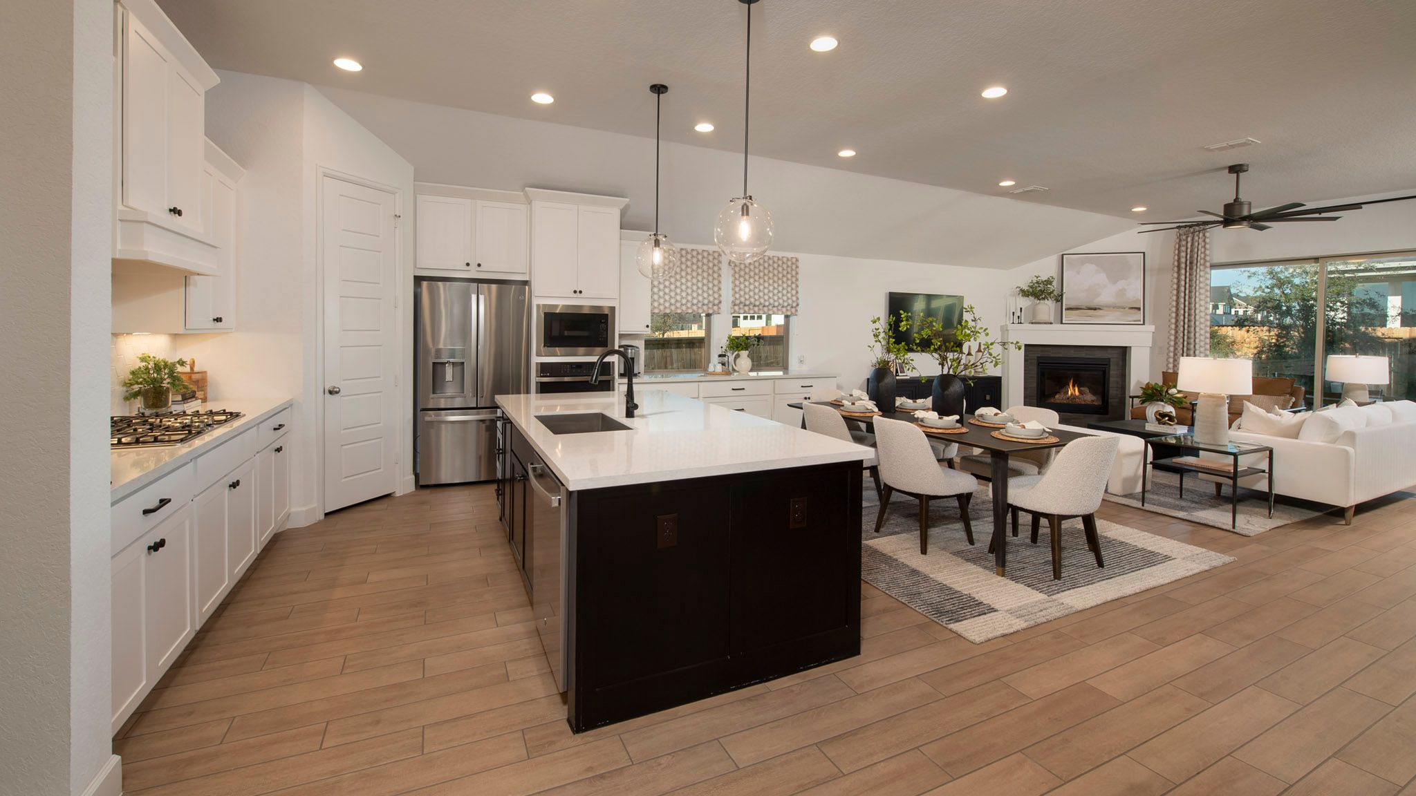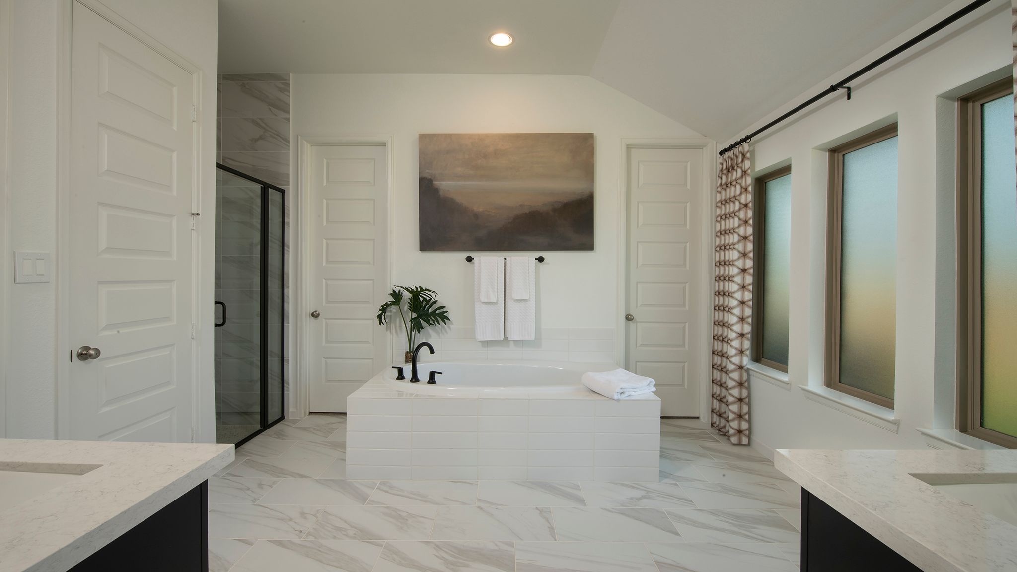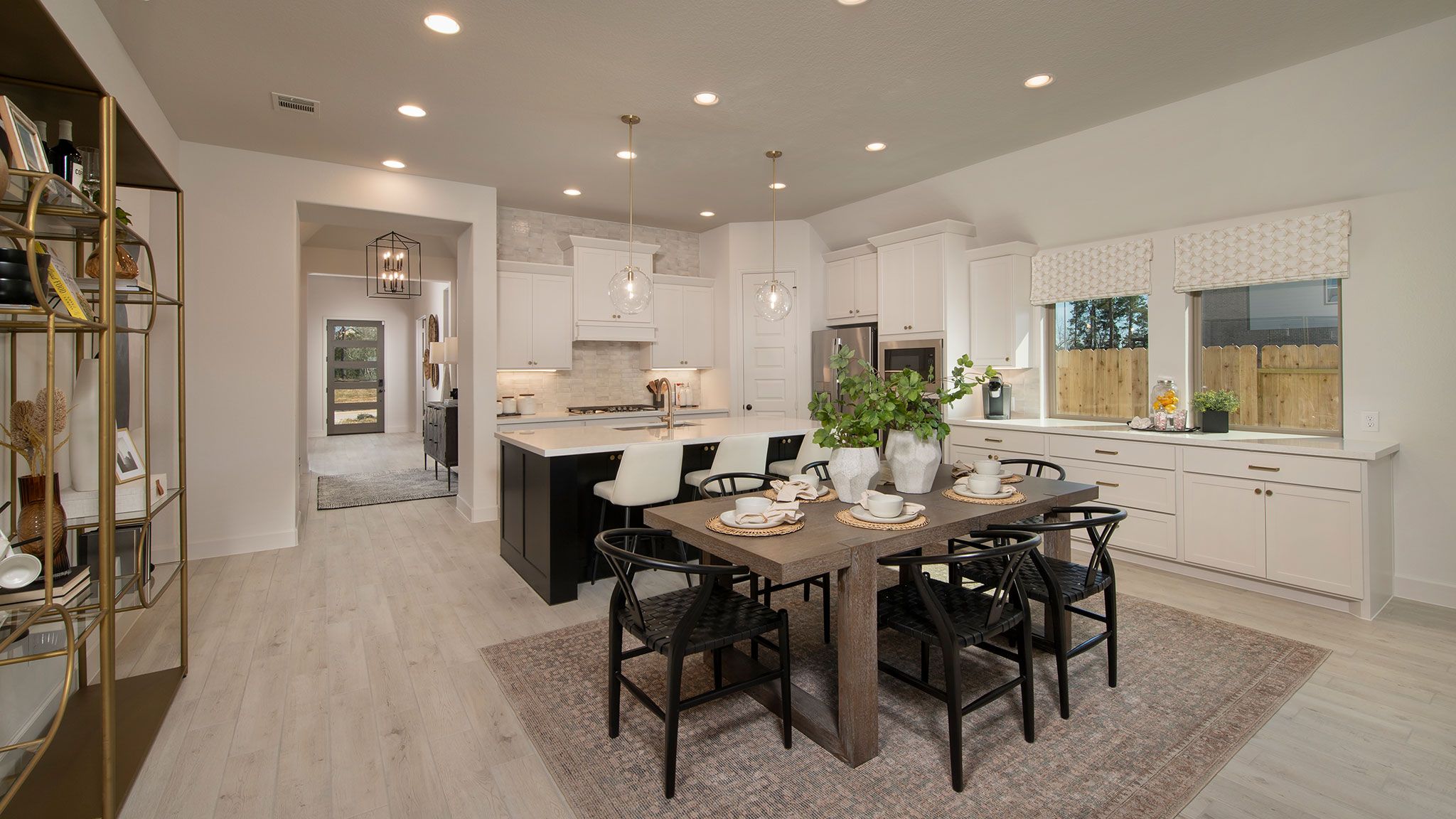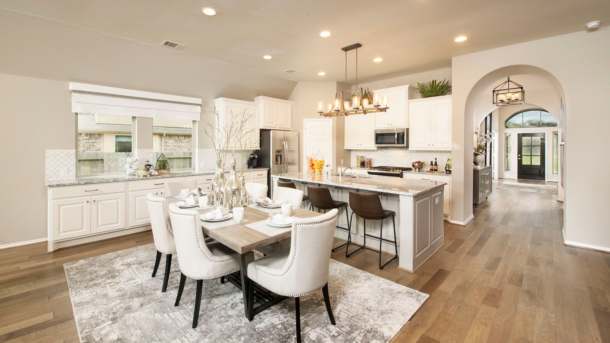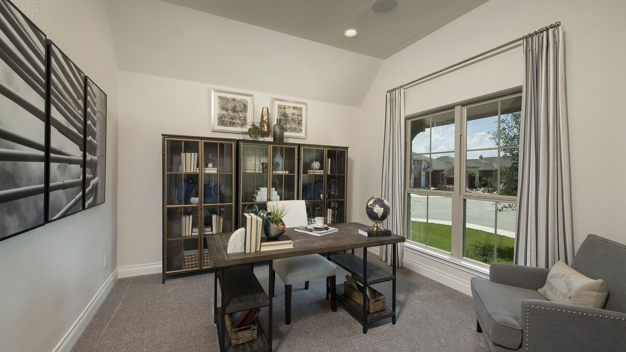 Home office with French doors set at entry with 12-foot ceiling. Extended entry leads to open kitchen, dining area and family room. Kitchen features corner walk-in pantry, generous counter space and island with built-in seating space. Dining area flows into family room with wall of windows. Primary suite includes double-door entry to primary bath with dual vanities, garden tub, separate glass-enclosed shower and two large walk-in closets. A guest suite with private bath adds to this spacious one-story home. Covered backyard patio. Mud room off two-car garage. Representative Images. Features and specifications may vary by community.