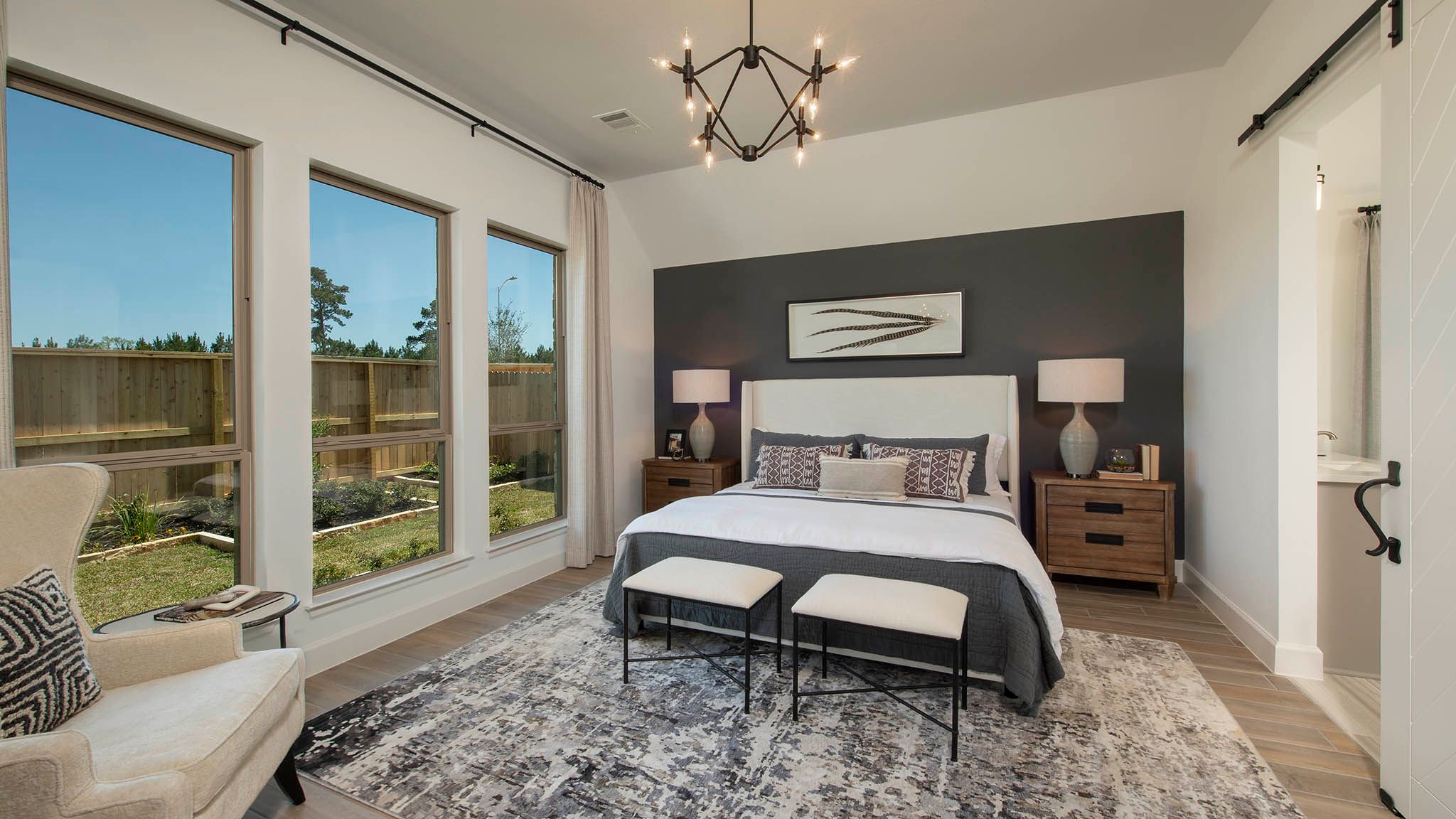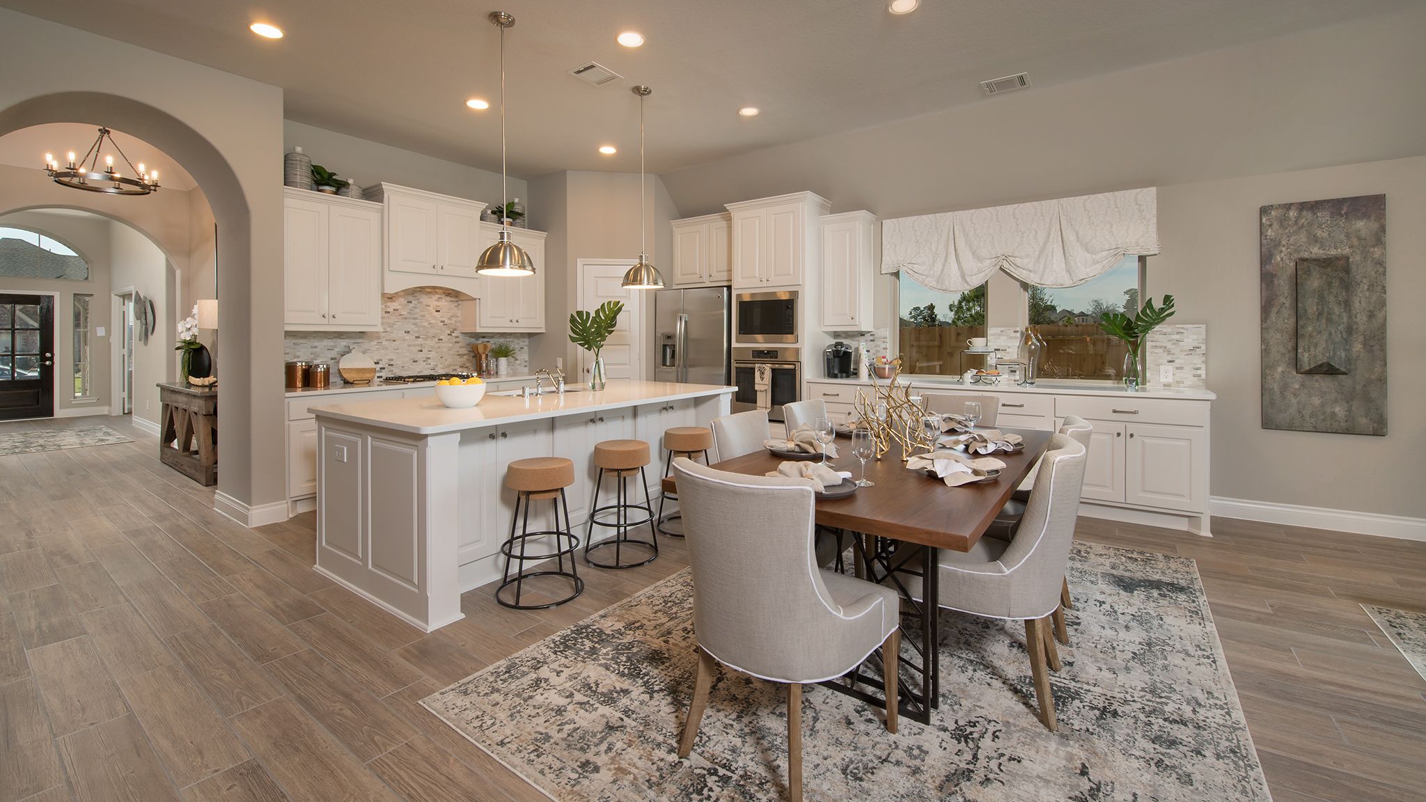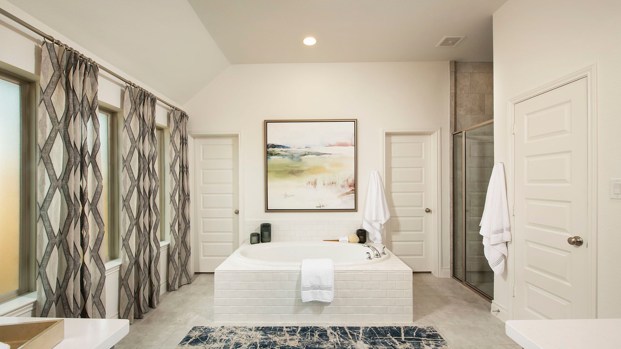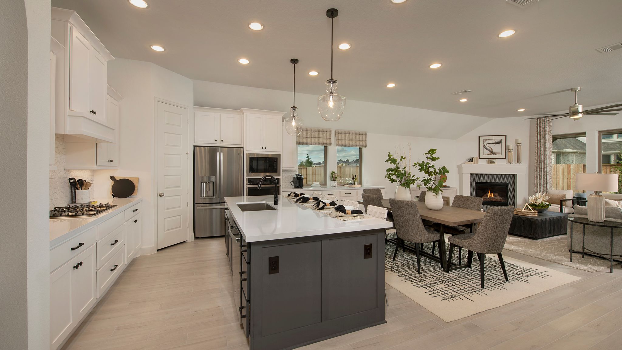 Home office with French doors set at entry with 12-foot ceiling. Extended entry leads to open kitchen, dining area and family room. Kitchen features corner walk-in pantry, generous counter space and island with built-in seating space. Dining area flows into family room with wall of windows. Primary suite includes double-door entry to primary bath with dual vanities, garden tub, separate glass-enclosed shower and two large walk-in closets. A guest suite with private bath adds to this spacious one-story home. Covered backyard patio. Mud room off two-car garage. Representative Images. Features and specifications may vary by community.