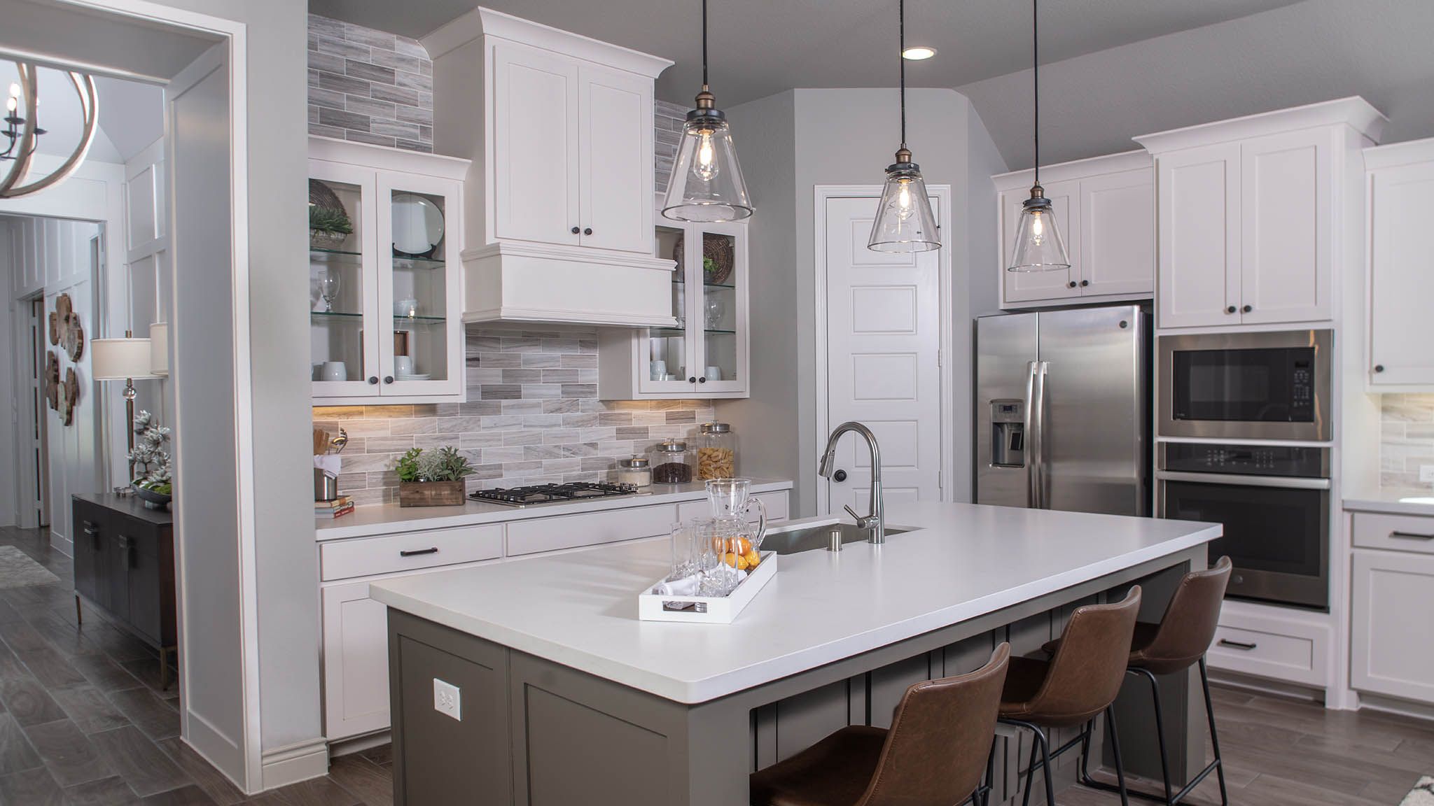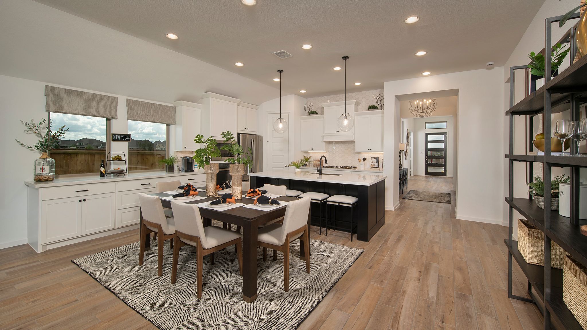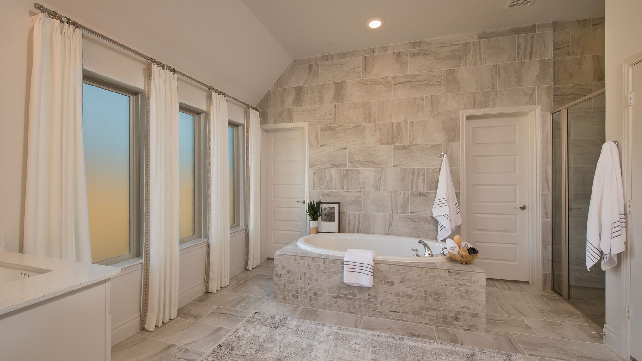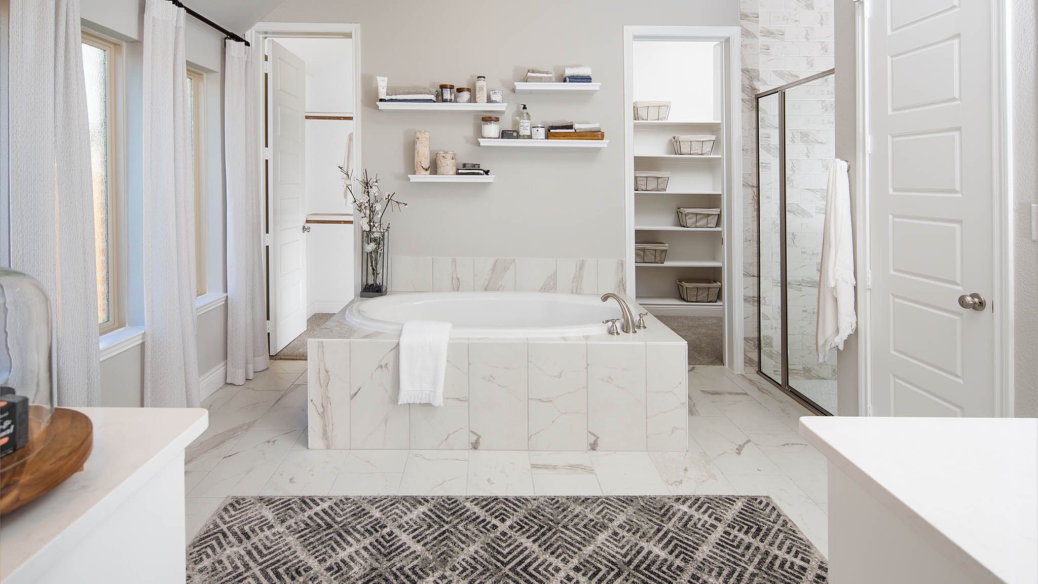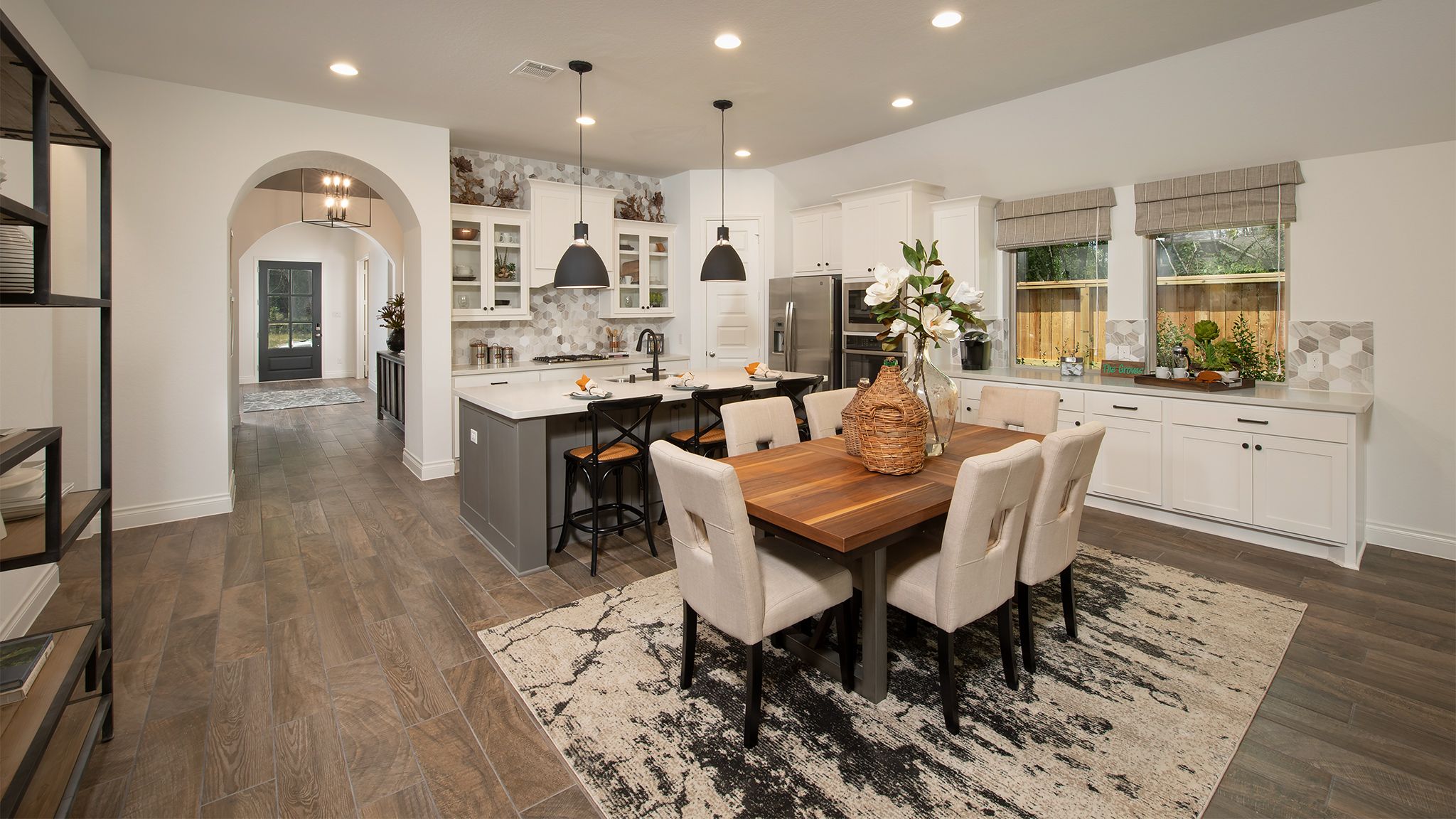 Home office with French doors set at entry with 12-foot ceiling. Extended entry leads to open kitchen, dining area and family room. Kitchen features corner walk-in pantry, generous counter space and island with built-in seating space. Dining area flows into family room with wall of windows. Primary suite includes double-door entry to primary bath with dual vanities, garden tub, separate glass-enclosed shower and two large walk-in closets. A guest suite with private bath adds to this spacious one-story home. Covered backyard patio. Mud room off two-car garage. Representative Images. Features and specifications may vary by community.