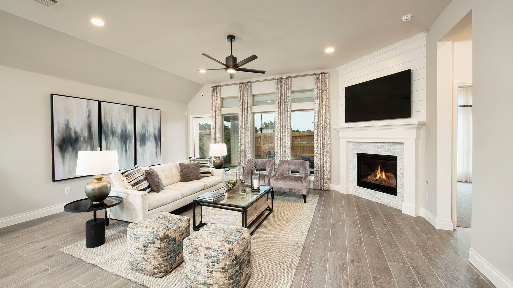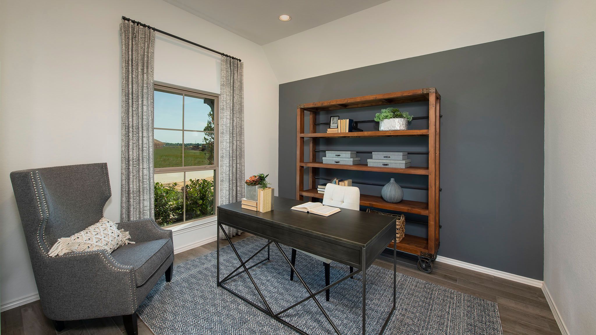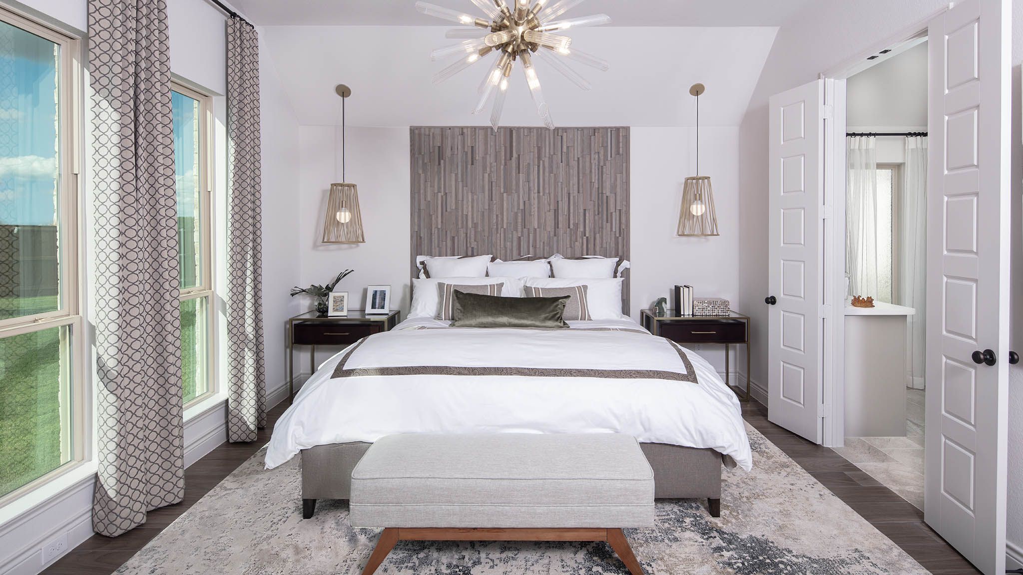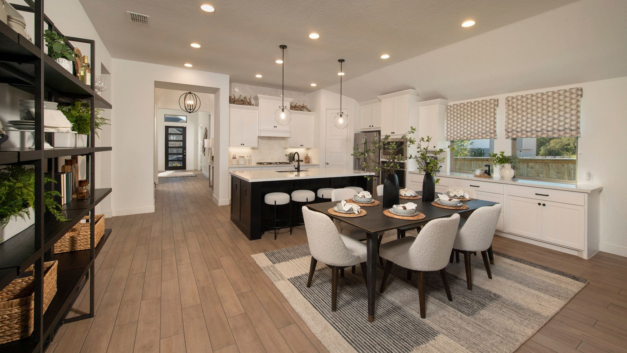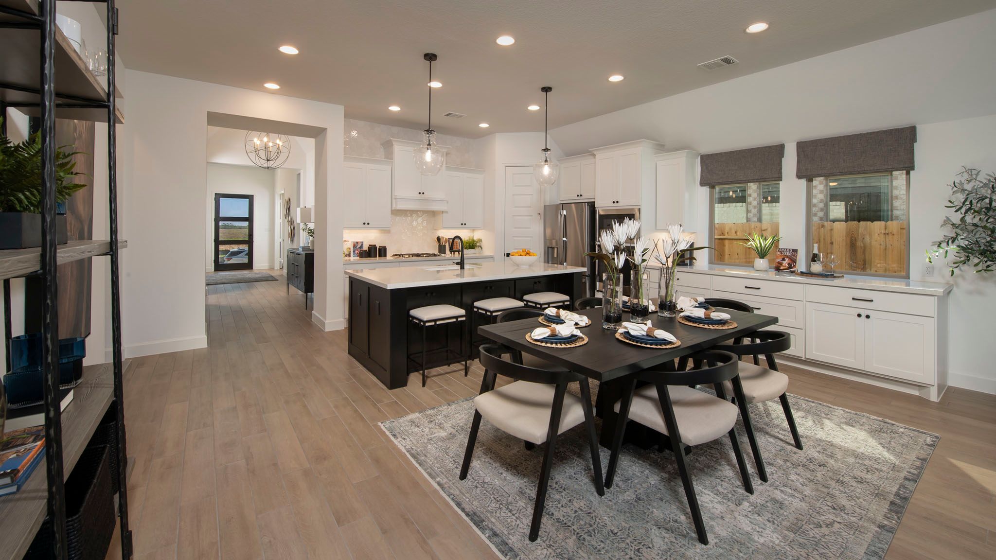 Home office with French doors set at entry with 12-foot ceiling. Extended entry leads to open kitchen, dining area and family room. Kitchen features corner walk-in pantry, generous counter space and island with built-in seating space. Dining area flows into family room with wall of windows. Primary suite includes double-door entry to primary bath with dual vanities, garden tub, separate glass-enclosed shower and two large walk-in closets. A guest suite with private bath adds to this spacious one-story home. Covered backyard patio. Mud room off two-car garage. Representative Images. Features and specifications may vary by community.