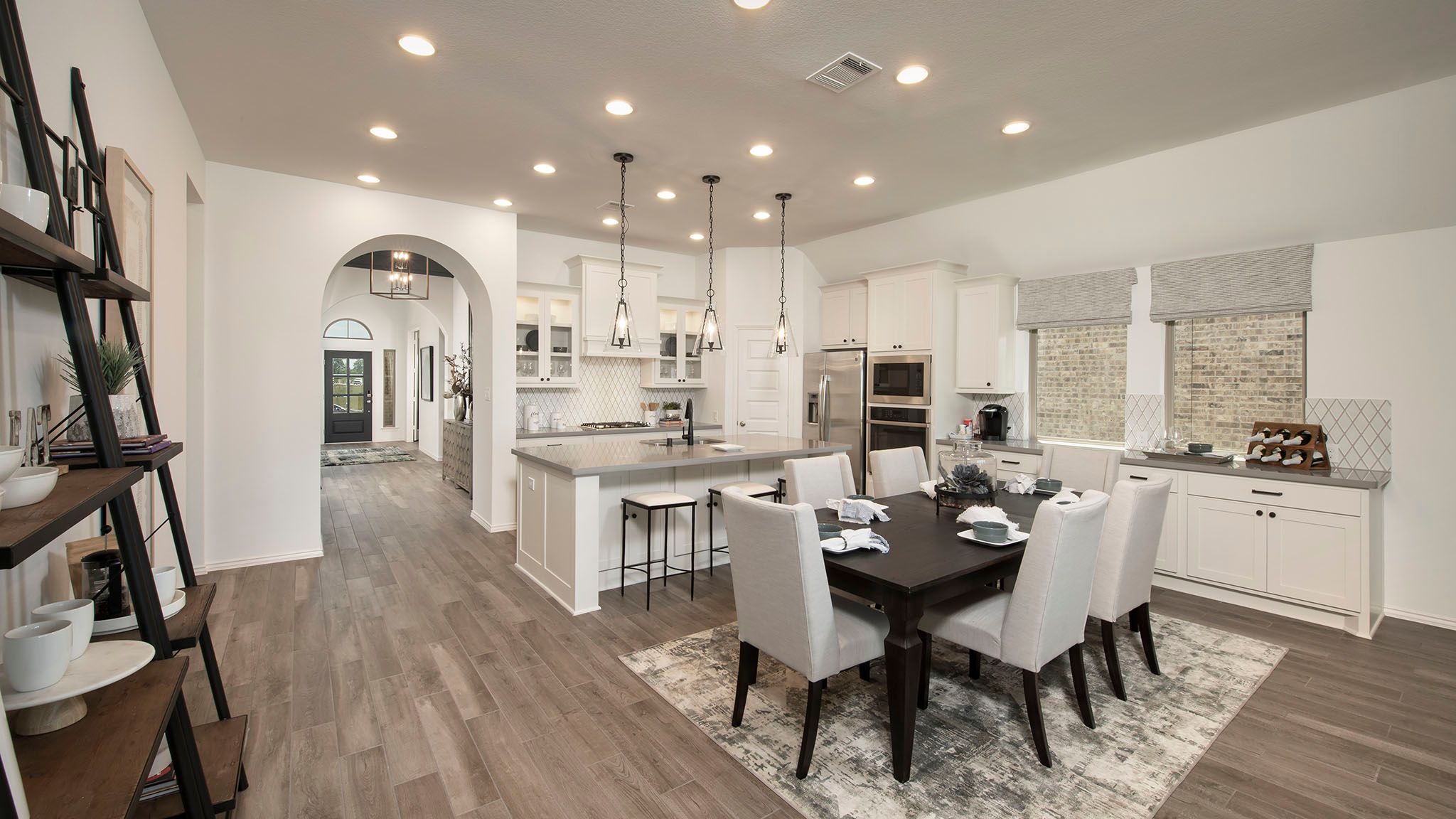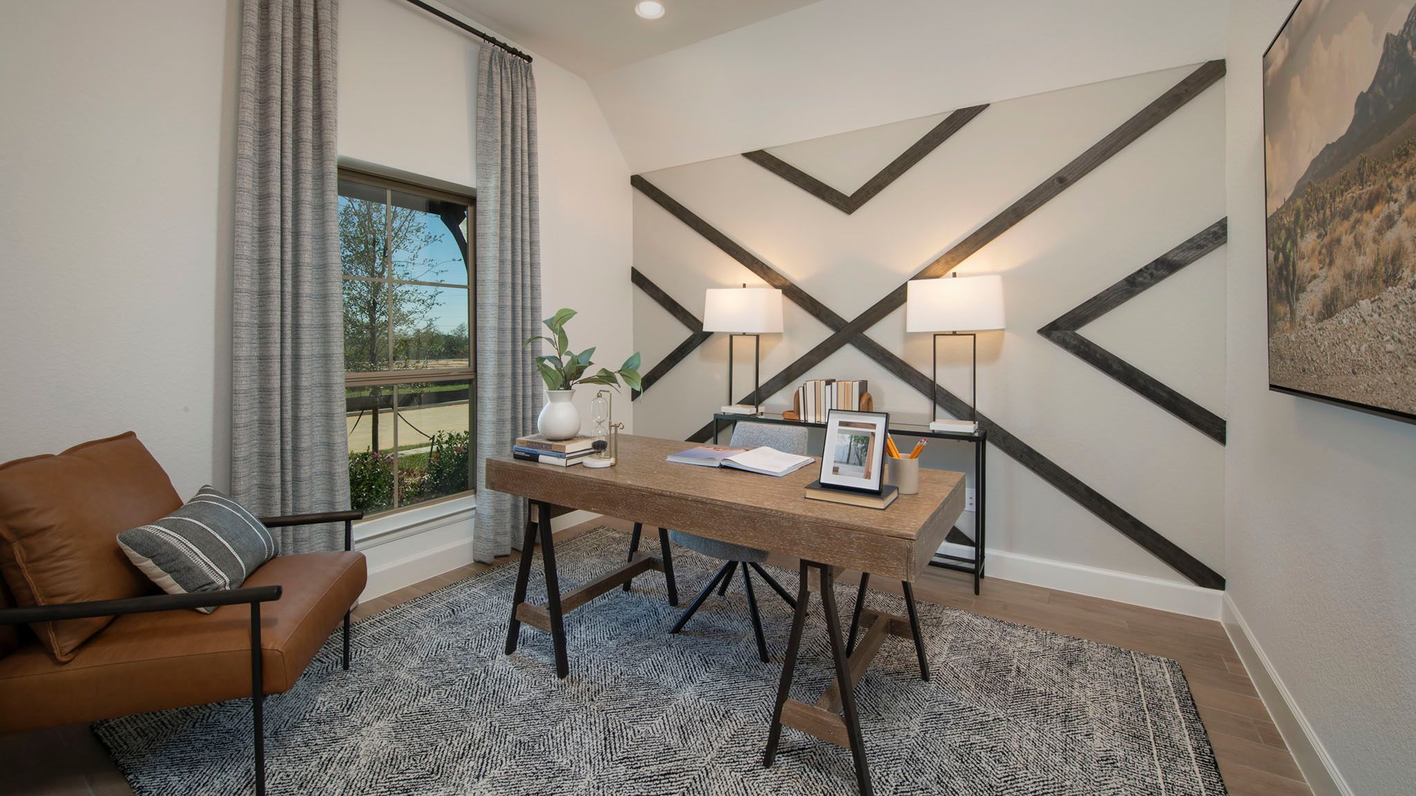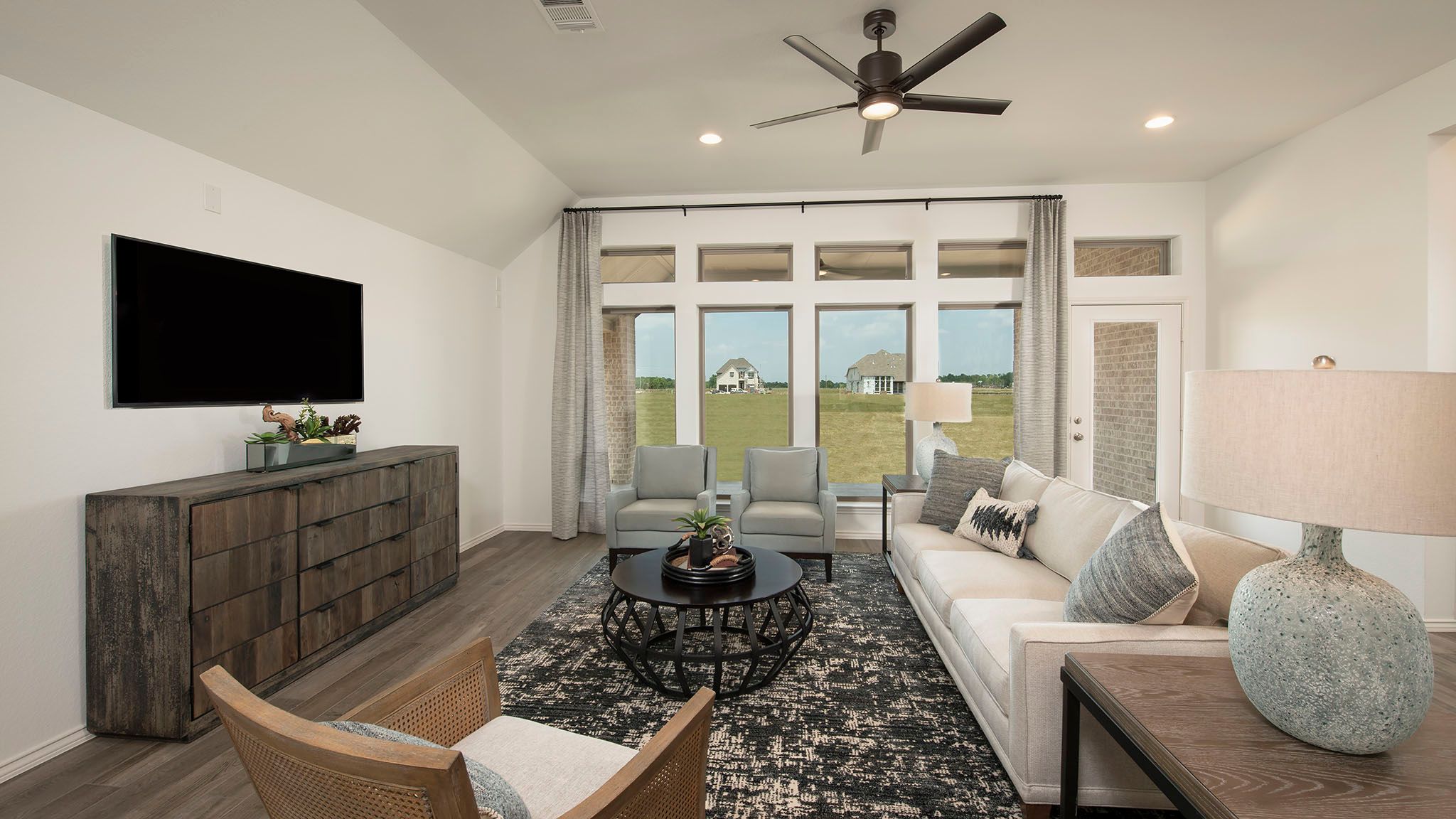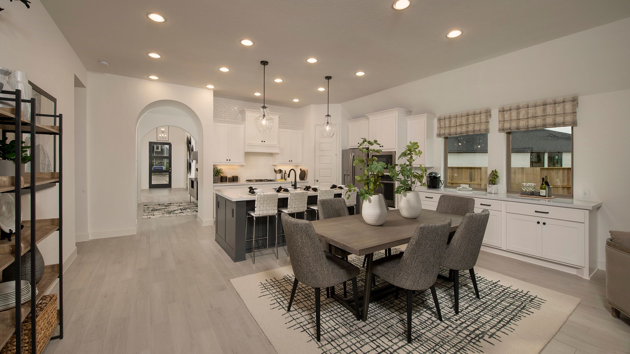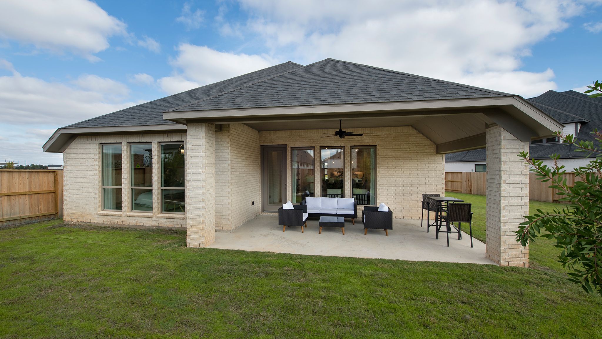 Home office with French doors set at entry with 12-foot ceiling. Extended entry leads to open kitchen, dining area and family room. Kitchen features corner walk-in pantry, generous counter space and island with built-in seating space. Dining area flows into family room with wall of windows. Primary suite includes double-door entry to primary bath with dual vanities, garden tub, separate glass-enclosed shower and two large walk-in closets. A guest suite with private bath adds to this spacious one-story home. Covered backyard patio. Mud room off two-car garage. Representative Images. Features and specifications may vary by community.