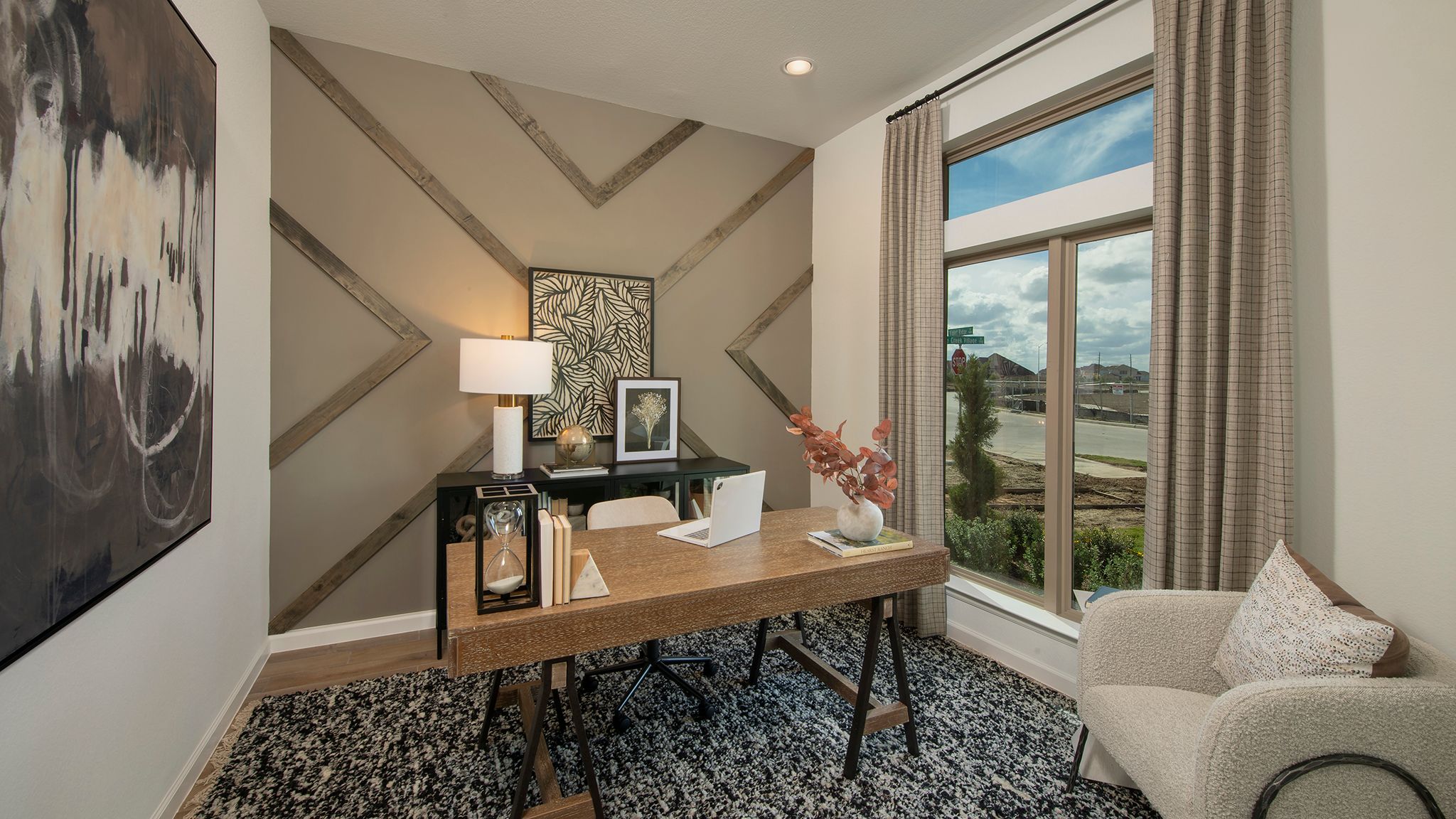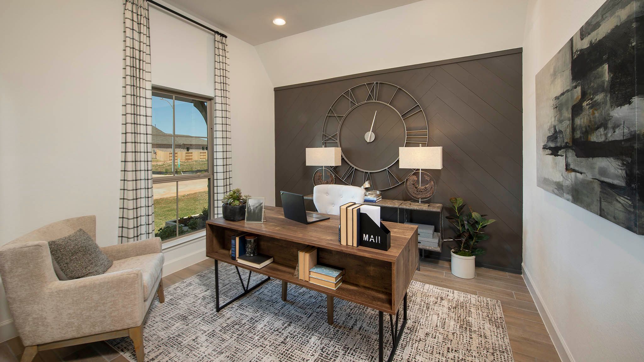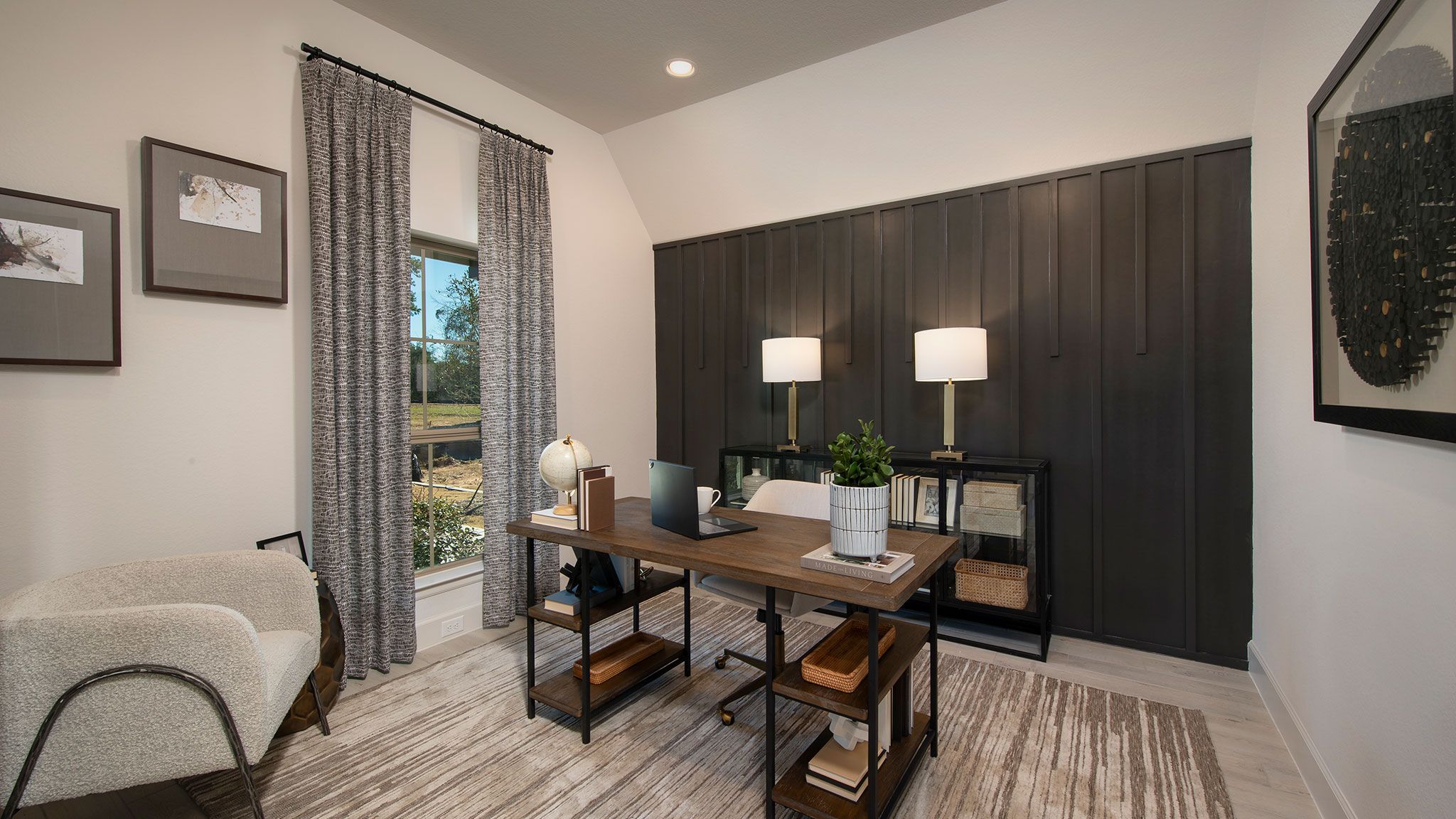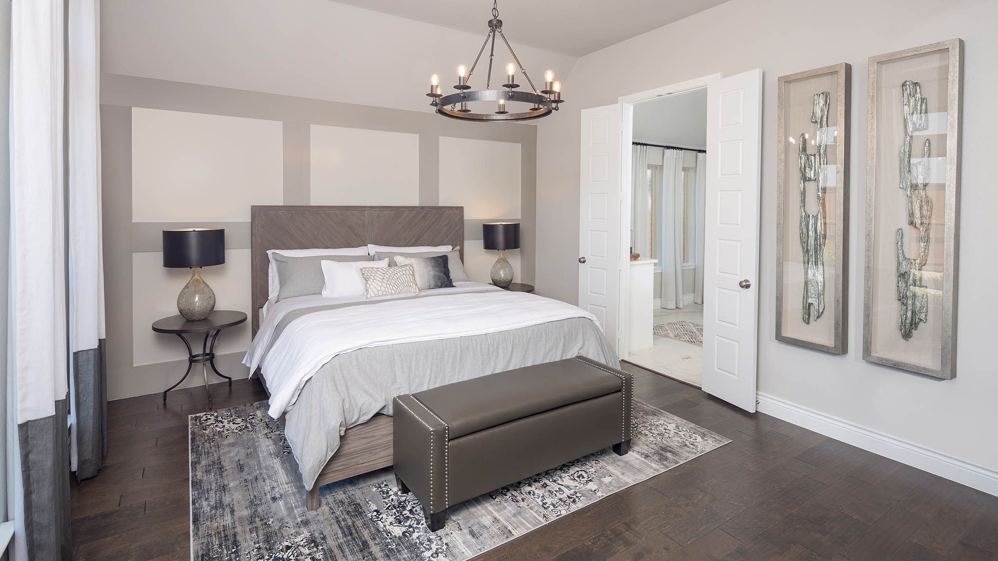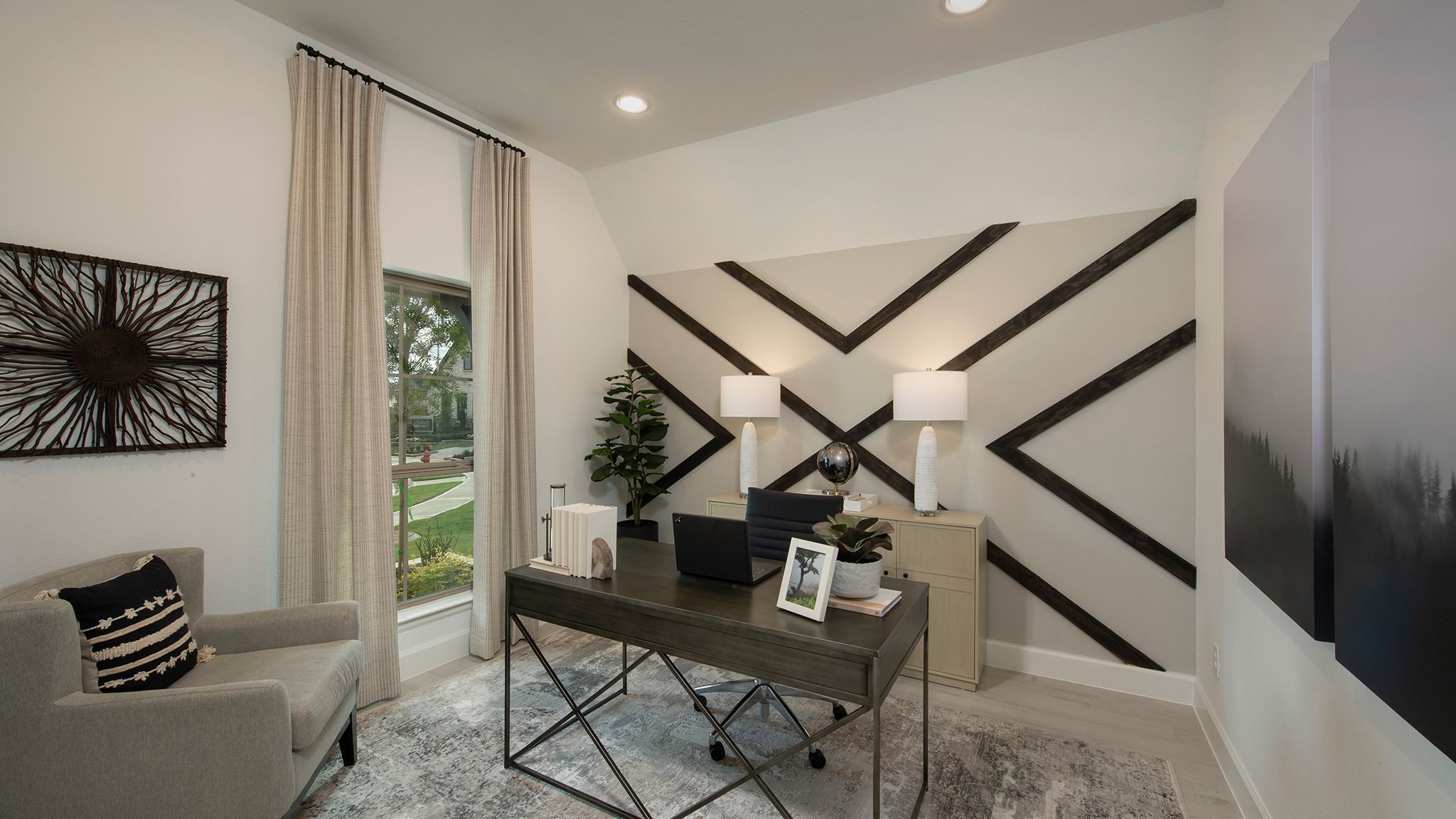 Home office with French doors set at entry with 12-foot ceiling. Extended entry leads to open kitchen, dining area and family room. Kitchen features corner walk-in pantry, generous counter space and island with built-in seating space. Dining area flows into family room with wall of windows. Primary suite includes double-door entry to primary bath with dual vanities, garden tub, separate glass-enclosed shower and two large walk-in closets. A guest suite with private bath adds to this spacious one-story home. Covered backyard patio. Mud room off two-car garage. Representative Images. Features and specifications may vary by community.