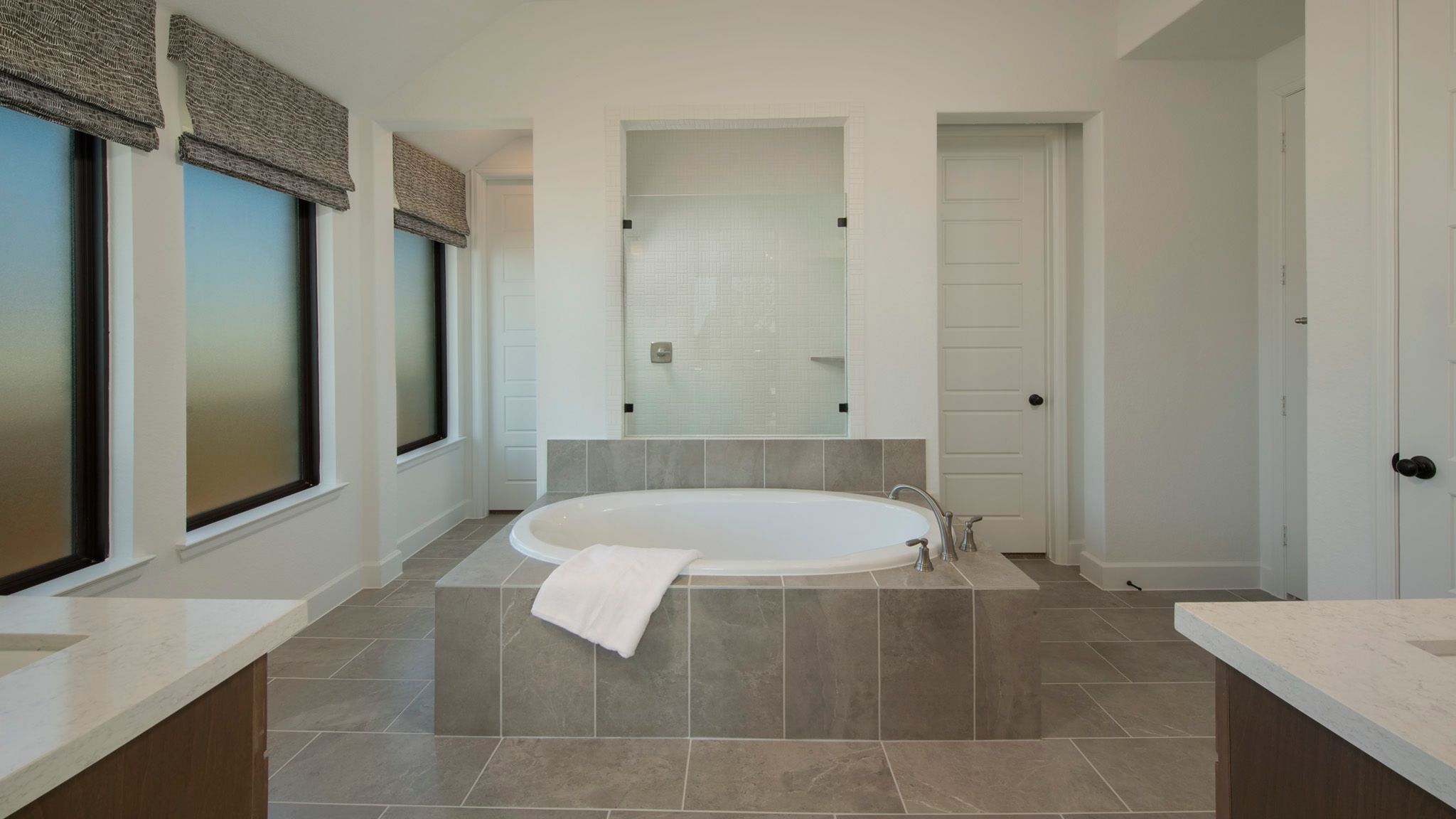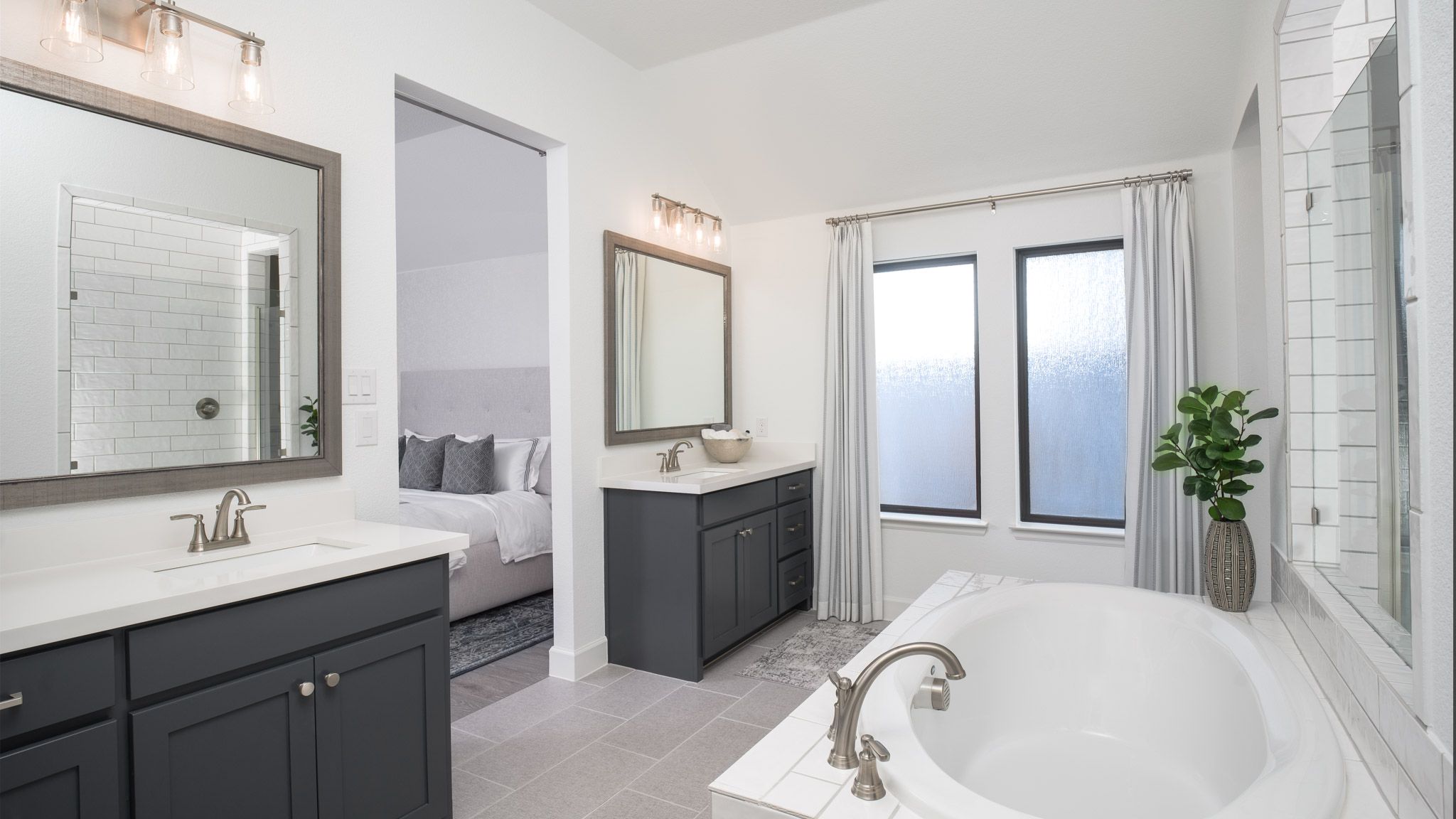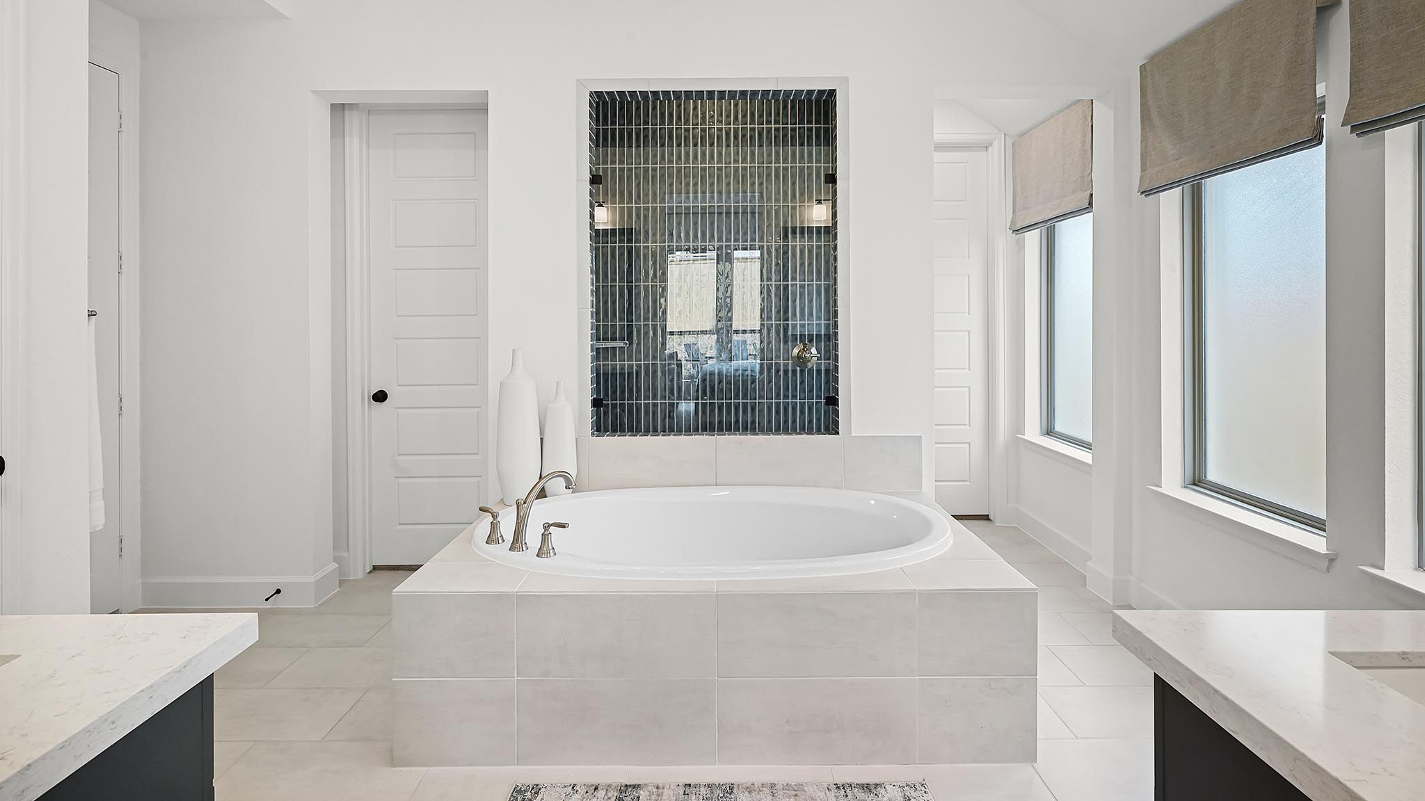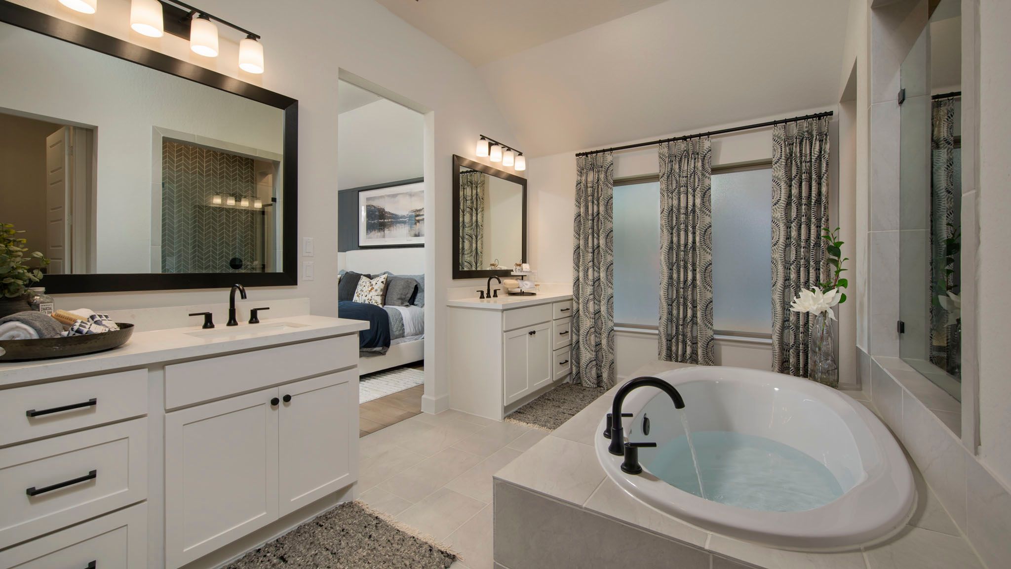 Extended entryway with 12-foot ceilings. Game room with French doors frame the entry. Spacious family room with a wall of windows. Open kitchen offers an island with built-in seating space and a corner walk-in pantry. Primary suite with a wall of windows. Dual vanities, garden tub, separate glass enclosed shower and two walk-in closets in the primary bath. Guest suite just off the extended entry with a full bathroom and walk-in closet. Secondary bedrooms with walk-in closets. Utility room with private access to the primary bathroom. Covered backyard patio. Mud room just off the two-car garage. Representative Images. Features and specifications may vary by community.