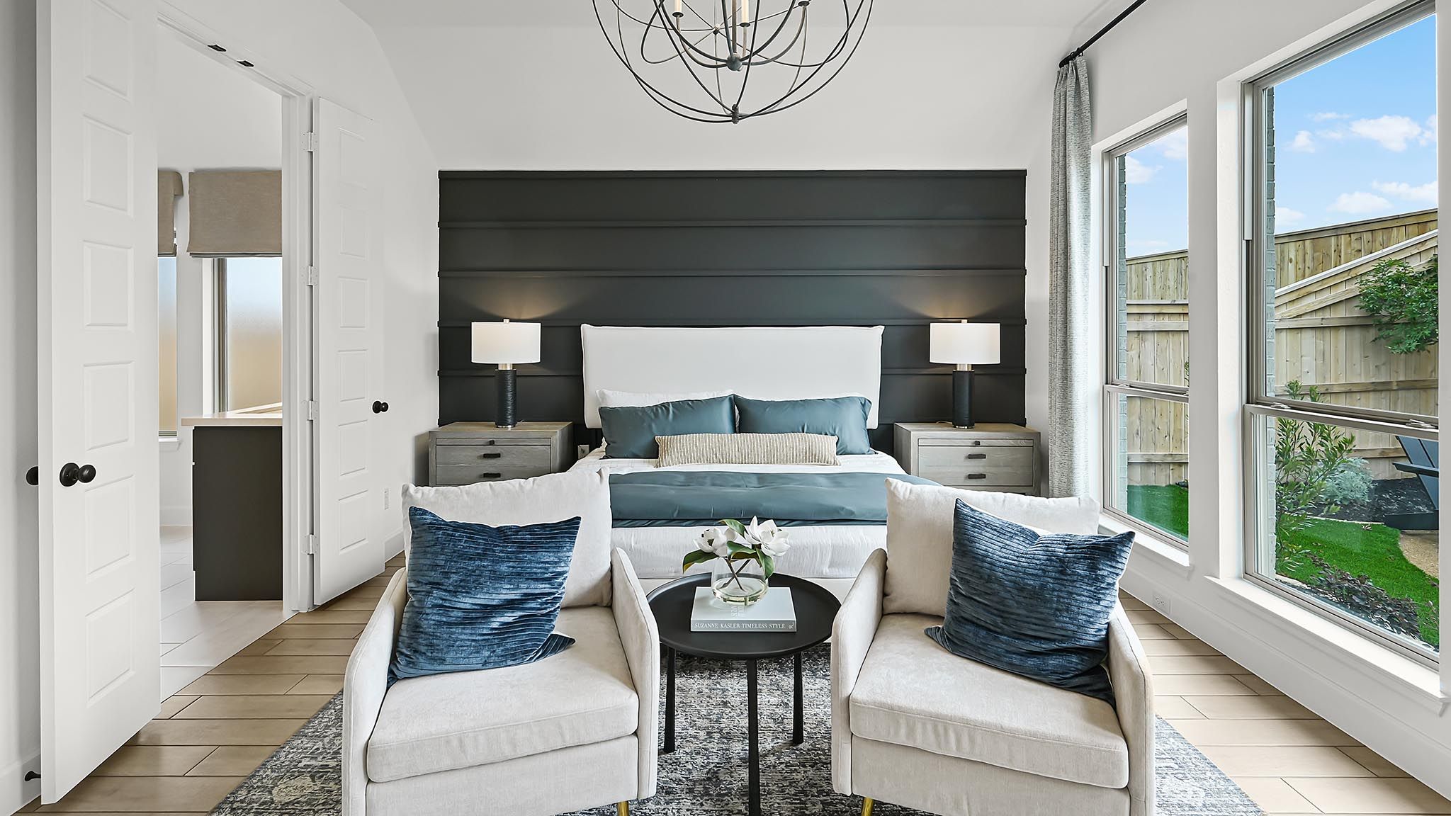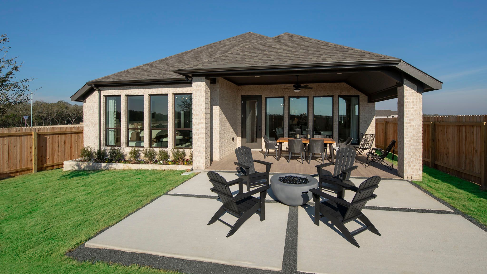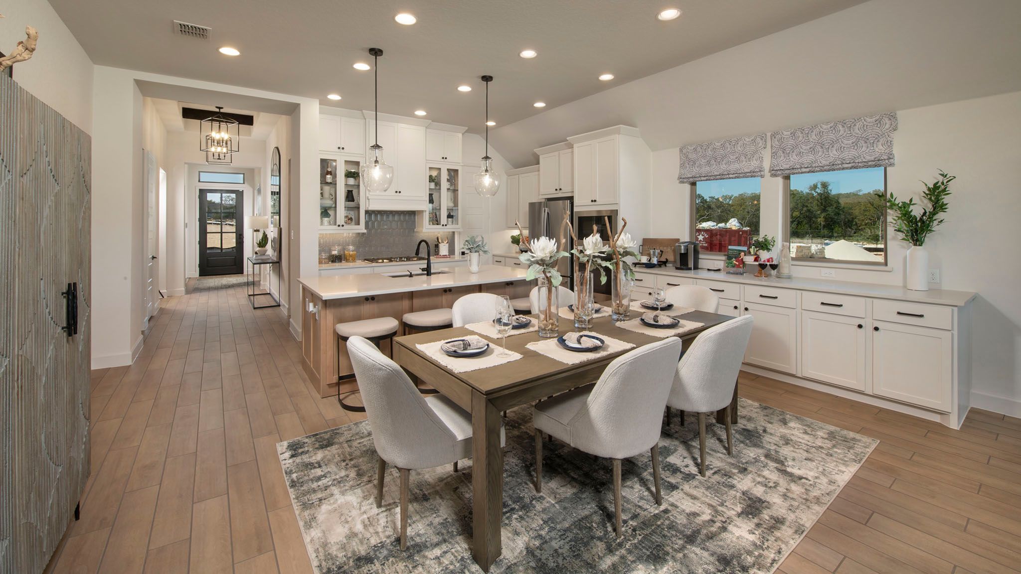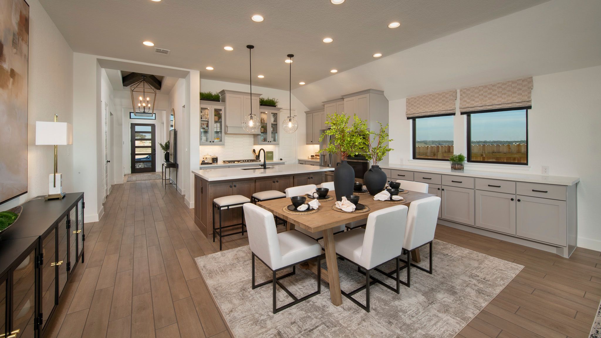 Extended entryway with 12-foot ceilings. Game room with French doors frame the entry. Spacious family room with a wall of windows. Open kitchen offers an island with built-in seating space and a corner walk-in pantry. Primary suite with a wall of windows. Dual vanities, garden tub, separate glass enclosed shower and two walk-in closets in the primary bath. Guest suite just off the extended entry with a full bathroom and walk-in closet. Secondary bedrooms with walk-in closets. Utility room with private access to the primary bathroom. Covered backyard patio. Mud room just off the two-car garage. Representative Images. Features and specifications may vary by community.