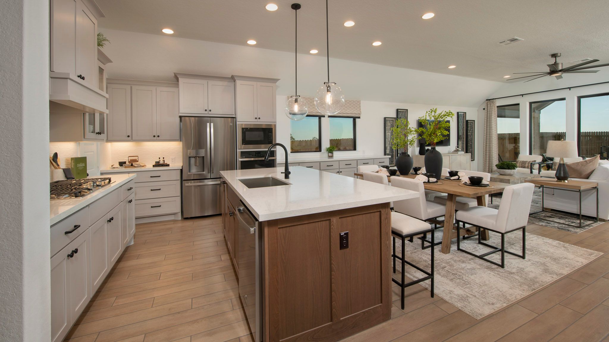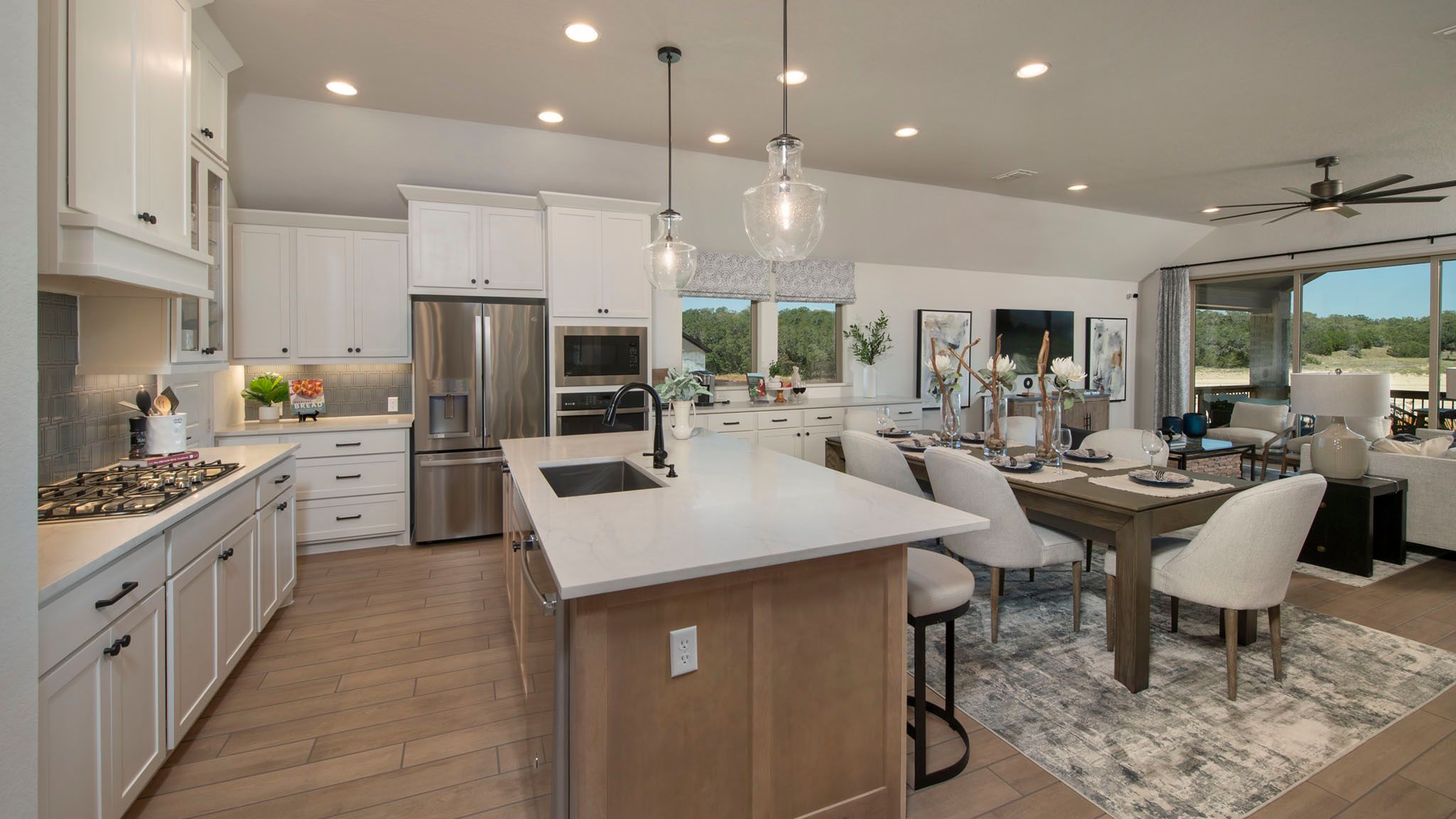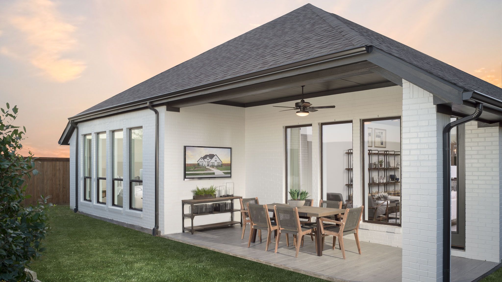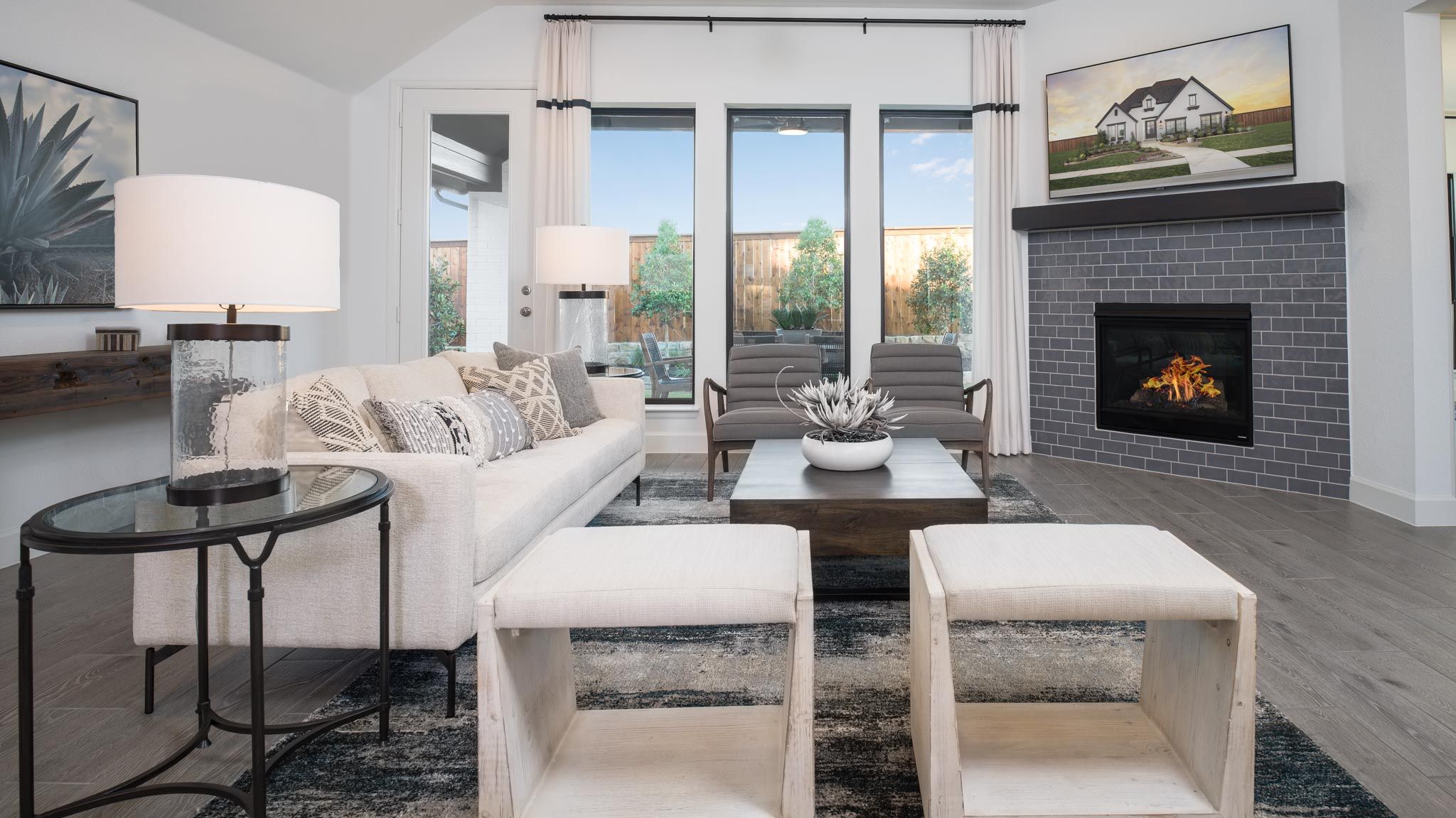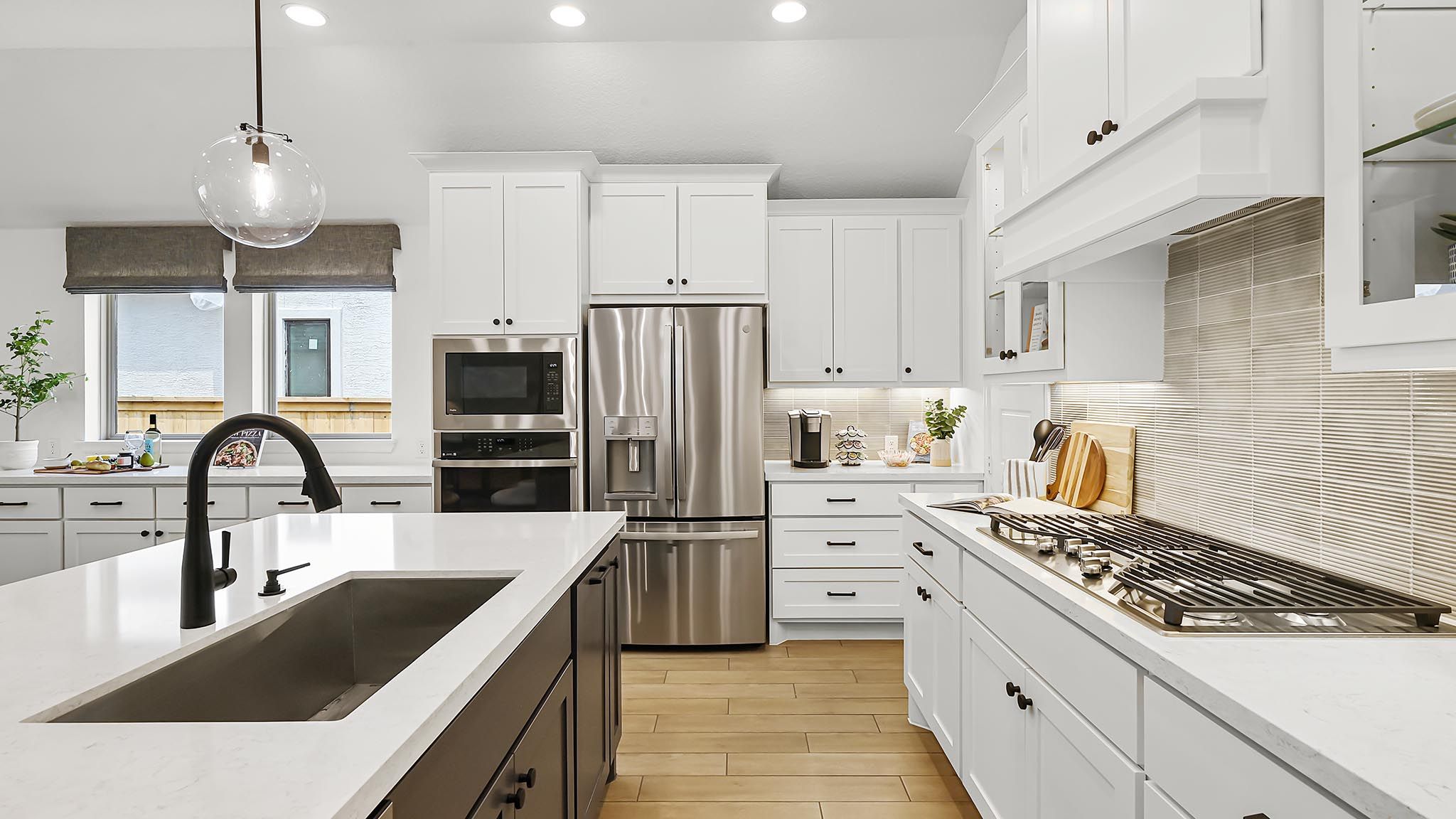 Extended entryway with 12-foot ceilings. Game room with French doors frame the entry. Spacious family room with a wall of windows. Open kitchen offers an island with built-in seating space and a corner walk-in pantry. Primary suite with a wall of windows. Dual vanities, garden tub, separate glass enclosed shower and two walk-in closets in the primary bath. Guest suite just off the extended entry with a full bathroom and walk-in closet. Secondary bedrooms with walk-in closets. Utility room with private access to the primary bathroom. Covered backyard patio. Mud room just off the two-car garage. Representative Images. Features and specifications may vary by community.