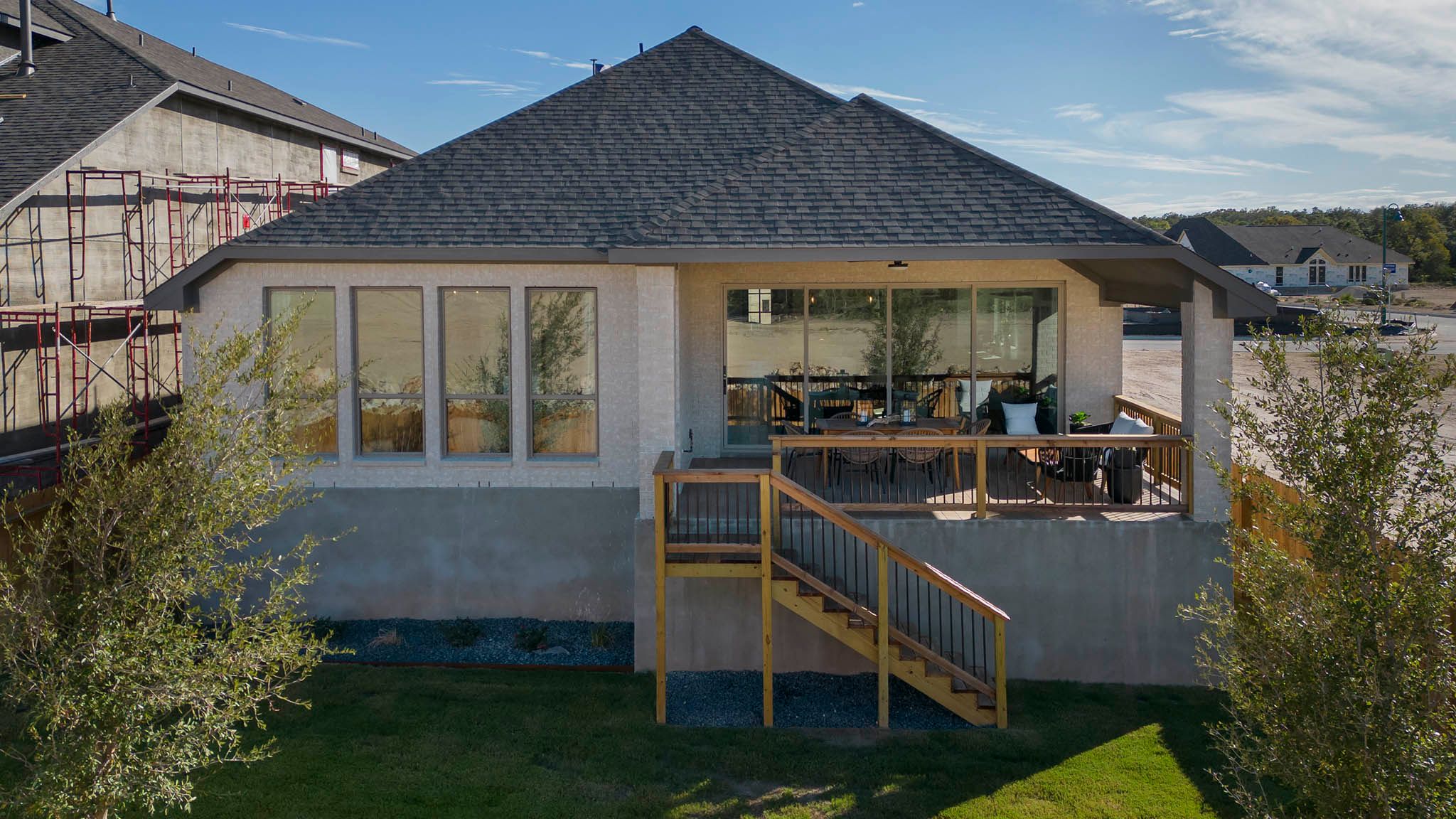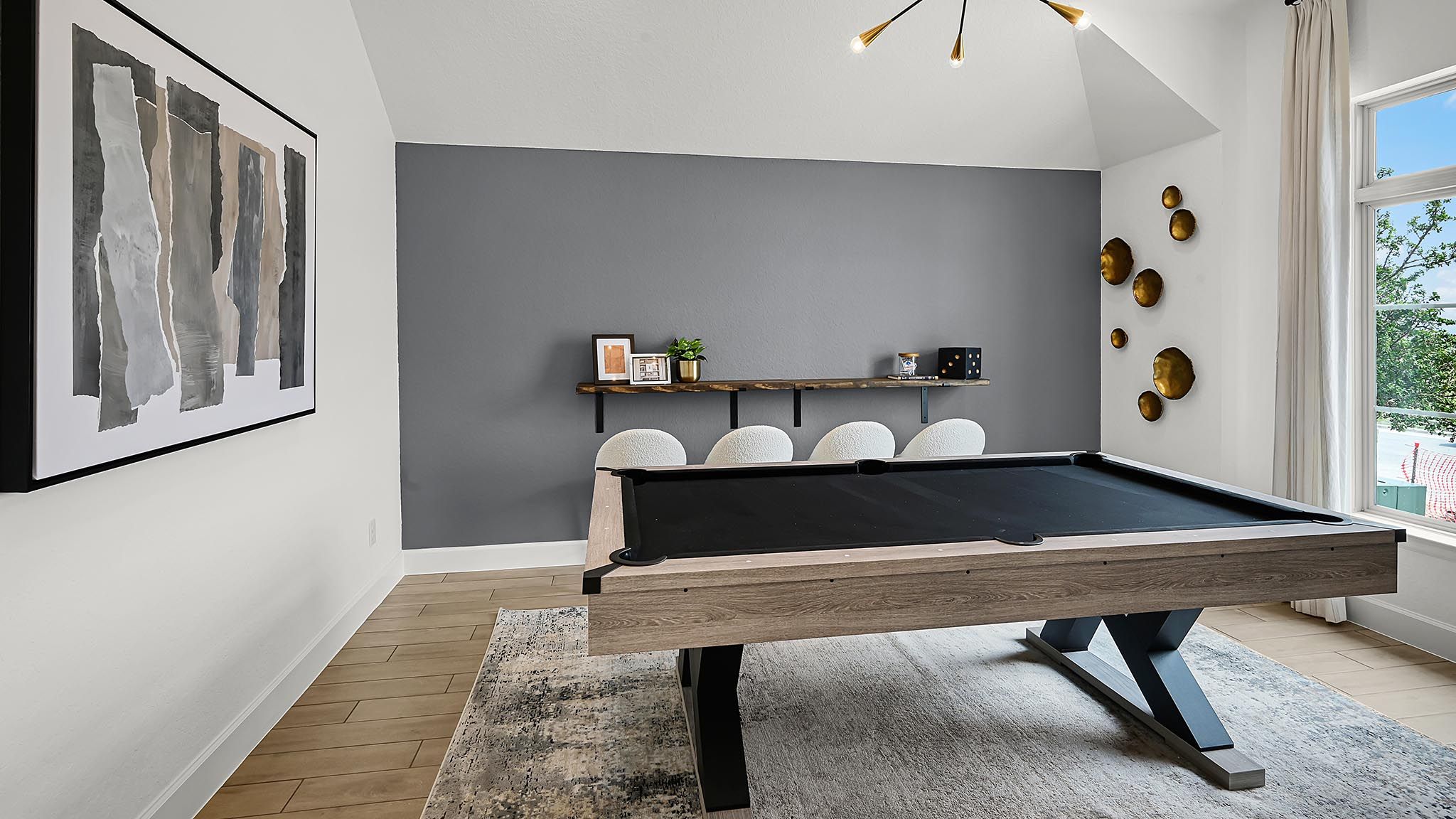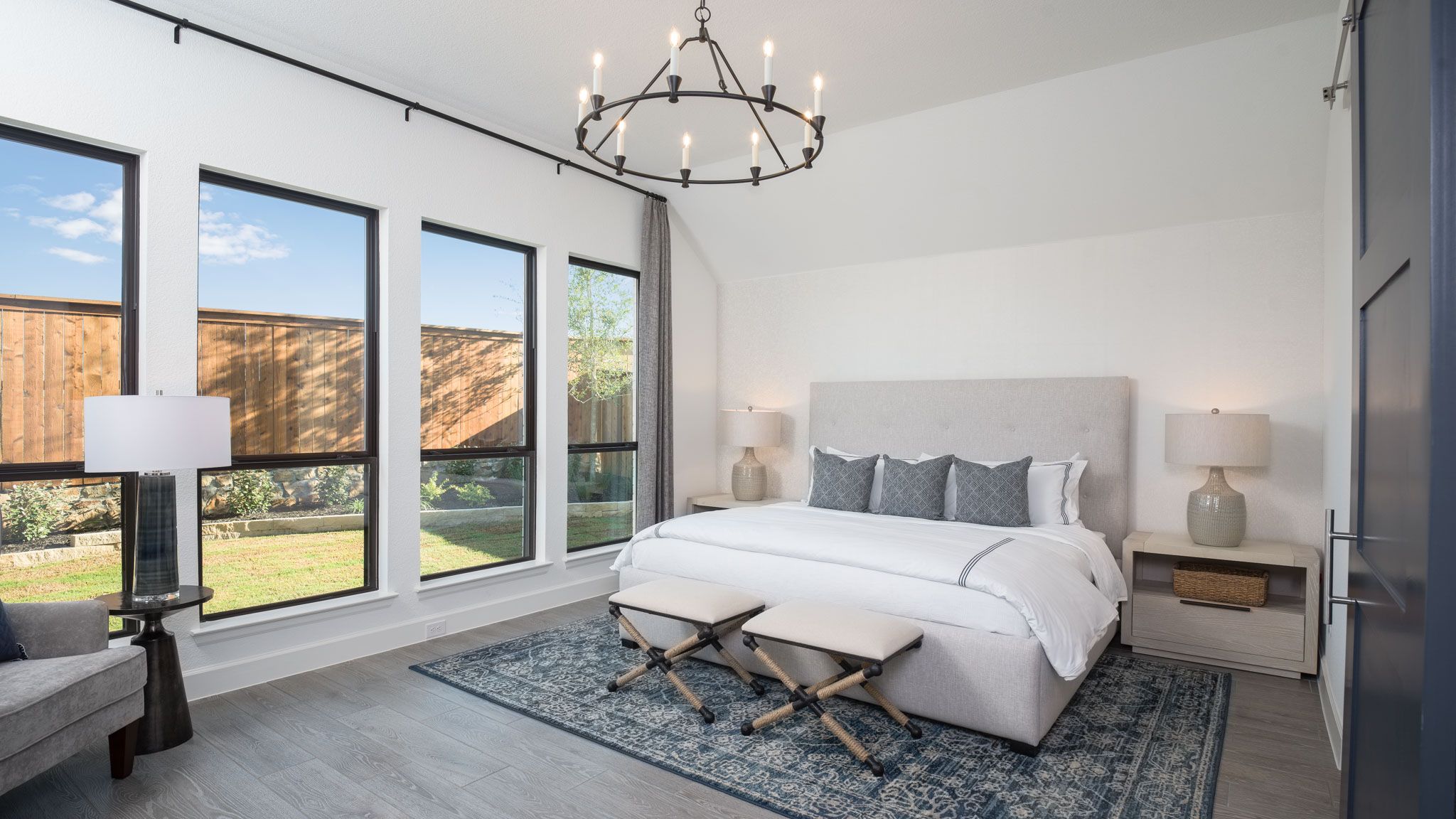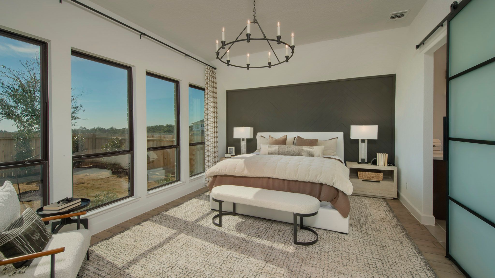 Extended entryway with 12-foot ceilings. Game room with French doors frame the entry. Spacious family room with a wall of windows. Open kitchen offers an island with built-in seating space and a corner walk-in pantry. Primary suite with a wall of windows. Dual vanities, garden tub, separate glass enclosed shower and two walk-in closets in the primary bath. Guest suite just off the extended entry with a full bathroom and walk-in closet. Secondary bedrooms with walk-in closets. Utility room with private access to the primary bathroom. Covered backyard patio. Mud room just off the two-car garage. Representative Images. Features and specifications may vary by community.