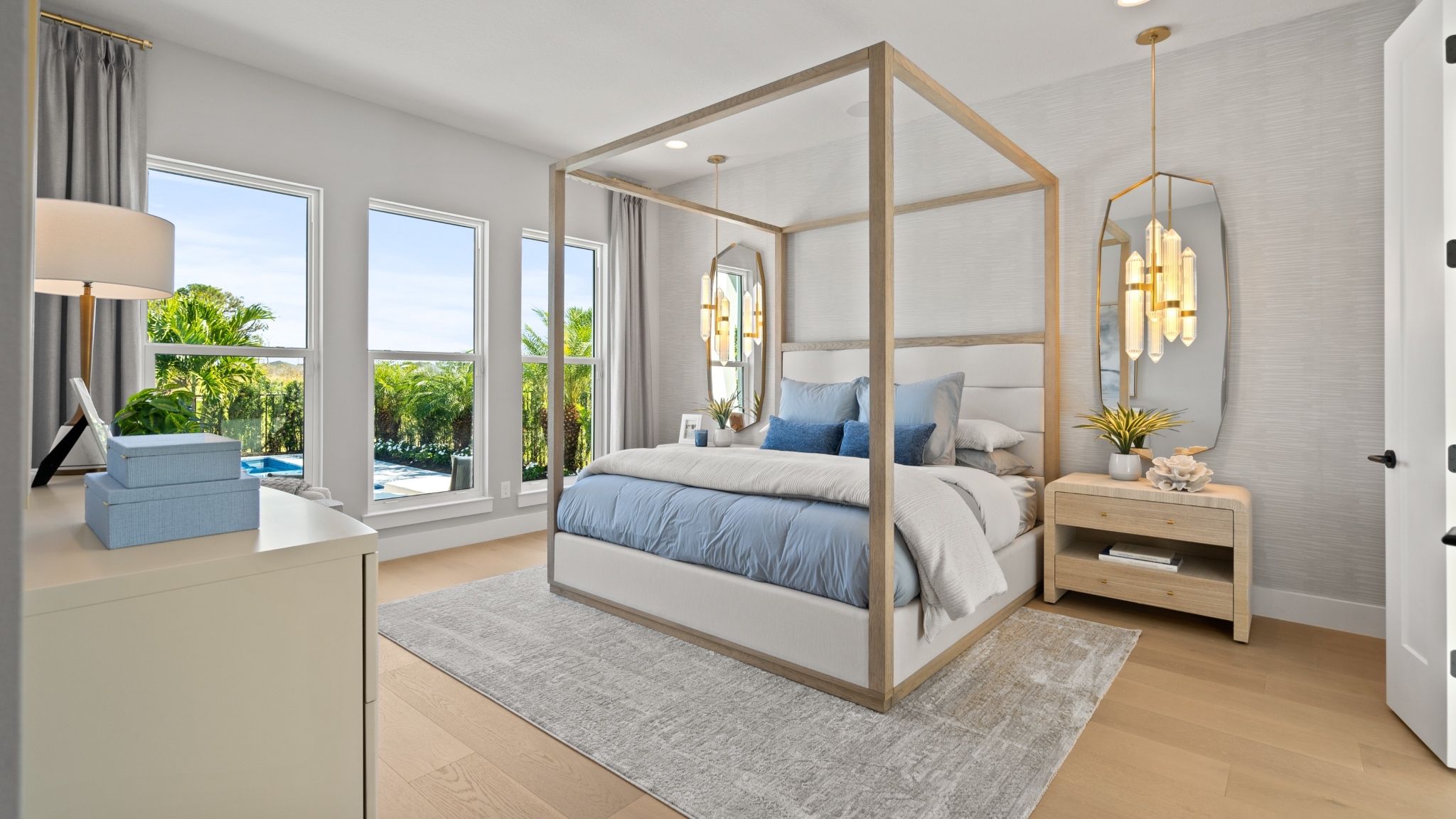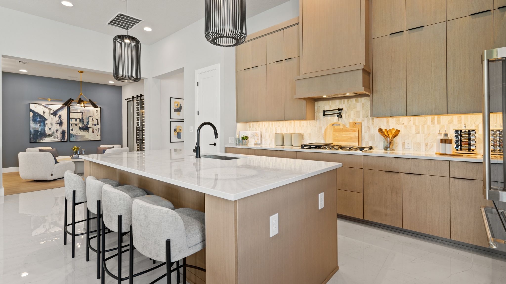 The covered front porch opens into the entryway with an extended ceiling. Two secondary bedrooms each with their own walk-in closet and adjoined by a Hollywood bathroom are off the main hallway. Adjacent is a secluded guest suite with a private bathroom just off the garage. The kitchen boasts an island with built-in seating, ample counter space, and a large walk-in pantry. An adjoining flex room is right off the kitchen space. The dining area connects to the open family room which boasts a wall of windows and access to the backyard covered lanai. The laundry room is centrally located off the main living areas and is adjacent to the private home office featuring French doors and a view of the backyard landscape. The primary bedroom boasts three large windows allowing in natural light. Doubl...