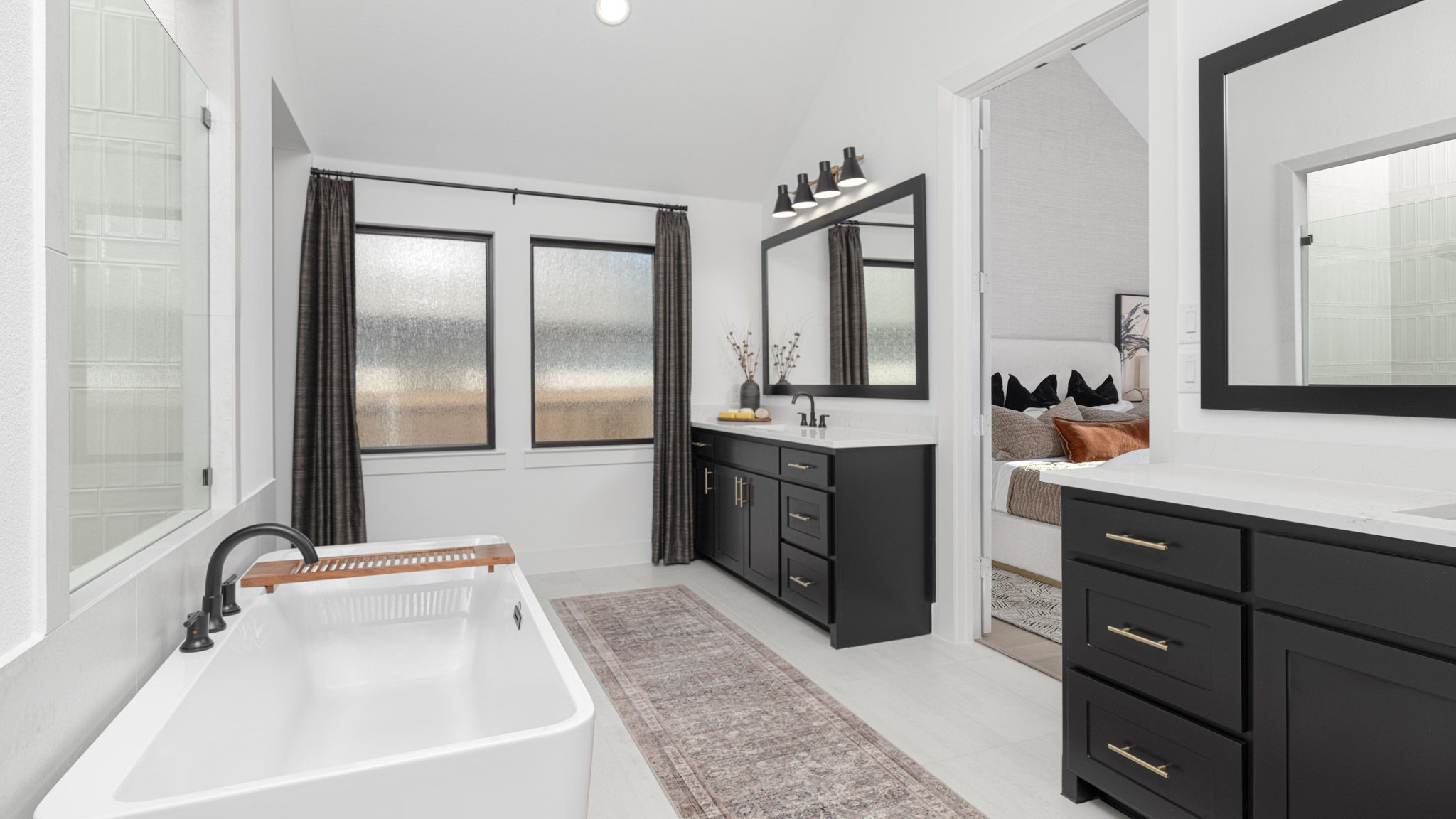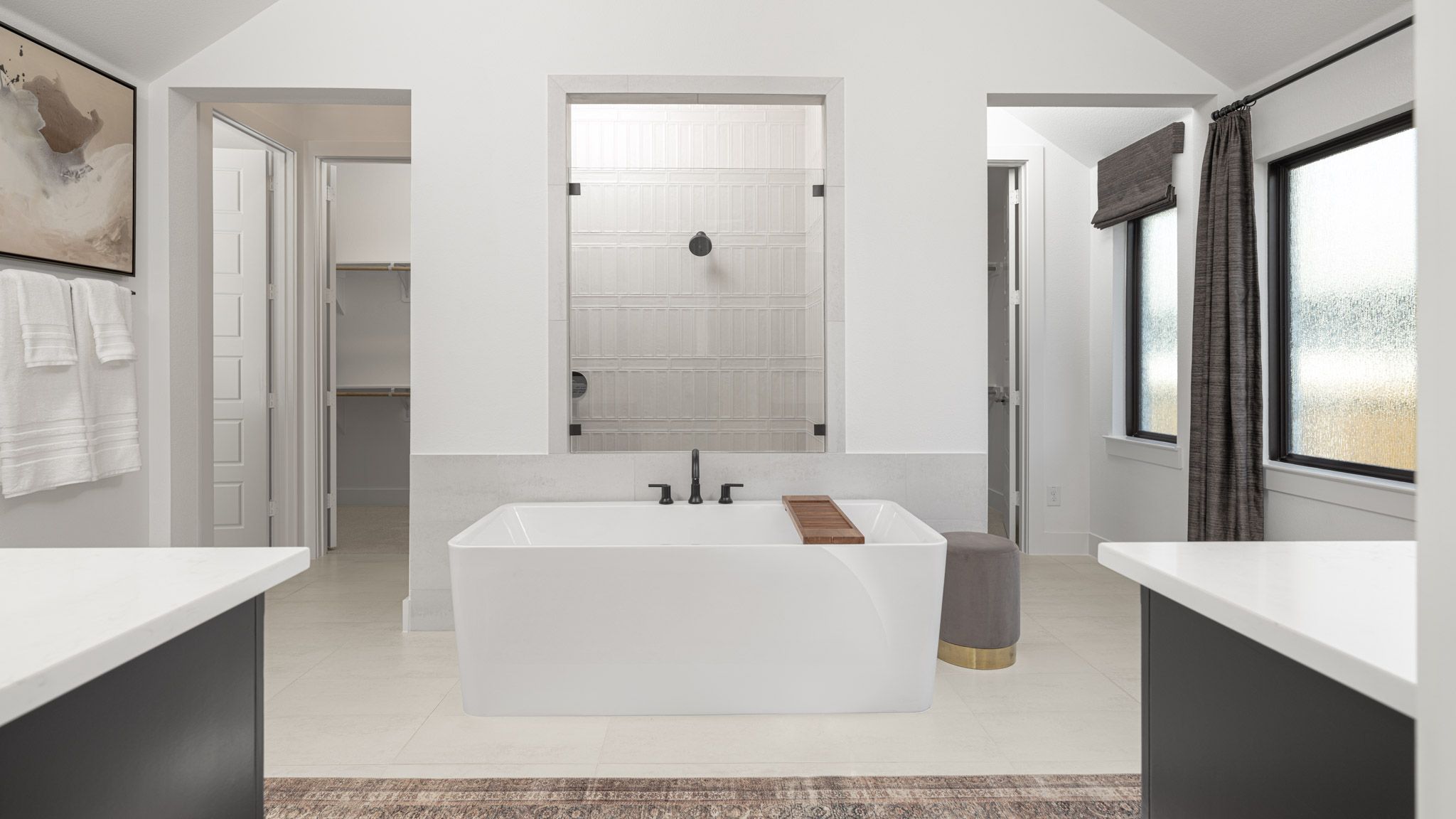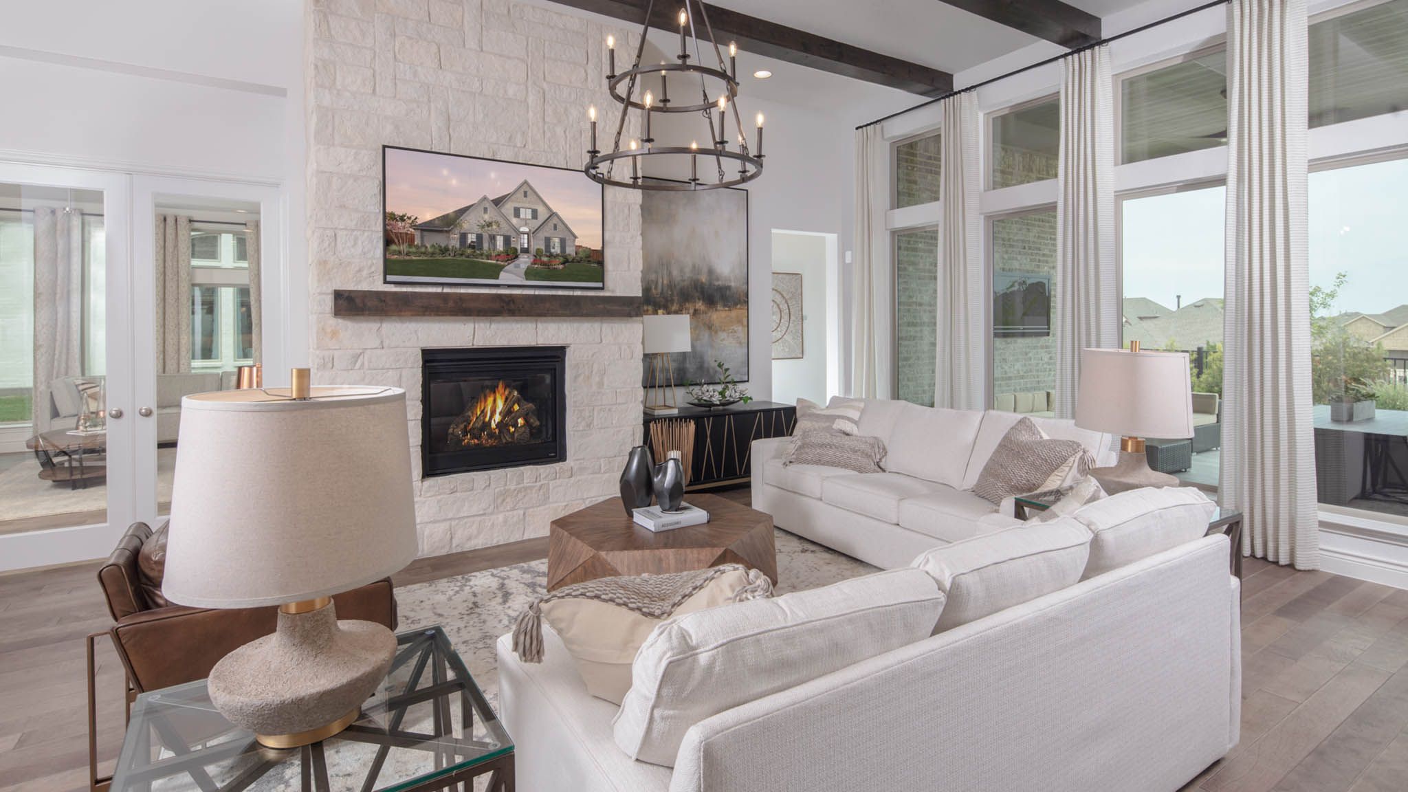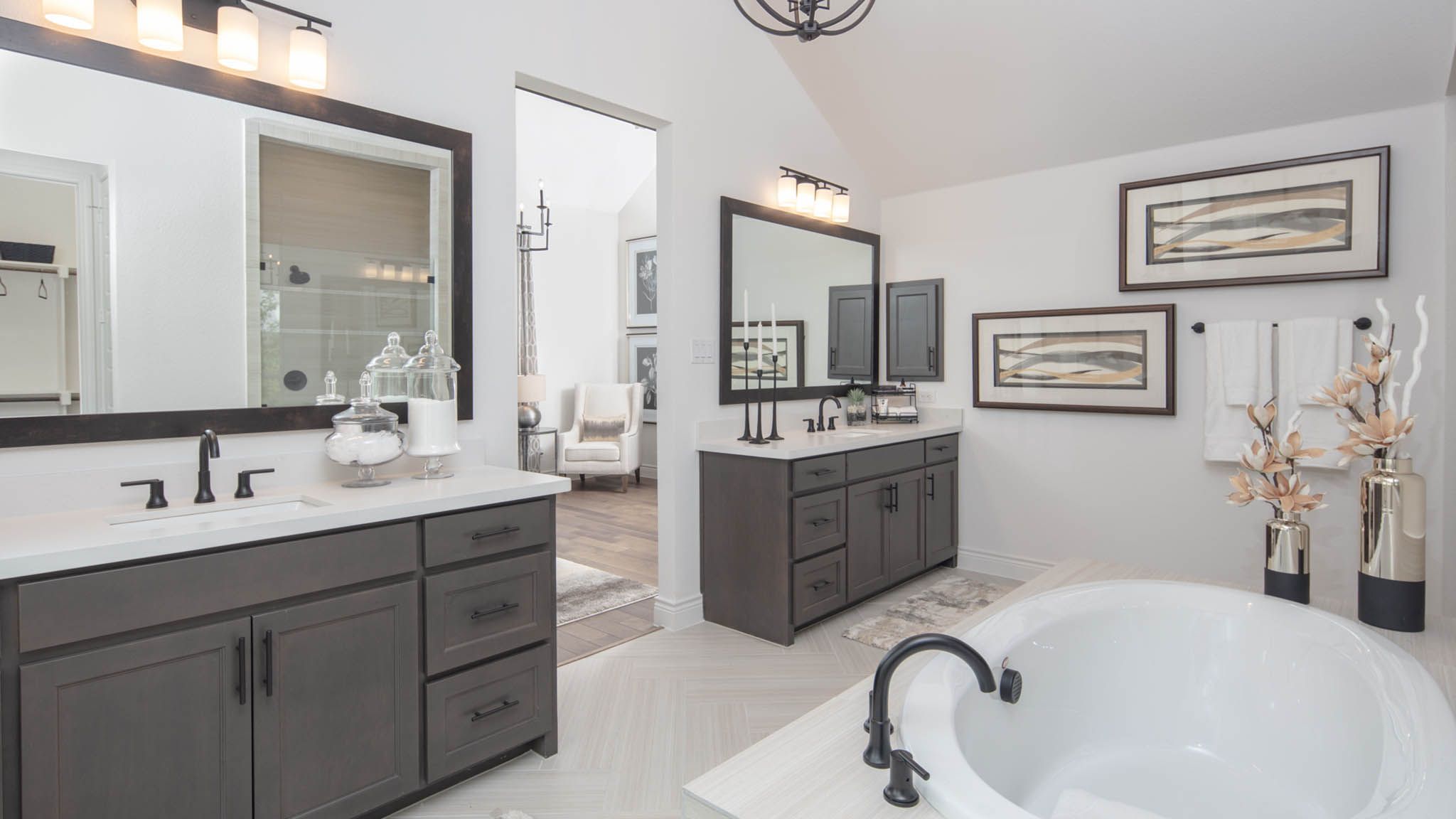Extended entry leads to open family room, kitchen and dining area. Family room features wall of windows. Kitchen hosts island with built-in seating space. Game room with French doors just off family room. Secluded primary suite. Dual vanities, garden tub, separate glass-enclosed shower and two large walk-in closets in primary bath. A Hollywood bath, high ceilings, large windows and abundant closet space add to this one-story design. Covered backyard patio. Mud room off three-car garage. Representative Images. Features and specifications may vary by community.