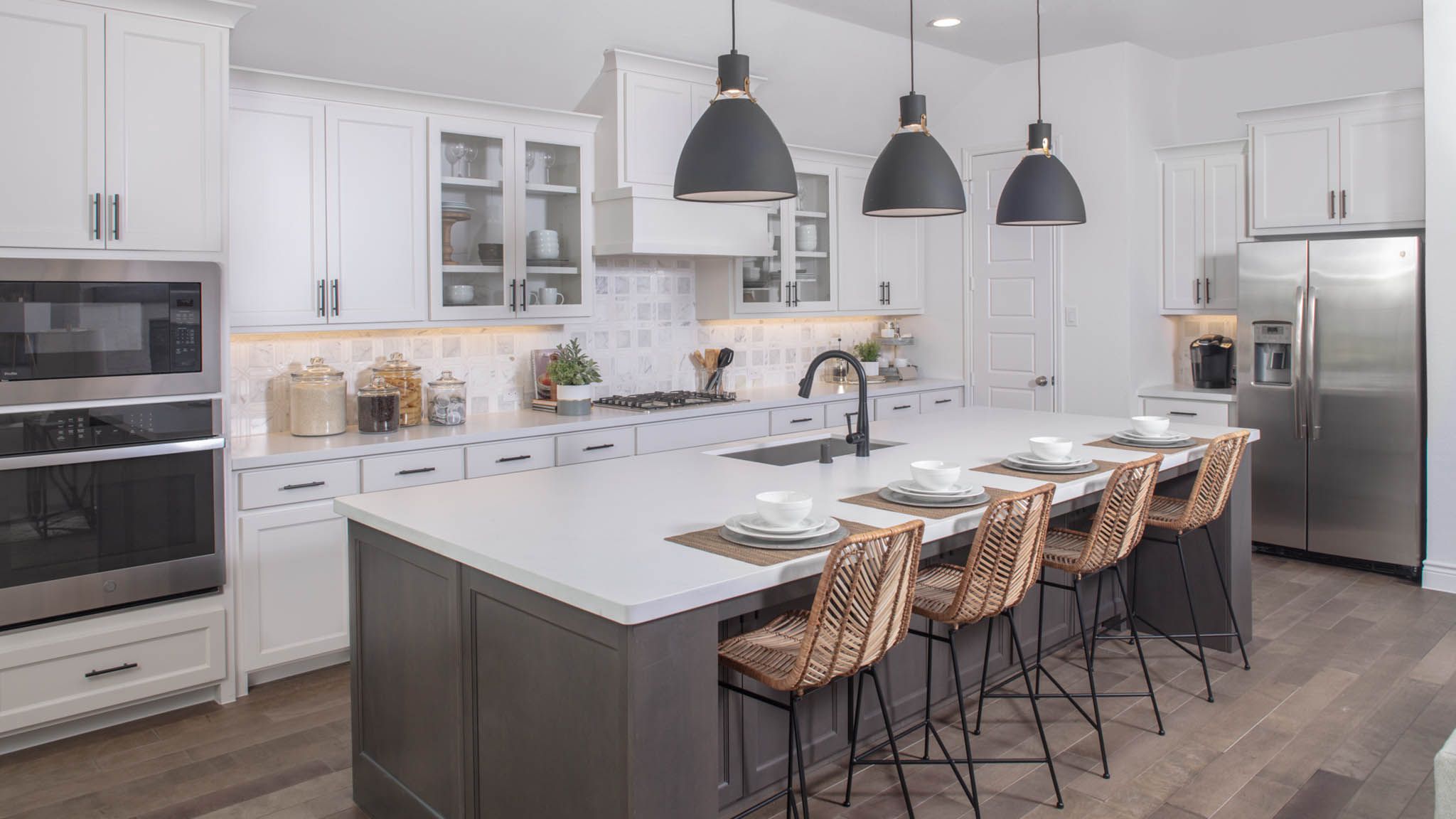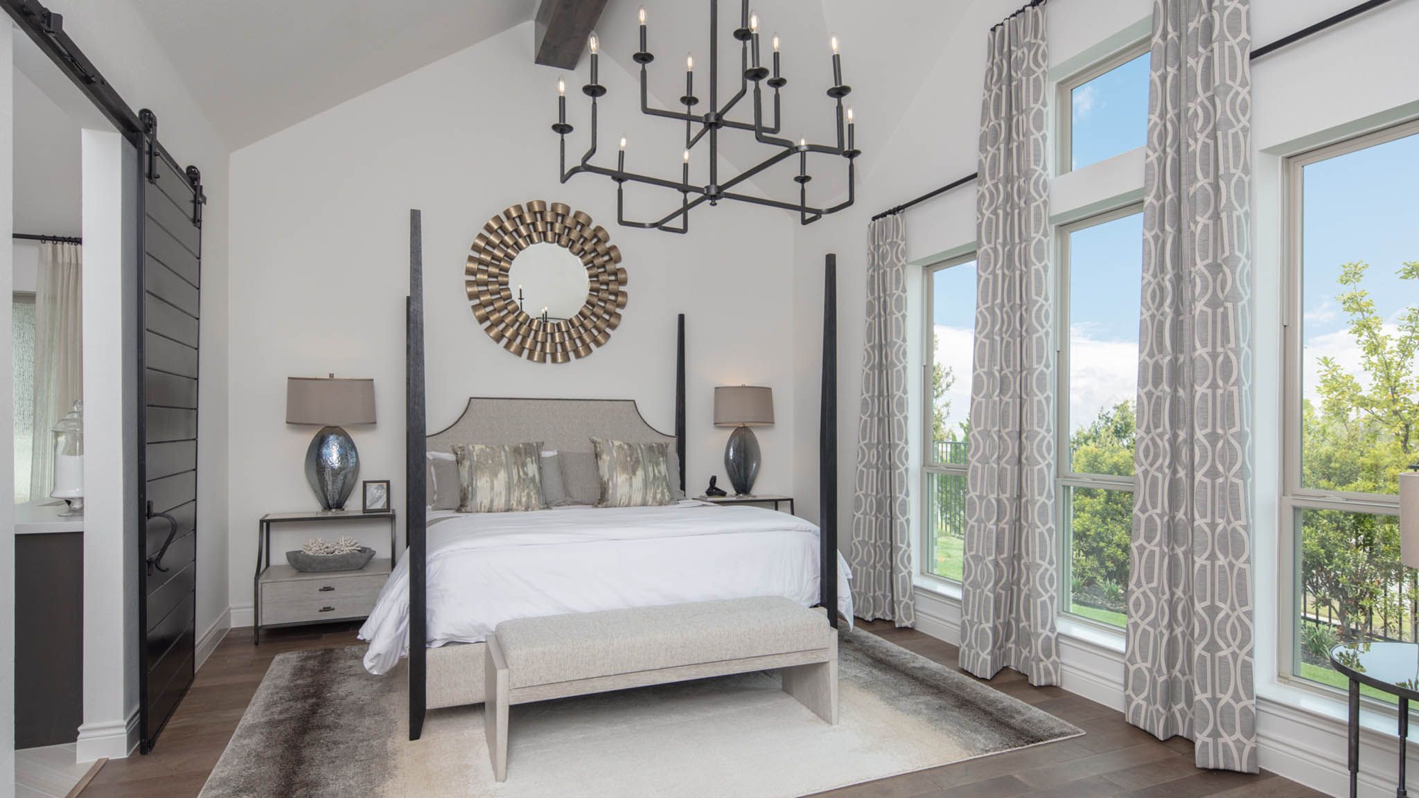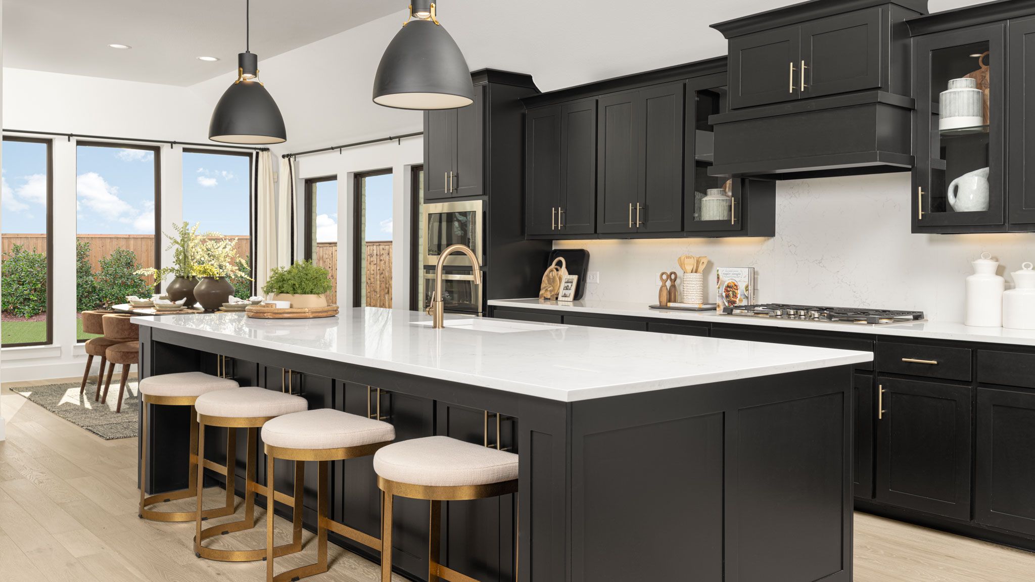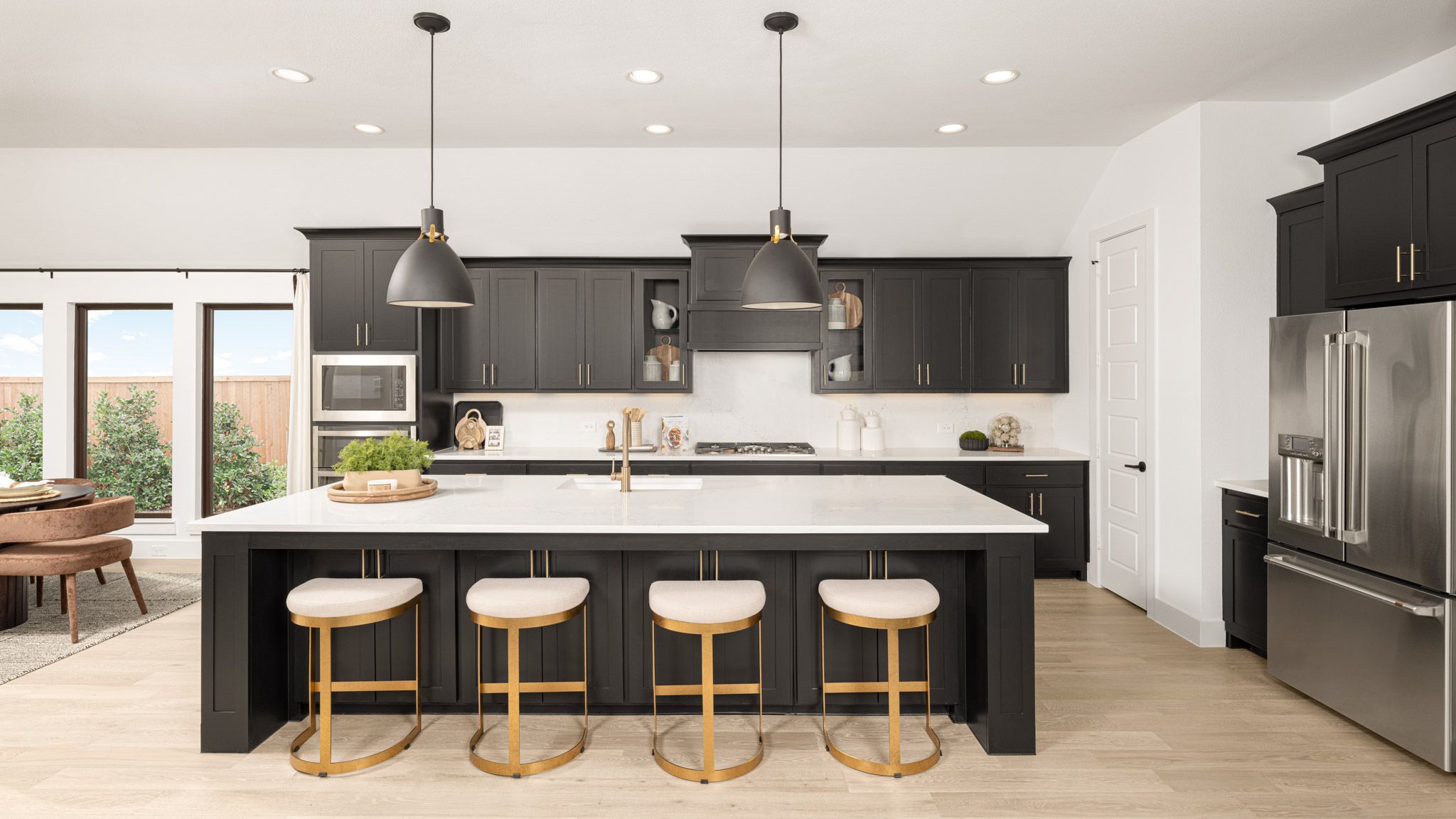Extended entry leads to open family room, kitchen and dining area. Family room features wall of windows. Kitchen hosts island with built-in seating space. Game room with French doors just off family room. Secluded primary suite. Dual vanities, garden tub, separate glass-enclosed shower and two large walk-in closets in primary bath. A Hollywood bath, high ceilings, large windows and abundant closet space add to this one-story design. Covered backyard patio. Mud room off three-car garage. Representative Images. Features and specifications may vary by community.
