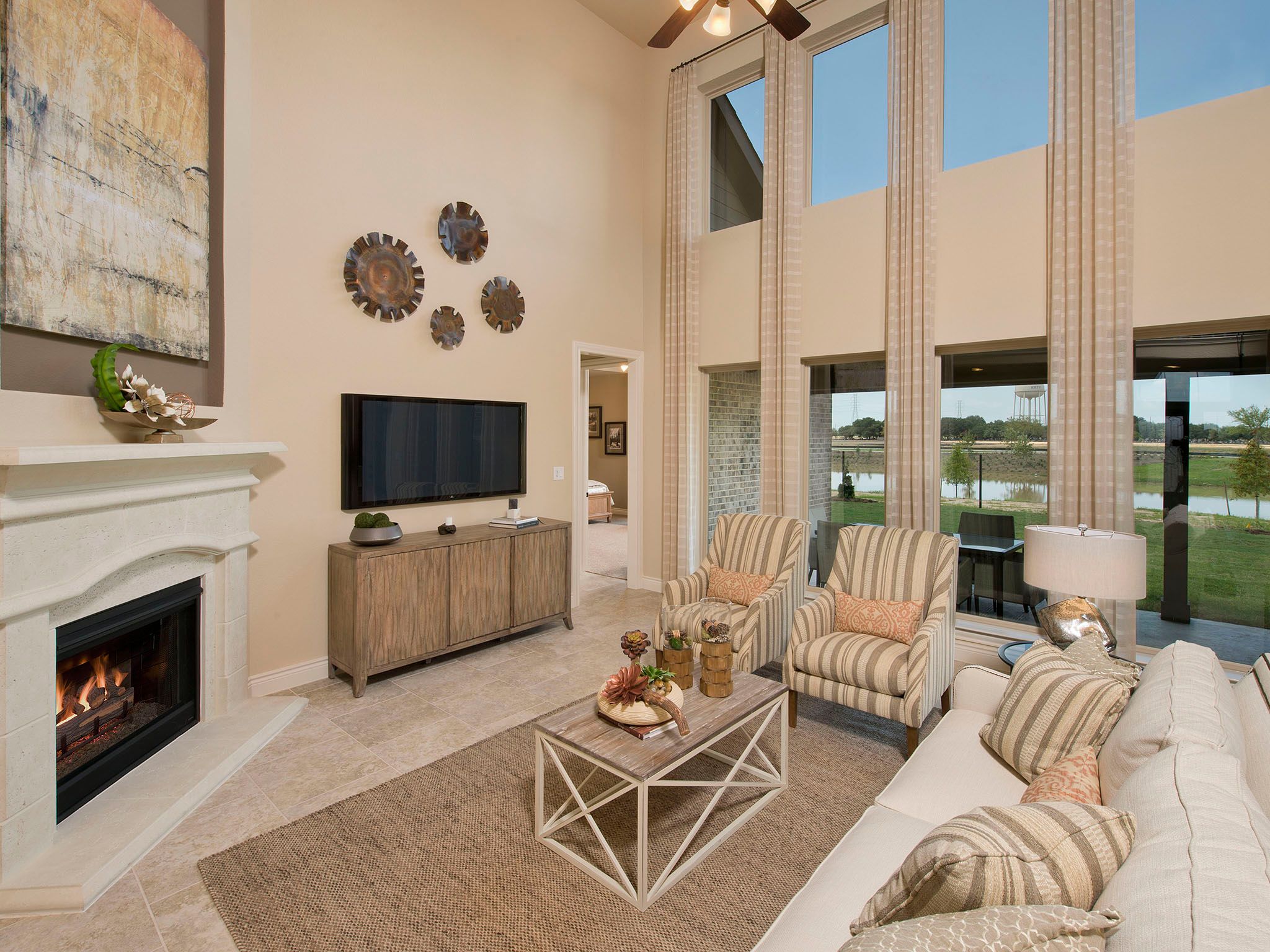 Two-story rotunda entry. Family room with a wall of windows. Home office with French doors and formal dining room. Kitchen features island with built-in seating space, walk-in pantry and Butler's pantry. Kitchen also opens to morning area and family room. Secluded primary bedroom. Primary bath includes corner garden tub, separate glass-enclosed shower, dual vanities, two walk-in closets and a linen closet. Game room, media room, secondary bedrooms and Hollywood bath complete the second floor. Abundant closet space. Covered backyard patio. Mud room just off the three-car garage. Representative Images. Features and specifications may vary by community.
