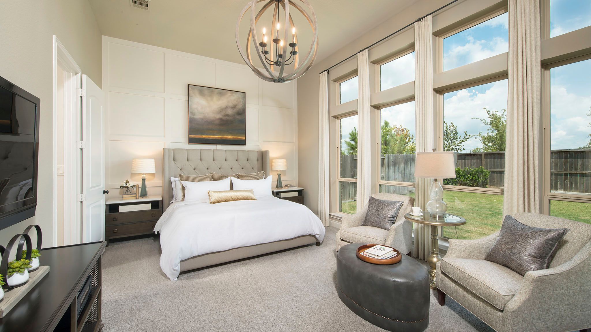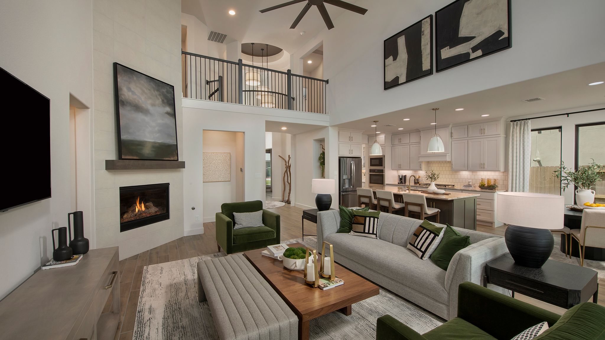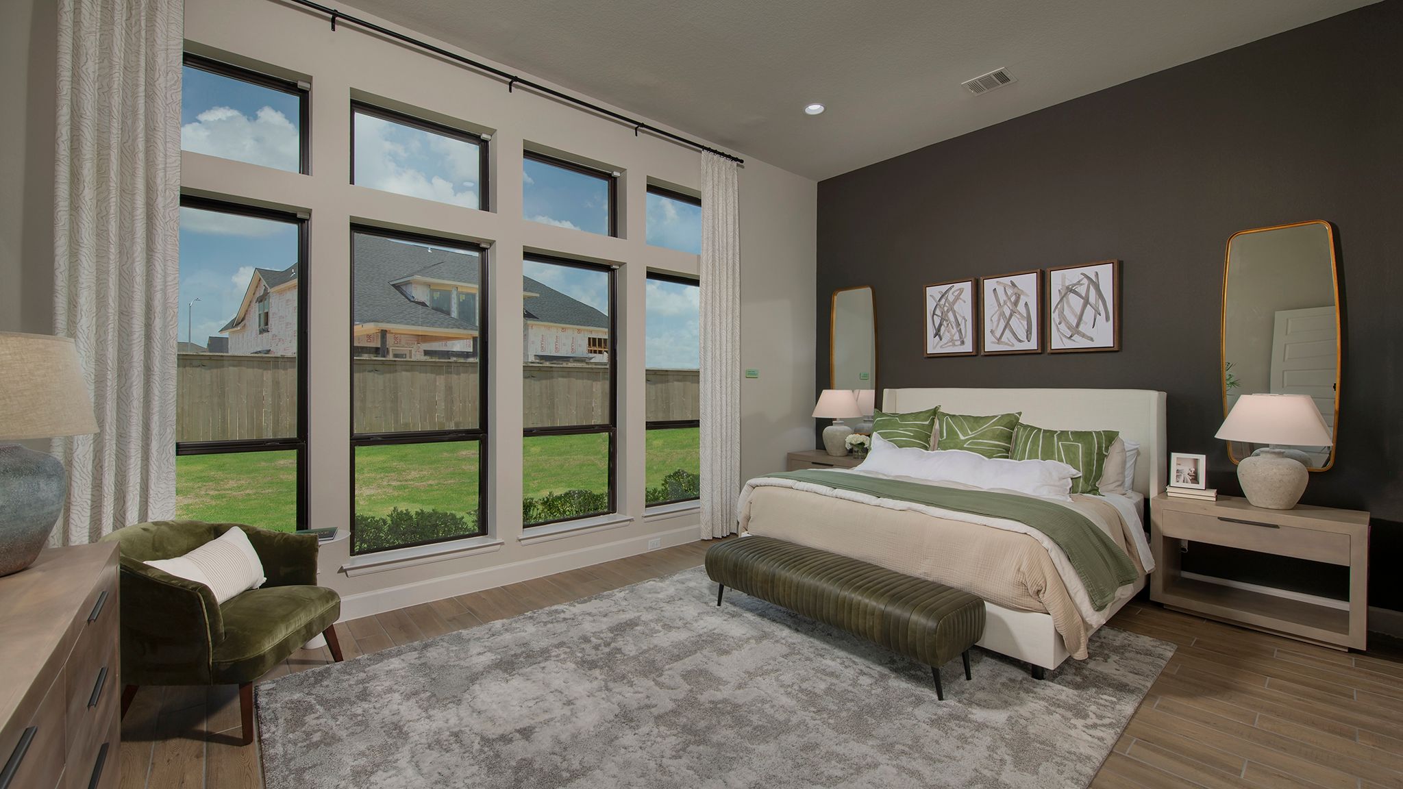Two-story entry features curved staircase. Formal dining room and home office with French doors frame entry. Two-story family room with wall of windows opens to kitchen and morning area. Kitchen features walk-in pantry, butler's pantry and island with built-in seating space. First-floor primary suite includes bedroom with 12-foot ceiling and wall of windows. Dual vanities, corner garden tub, separate glass-enclosed shower and two walk-in closets in primary bath. A second bedroom is downstairs. A game room, Hollywood bathroom and secondary bedrooms are upstairs. Covered backyard patio. Mud room off three-car garage. Representative Images. Features and specifications may vary by community.