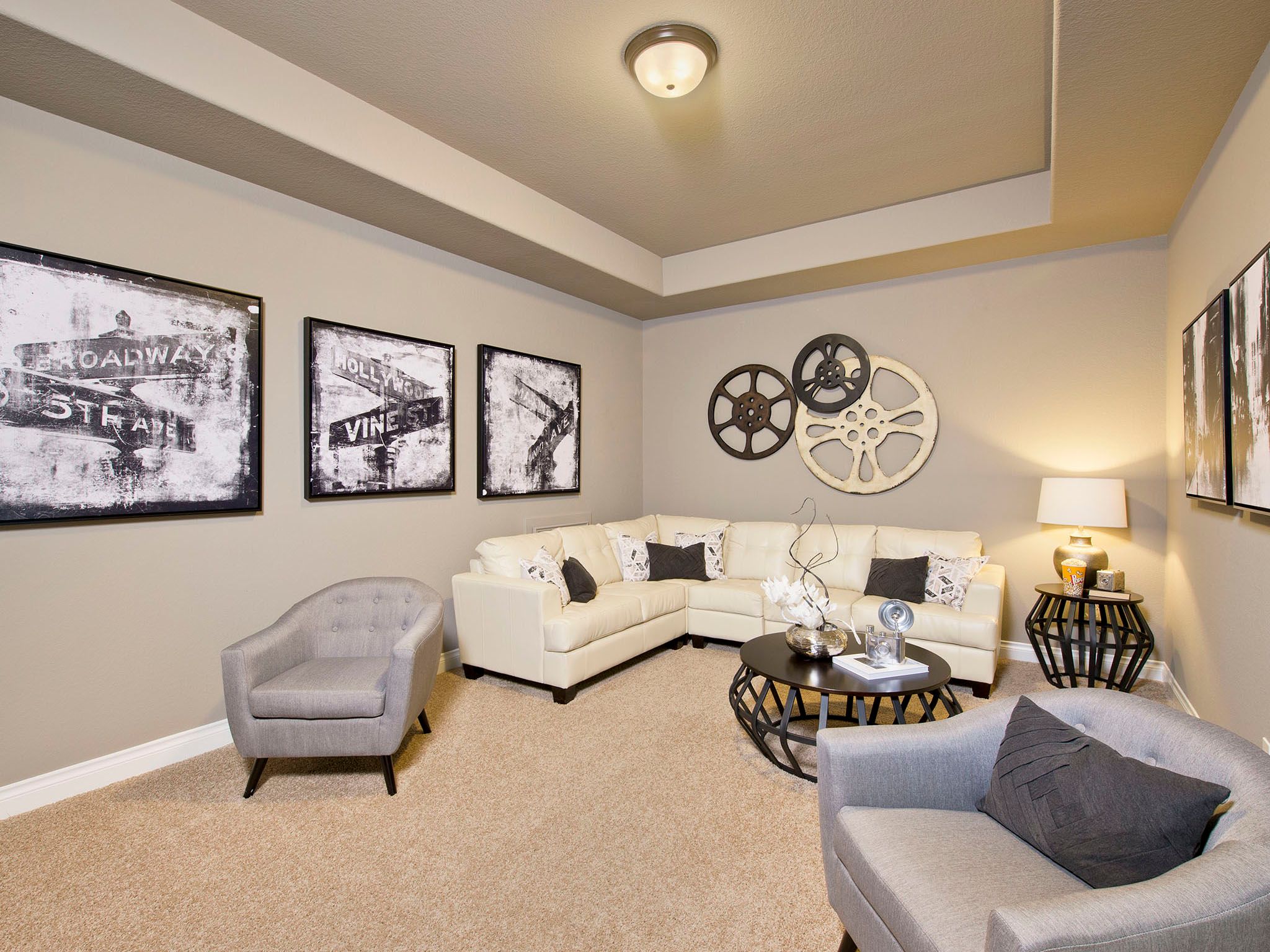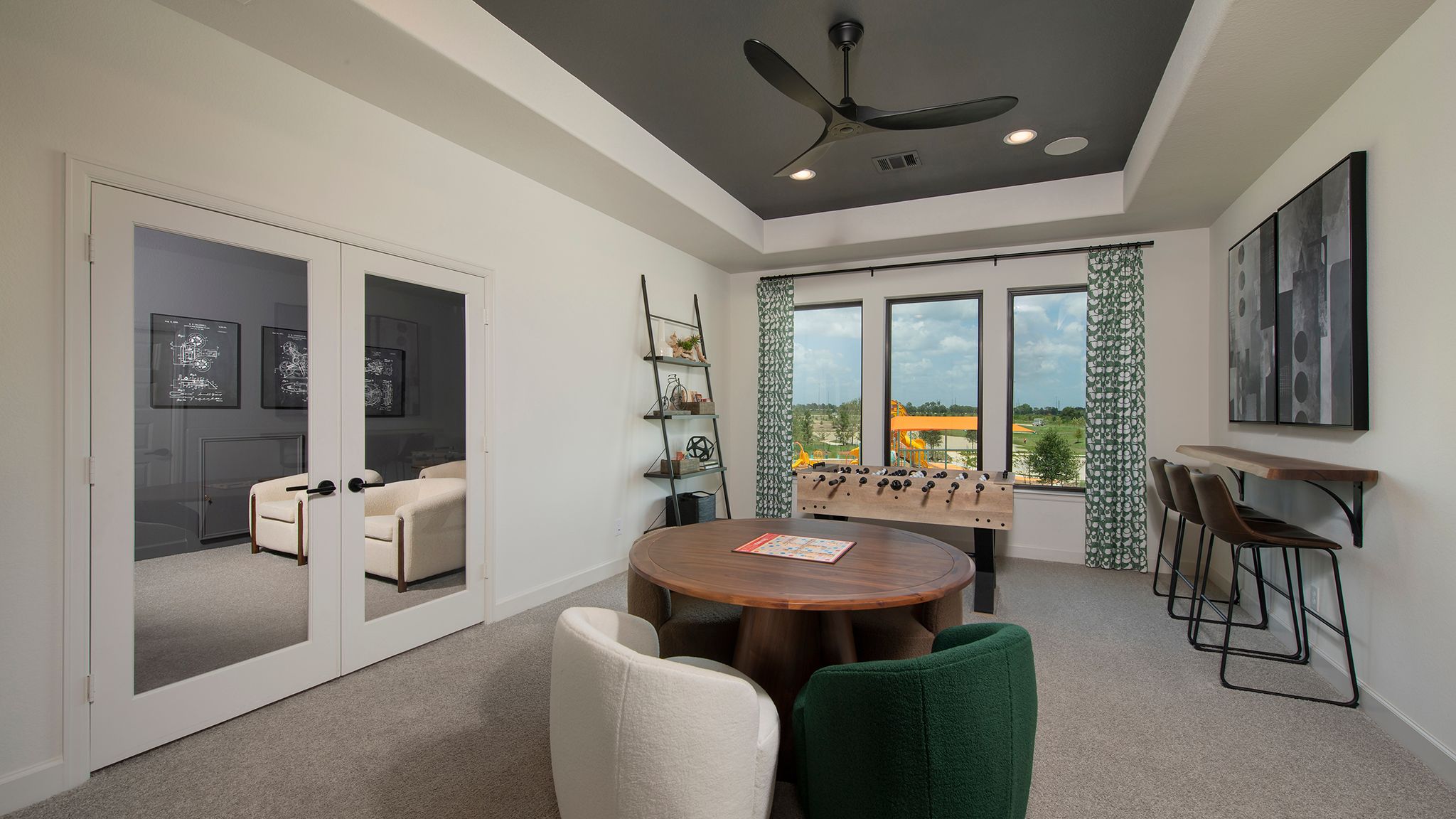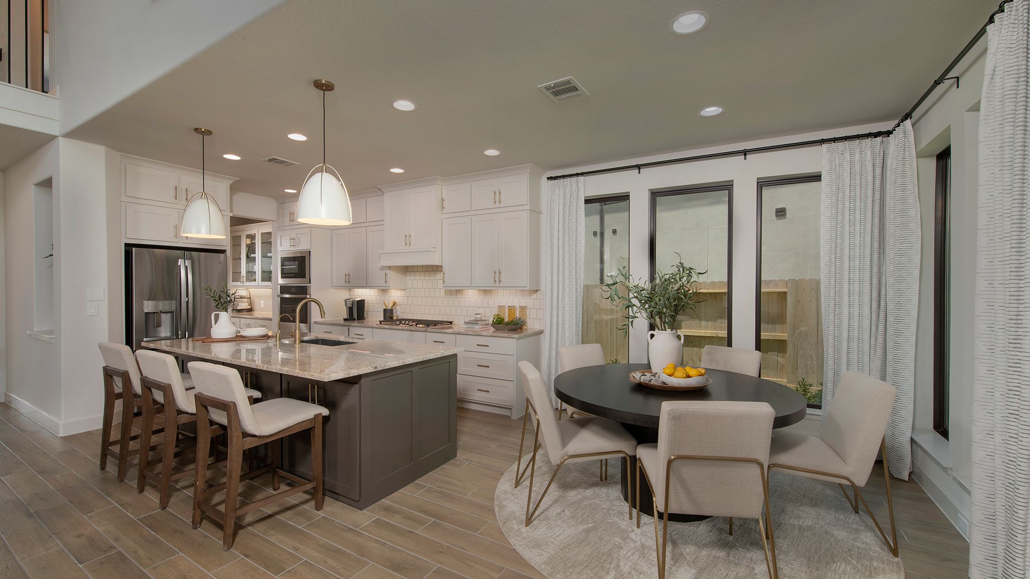 Two-story entry features curved staircase. Formal dining room and home office with French doors frame entry. Two-story family room with wall of windows opens to kitchen and morning area. Kitchen features walk-in pantry, butler's pantry and island with built-in seating space. First-floor primary suite includes bedroom with 12-foot ceiling and wall of windows. Dual vanities, corner garden tub, separate glass-enclosed shower and two walk-in closets in primary bath. A second bedroom is downstairs. A game room, Hollywood bathroom and secondary bedrooms are upstairs. Covered backyard patio. Mud room off three-car garage. Representative Images. Features and specifications may vary by community.