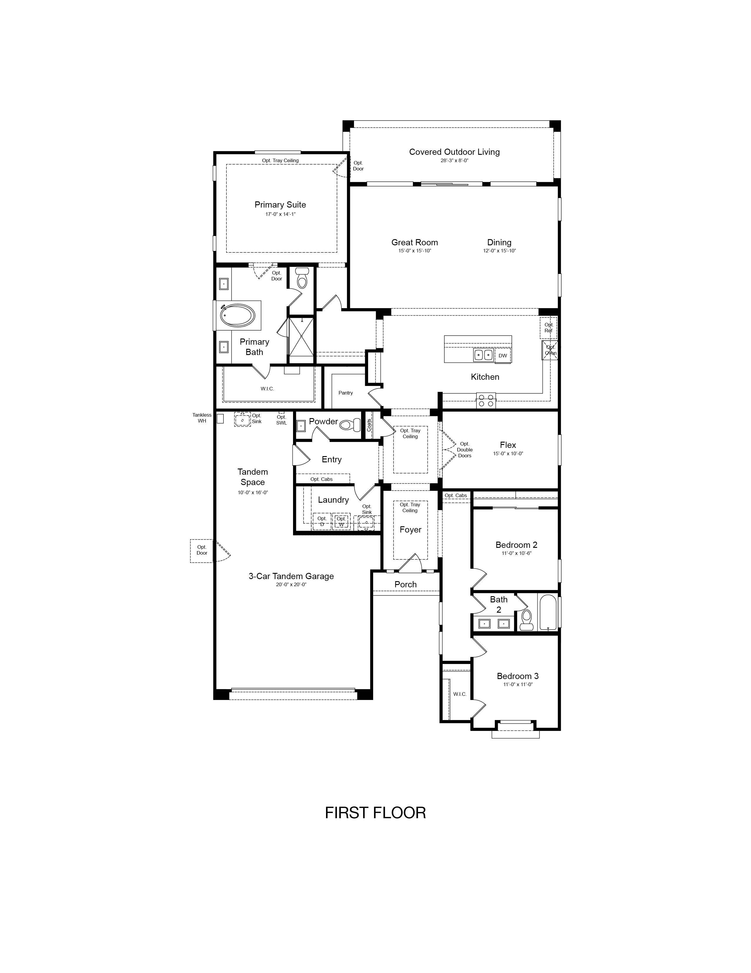 The 45-RM2 is a 1-story floor plan that comes standard with 2,379 sq. ft., 3 bedrooms, 2.5 bathrooms, and 3-car tandem garage. The foyer takes you past the secondary bedrooms and bathroom. Continuing straight, you pass the flex room and then are greeted with an open kitchen, great room, and casual dining area. The layout creates an inviting space that will be perfect for spending time with your family or hosting loved ones. The spacious primary suite is the perfect oasis. The primary bathroom has a separate tub and shower with dual vanities and a large walk-in closet.