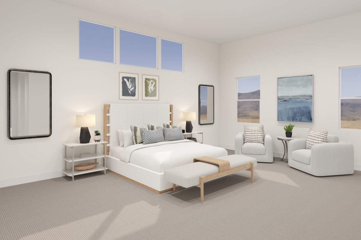 Expansive style. The Arroyo's welcoming front courtyard and covered entry flow into the inviting foyer with tray ceiling, revealing the spacious great room, dining room, and desirable large covered patio beyond. The well-equipped gourmet kitchen overlooks a bright casual dining area, and is complete with a large center island with breakfast bar, plenty of counter and cabinet space, and sizable walk-in pantry. The marvelous primary bedroom suite is highlighted by an elegant tray ceiling, private covered patio with built-in seating, enormous walk-in closet, and spa-like primary bath with dual-sink vanity, large luxe shower with drying area, and private water closet. Secondary bedrooms feature walk-in closets and shared bath with separate dual-sink vanity area. Additional highlights include a...