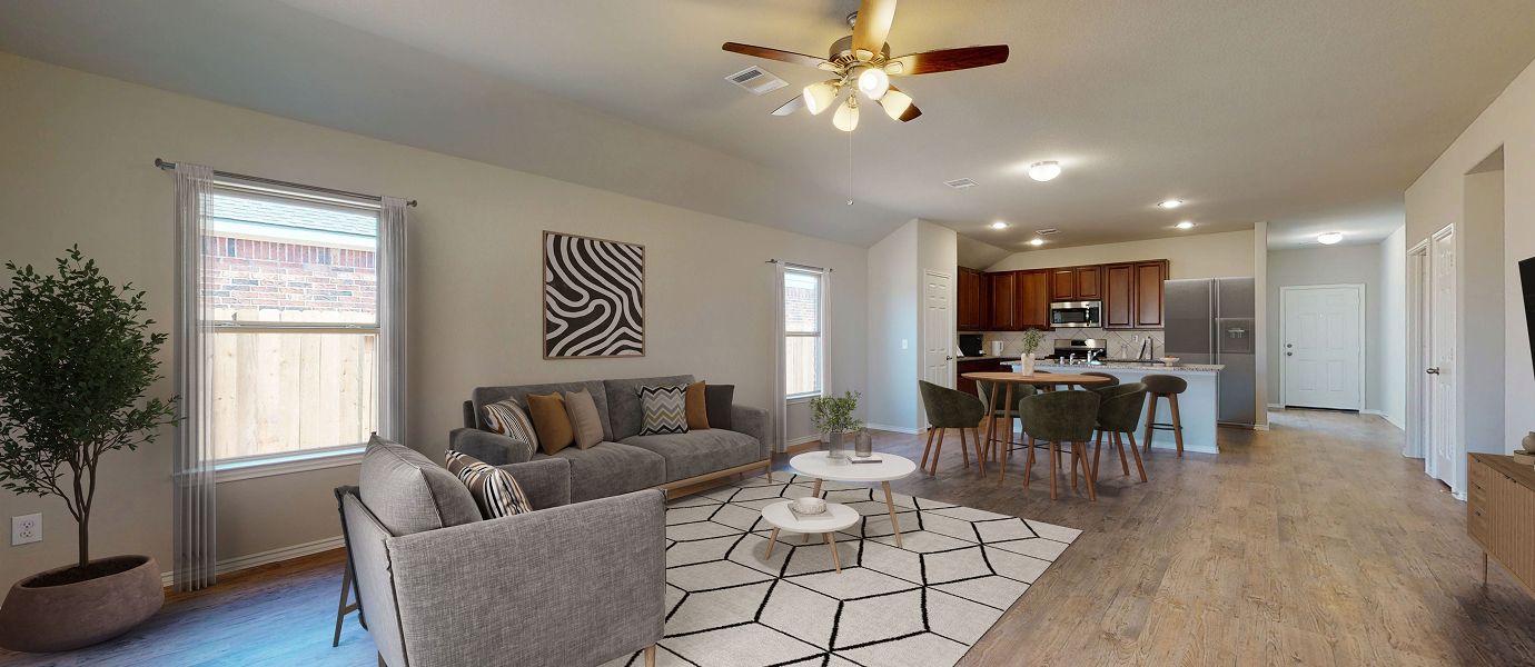 This new four-bedroom home provides convenient single-story living. A flex space is secluded off the foyer, leading to an inviting open-concept floorplan with convenient access to a covered patio. All four bedrooms are tucked away to the side, including the lavish owner’s suite at the back of the home with a full bathroom and walk-in closet.